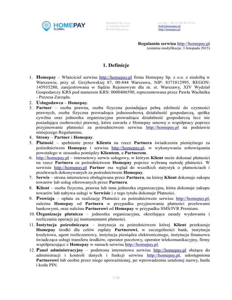 Homepay Sp. z o.o. ul. Grzybowska 87 00-844 Warszawa tel./fax: +48.22 266 85 25/24 [email protected] http://homepay.pl Regulamin serwisu http://homepay.pl (ostatnia modyfikacja: 3 listopada 2015) 1. Definicje 1. Homepay – Właściciel serwisu http://homepay.pl firma Homepay Sp. z o.o. z siedzibą w Warszawie, przy ul. Grzybowskiej 87, 00-844 Warszawa, NIP: 8371812995, REGON: 145935280, zarejestrowana w Sądzie Rejonowym dla m. st. Warszawy, XIV Wydział Gospodarczy KRS pod numerem KRS: 0000406590, reprezentowana przez Pawła Wachnika - Prezesa Zarządu. 2. Usługodawca – Homepay. 3. Partner – osoba prawna, osoba fizyczna posiadająca pełną zdolność do czynności prawnych, osoba fizyczna prowadząca jednoosobową działalność gospodarczą, spółka cywilna oraz jednostka organizacyjna prowadząca działalność gospodarczą lecz nie posiadająca osobowości prawnej, która zawarła z Homepay umowę o współpracy poprzez przyjmowanie płatności za pośrednictwem serwisu http://homepay.pl na podstawie niniejszego Regulaminu. 4. Strony – Partner i Homepay. 5. Płatność – spełnienie przez Klienta na rzecz Partnera świadczenia pieniężnego za pośrednictwem Homepay i serwisu http://homepay.pl, w wykonywaniu zobowiązania powstałego w stosunku pomiędzy Klientem, a Partnerem. 6. http://homepay.pl – internetowy serwis usługowy, w którym Klient może dokonać płatności na rzecz Partnera za pośrednictwem Homepay poprzez wybraną metodę płatności. W serwisie http://homepay.pl Partner ma wgląd do wszelkich statystyk o płatnościach i przelewach dokonywanych za pośrednictwem Homepay. 7. Serwis – strona internetowa obsługiwana przez Partnera, na której Klient dokonuje zakupu towarów lub usług oferowanych przez Partnera. 8. Klient – osoba fizyczna, prawna lub inna jednostka organizacyjna, która dokonuje zakupu towarów lub nabywa usługi w Serwisie i z tego tytułu dokonuje Płatności. 9. Prowizja – opłata za realizację Płatności za pośrednictwem serwisu http://homepay.pl, należna Homepay od Partnera w przypadku przyjmowania płatności przelewami bankowymi, oraz należna Partnerowi od Homepay w przypadku SMS/IVR Premium. 10. Organizacja płatnicza – jednostka organizacyjna, określająca zasady wydawania i rozliczania operacji jej instrumentami płatności. 11. Instytucja pośrednicząca – instytucja za pośrednictwem której Klient przekazuje Homepay środki dla celów zapłaty Partnerowi, w szczególności bank, instytucja kredytowa, agent rozliczeniowy, instytucja pieniądza elektronicznego, instytucja finansowa świadcząca usługi transferu środków, operator pocztowy, operator telekomunikacyjny, firmy współpracujące z Homepay w ramach serwisu http://homepay.pl. 12. Panel administracyjny – podstrona internetowa serwisu http://homepay.pl służąca do administracji i kontroli danych i funkcji serwisu http://homepay.pl, udostępniona Partnerowi lub osobie przez niego upoważnionej, po wprowadzeniu ustalonej nazwy, hasła i kodu PIN. 1/26 Homepay Sp. z o.o. ul. Grzybowska 87 00-844 Warszawa tel./fax: +48.22 266 85 25/24 [email protected] http://homepay.pl 13. Zwrot – ustalenie środków na rachunku bankowym Klienta, zlecane przez Partnera i wykonywane przez Homepay. 14. Chargeback – anulowanie transakcji przez wystawcę elektronicznego instrumentu płatniczego na skutek uznania zasadności reklamacji złożonej przez posiadacza elektronicznego instrumentu płatniczego. 15. URL – adres internetowy Serwisu, pod którym Partner dokonuje sprzedaży, za którą przyjmuje płatność za pośrednictwem serwisu http://homepay.pl. 16. Operator – podmiot gospodarczy świadczący usługi telekomunikacyjne na obszarze Polski na podstawie koncesji. 17. SMS (Short Message Service) – usługa umożliwiająca przesyłanie z i na telefony komórkowe krótkich wiadomości tekstowych do 160 znaków pomiędzy Operatorami. 18. SMS Premium Rate – SMS o podwyższonej opłacie - usługa umożliwiająca przesyłanie z telefonów komórkowych krótkich wiadomości tekstowych o podwyższonej opłacie za ich wysłanie. SMS Premium Rate wysyłany przez użytkownika GSM na Numer skrócony przeznaczony do obsługi danego Serwisu umożliwia korzystanie z tego Serwisu przez użytkownika. Opłata za SMS Premium Rate uzależniona jest od cenników Operatorów i Numeru skróconego. 19. Numer skrócony – specjalny numer telefoniczny GSM stworzony przez Operatorów i przeznaczony do przesyłania SMS i SMS Premium Rate. 20. SMS zwrotny – SMS wysłany przez Partnera do Klienta jako odpowiedź na SMS Premium Rate. 21. IVR (Interactive Voice Response) – nazwa systemu w telekomunikacji, umożliwiającego interaktywną obsługę osoby dzwoniącej. Serwis http://homepay.pl oferuje IVR kod płatny za połączenie. 2. Informacje ogólne §1 Http://homepay.pl jest serwisem obsługującym płatności internetowe i mikropłatności SMS/IVR Premium Rate prowadzonym przez Homepay. Niniejszy Regulamin określa zasady współpracy Stron przy udostępnianiu Klientom możliwości dokonywania płatności poprzez serwis http://homepay.pl za zakupy dokonywane w Serwisach. Usługodawca świadczy usługi zgodnie z Regulaminem. §2 Niniejszy regulamin stosuje się wyłącznie do Umowy zawartej poprzez rejestrację w serwisie http://homepay.pl pomiędzy Stronami. Regulamin nie dotyczy Partnerów, którzy podpisali osobną Umowę o współpracy z Homepay w ramach usług oferowanych w serwisie http://homepay.pl. §3 Homepay pośredniczy w przekazywaniu płatności i mikropłatności SMS/IVR pomiędzy Klientem, a Partnerem. 2/26 Homepay Sp. z o.o. ul. Grzybowska 87 00-844 Warszawa tel./fax: +48.22 266 85 25/24 [email protected] http://homepay.pl §4 Zawarcie Umowy na podstawie niniejszego Regulaminu nie wymaga pisemnego podpisania przez Strony Umowy. Zawarcie Umowy następuje poprzez rejestrację w serwisie http://homepay.pl z zastrzeżeniem do Zał. 1 Ust. 2 §11. §5 Czynności dok