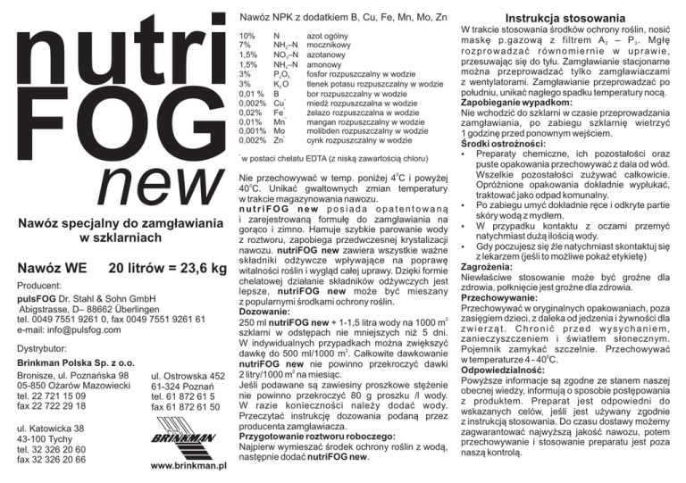 nutri FOG new Nawóz specjalny do zamgławiania w szklarniach Nawóz WE 20 litrów = 23,6 kg Producent: pulsFOG Dr. Stahl & Sohn GmbH Abigstrasse, D– 88662 Überlingen tel. 0049 7551 9261 0, fax 0049 7551 9261 61 e-mail: [email protected] Dystrybutor: Brinkman Polska Sp. z o.o. Bronisze, ul. Poznańska 98 05-850 Ożarów Mazowiecki tel. 22 721 15 09 fax 22 722 29 18 ul. Katowicka 38 43-100 Tychy tel. 32 326 20 60 fax 32 326 20 66 ul. Ostrowska 452 61-324 Poznań tel. 61 872 61 5 fax 61 872 61 50 www.brinkman.pl Nawóz NPK z dodatkiem B, Cu, Fe, Mn, Mo, Zn 10% 7% 1,5% 1,5% 3% 3% 0,01 % 0,002% 0,02% 0,01% 0,001% 0,002% * N NH2–N NO3–N NH4–N P2O5 K2 O B Cu* Fe* Mn* Mo Zn* azot ogólny mocznikowy azotanowy amonowy fosfor rozpuszczalny w wodzie tlenek potasu rozpuszczalny w wodzie bor rozpuszczalny w wodzie miedź rozpuszczalna w wodzie żelazo rozpuszczalna w wodzie mangan rozpuszczalny w wodzie molibden rozpuszczalny w wodzie cynk rozpuszczalny w wodzie w postaci chelatu EDTA (z niską zawartością chloru) Nie przechowywać w temp. poniżej 40C i powyżej 400C. Unikać gwałtownych zmian temperatury w trakcie magazynowania nawozu. nutriFOG new posiada opatentowaną i zarejestrowaną formułę do zamgławiania na gorąco i zimno. Hamuje szybkie parowanie wody z roztworu, zapobiega przedwczesnej krystalizacji nawozu. nutriFOG new zawiera wszystkie ważne składniki odżywcze wpływające na poprawę witalności roślin i wygląd całej uprawy. Dzięki formie chelatowej działanie składników odżywczych jest lepsze, nutriFOG new może być mieszany z popularnymi środkami ochrony roślin. Dozowanie: 250 ml nutriFOG new + 1-1,5 litra wody na 1000 m2 szklarni w odstępach nie mniejszych niż 5 dni. W indywidualnych przypadkach można zwiększyć dawkę do 500 ml/1000 m2. Całkowite dawkowanie nutriFOG new nie powinno przekroczyć dawki 2 litry/1000 m2 na miesiąc. Jeśli podawane są zawiesiny proszkowe stężenie nie powinno przekroczyć 80 g proszku /l wody. W razie konieczności należy dodać wody. Przeczytać instrukcję dozowania podaną przez producenta zamgławiacza. Przygotowanie roztworu roboczego: Najpierw wymieszać środek ochrony roślin z wodą, następnie dodać nutriFOG new. Instrukcja stosowania W trakcie stosowania środków ochrony roślin, nosić maskę p.gazową z filtrem A 2 – P 3 . Mgłę rozprowadzać równomiernie w uprawie, przesuwając się do tyłu. Zamgławianie stacjonarne można przeprowadzać tylko zamgławiaczami z wentylatorami. Zamgławianie przeprowadzać po południu, unikać nagłego spadku temperatury nocą. Zapobieganie wypadkom: Nie wchodzić do szklarni w czasie przeprowadzania zamgławiania, po zabiegu szklarnię wietrzyć 1 godzinę przed ponownym wejściem. Środki ostrożności: Preparaty chemiczne, ich pozostałości oraz puste opakowania przechowywać z dala od wód. Wszelkie pozostałości zużywać całkowicie. Opróżnione opakowania dokładnie wypłukać, traktować jako odpad komunalny. Po zabiegu umyć dokładnie ręce i odkryte partie skóry wodą z mydłem. W przypadku kontaktu z oczami przemyć natychmiast dużą ilością wody. Gdy poczujesz się źle natychmiast skontaktuj się z lekarzem (jeśli to możliwe pokaż etykietę) Zagrożenia: Niewłaściwe stosowanie może być groźne dla zdrowia, połknięcie jest groźne dla zdrowia. Przechowywanie: Przechowywać w oryginalnych opakowaniach, poza zasięgiem dzieci, z daleka od jedzenia i żywności dla zwierząt. Chronić przed wysychaniem, zanieczyszczeniem i światłem słonecznym. Pojemnik zamykać szczelnie. Przechowywać w temperaturze 4 - 400C. Odpowiedzialność: Powyższe informacje są zgodne ze stanem naszej obecnej wiedzy, informują o sposobie postępowania z produktem. Preparat jest odpowiedni do wskazanych celów, jeśli jest używany zgodnie z instrukcją stosowania. Do czasu dostawy możemy zagwarantować najwyższą jakość nawozu, potem przechowywanie i stosowanie preparatu jest poza naszą kontrolą.