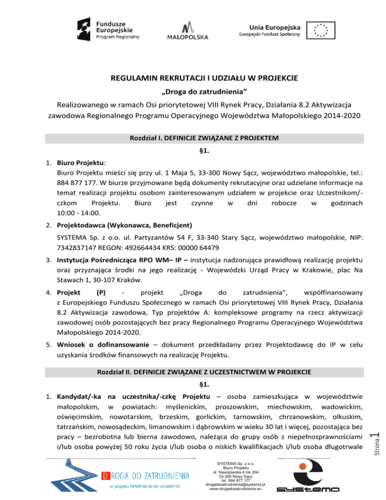 REGULAMIN REKRUTACJI I UDZIAŁU W PROJEKCIE „Droga do zatrudnienia” Realizowanego w ramach Osi priorytetowej VIII Rynek Pracy, Działania 8.2 Aktywizacja zawodowa Regionalnego Programu Operacyjnego Województwa Małopolskiego 2014-2020 Rozdział I. DEFINICJE ZWIĄZANE Z PROJEKTEM §1. 1. Biuro Projektu: Biuro Projektu mieści się przy ul. 1 Maja 5, 33-300 Nowy Sącz, województwo małopolskie, tel.: 884 877 177. W biurze przyjmowane będą dokumenty rekrutacyjne oraz udzielane informacje na temat realizacji projektu osobom zainteresowanym udziałem w projekcie oraz Uczestnikom/czkom Projektu. Biuro jest czynne w dni robocze w godzinach 10:00 - 14:00. 2. Projektodawca (Wykonawca, Beneficjent) SYSTEMA Sp. z o.o. ul. Partyzantów 54 F, 33-340 Stary Sącz, województwo małopolskie, NIP: 7342837147 REGON: 492664434 KRS: 00000 64479 3. Instytucja Pośrednicząca RPO WM– IP – instytucja nadzorująca prawidłową realizację projektu oraz przyznająca środki na jego realizację - Wojewódzki Urząd Pracy w Krakowie, plac Na Stawach 1, 30-107 Kraków. 4. Projekt (P) projekt „Droga do zatrudnienia”, współfinansowany z Europejskiego Funduszu Społecznego w ramach Osi priorytetowej VIII Rynek Pracy, Działania 8.2 Aktywizacja zawodowa, Typ projektów A: kompleksowe programy na rzecz aktywizacji zawodowej osób pozostających bez pracy Regionalnego Programu Operacyjnego Województwa Małopolskiego 2014-2020. 5. Wniosek o dofinansowanie – dokument przedkładany przez Projektodawcę do IP w celu uzyskania środków finansowych na realizację Projektu. Rozdział II. DEFINICJE ZWIĄZANE Z UCZESTNICTWEM W PROJEKCIE nr projektu RPMP.08.02.00-12-0287/15 SYSTEMA Sp. z o.o. Biuro Projektu ul. Nawojowska 4 lok 204 33-300 Nowy Sącz tel. 884 877 177 [email protected] www.drogadozatrudnienia.eu Strona 1. Kandydat/-ka na uczestnika/-czkę Projektu – osoba zamieszkująca w województwie małopolskim, w powiatach: myślenickim, proszowskim, miechowskim, wadowickim, oświęcimskim, nowotarskim, brzeskim, gorlickim, tarnowskim, chrzanowskim, olkuskim, tatrzańskim, nowosądeckim, limanowskim i dąbrowskim w wieku 30 lat i więcej, pozostająca bez pracy – bezrobotna lub bierna zawodowo, należąca do grupy osób z niepełnosprawnościami i/lub osoba powyżej 50 roku życia i/lub osoba o niskich kwalifikacjach i/lub osoba długotrwale 1 §1. bezrobotna i/lub kobieta, która złożyła dokumenty rekrutacyjne do Projektu, odbyła rozmowę z personelem projektu i oczekuje na informację o zakwalifikowaniu do udziału w projekcie bądź otrzymaniu decyzji odmownej. 2. Osoba bierna zawodowo – osoba, która w danej chwili nie tworzy zasobów siły roboczej (tzn. nie pracuje i nie jest bezrobotna). Osoba będąca na urlopie wychowawczym (rozumianym, jako nieobecność w pracy, spowodowana opieka nad dzieckiem w okresie, który nie mieści się w ramach urlopu macierzyńskiego lub urlopu rodzicielskiego), uznawana jest za bierną zawodowo, chyba, że jest zarejestrowana już, jako bezrobotna (wówczas status bezrobotnego ma pierwszeństwo). Osoba prowadząca działalność na własny rachunek (w tym członek rodziny bezpłatnie pomagający osobie prowadzącej działalność) nie jest uznawana za bierną zawodowo. Studenci studiów stacjonarnych uznawani są za osoby bierne zawodowo. 3. Osoba bezrobotna – osoba pozostająca bez pracy, gotowa do podjęcia pracy i aktywnie poszukująca zatrudnienia. Definicja uwzględnia osoby zarejestrowane, jako bezrobotne zgodnie z krajowymi definicjami nawet, jeżeli nie spełniają one wszystkich trzech kryteriów. Studenci studiów stacjonarnych uznawani są za osoby bierne zawodowo, nawet, jeśli spełniają kryteria dla bezrobotnych zgodnie z ww. definicją. Osoby kwalifikujące się do urlopu macierzyńskiego lub rodzicielskiego, które są bezrobotne w rozumieniu niniejszej definicji (nie pobierają świadczeń z tytułu urlopu), należy wykazywać, jako osoby bezrobotne. nr projektu RPMP.08.02.00-12-0287/15 SYSTEMA Sp. z o.o. Biuro Projektu ul. Nawojowska 4 lok 204 33-300 Nowy Sącz tel. 884 877 177 [email protected] www.drogadozatrudnienia.eu Strona 5. Osoba niepełnosprawna: a. osoba niepełnosprawna w świetle przepisów ustawy z dnia 27 sierpnia 1997 r. o rehabilitacji zawodowej i społecznej oraz zatrudnieniu osób niepełnosprawnych (Dz.U. 2011 nr 127 poz. 721, z późn. zm.), których niepełnosprawność została potwierdzona orzeczeniem: 1) o zakwalifikowaniu przez organy orzekające do jednego z trzech stopni niepełnosprawności określonych w art. 3 lub 2) o całkowitej lub częściowej niezdolności do pracy na podstawie odrębnych przepisów, lub 3) o niepełnosprawności, wydanym przed ukończeniem 16 roku życia; b. osoba z zaburzeniami psychicznymi, o których mowa w ustawie z dnia 19 sierpnia 1994 r. o ochronie zdrowia psychicznego (Dz. U. 2011 nr 231, poz. 1375), których niepełnosprawność została potwierdzona dokumentem poświadczającym stan zdrowia przez lekarza – orzeczenie o stanie zdrowia lub opinia, tj. osoby: 1) chore psychicznie (wykazującej zaburzenia psychotyczne), 2) upośledzone umysłowo, 3) wykazujące inne zakłócenia czynności psychicznych, które zgodnie ze stanem wiedzy medycznej zaliczane są do zaburzeń psychicznych, a osoba ta wymaga świadczeń zdrowotnych lub innych form pomocy i opieki niezbędnych do życia w środowisku rodzinnym lub społecznym. 2 4. Osoba długotrwale bezrobotna — dorośli (osoby w wieku 30 lat lub więcej) – osoby bezrobotne nieprzerwanie przez okres ponad 12 miesięcy. 6. Osoba o niskich kwalifikacjach – posiadająca wykształcenie na poziomie do ISCED 3 włącznie (Międzynarodowa Standardowa Klasyfikacja Kształcenia), tj. wykształcenie podstawowe, gimnazjalne i ponadgimnazjalne (średnie). 7. Osoba zależna – zgodnie z Ustawą o promocji zatrudnienia i instytucjach rynku pracy z dnia 20 kwietnia 2004 r. (Dz. U. z 2015 r. poz. 149, z późn. zm.), uznaje się osobę wymag