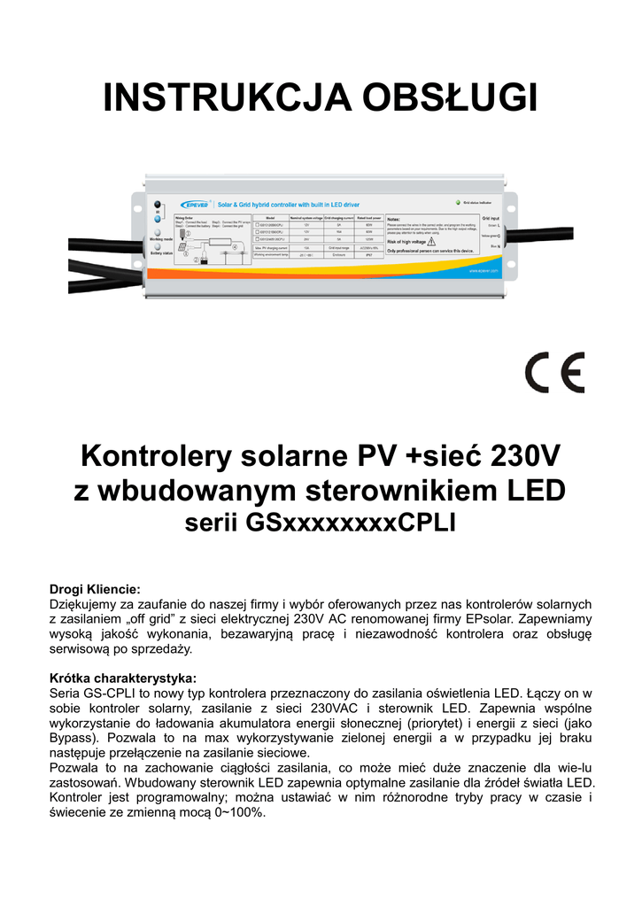 INSTRUKCJA OBSŁUGI Kontrolery solarne PV +sieć 230V z wbudowanym sterownikiem LED serii GSxxxxxxxxCPLI Drogi Kliencie: Dziękujemy za zaufanie do naszej firmy i wybór oferowanych przez nas kontrolerów solarnych z zasilaniem „off grid” z sieci elektrycznej 230V AC renomowanej firmy EPsolar. Zapewniamy wysoką jakość wykonania, bezawaryjną pracę i niezawodność kontrolera oraz obsługę serwisową po sprzedaży. Krótka charakterystyka: Seria GS-CPLI to nowy typ kontrolera przeznaczony do zasilania oświetlenia LED. Łączy on w sobie kontroler solarny, zasilanie z sieci 230VAC i sterownik LED. Zapewnia wspólne wykorzystanie do ładowania akumulatora energii słonecznej (priorytet) i energii z sieci (jako Bypass). Pozwala to na max wykorzystywanie zielonej energii a w przypadku jej braku następuje przełączenie na zasilanie sieciowe. Pozwala to na zachowanie ciągłości zasilania, co może mieć duże znaczenie dla wie-lu zastosowań. Wbudowany sterownik LED zapewnia optymalne zasilanie dla źródeł światła LED. Kontroler jest programowalny; można ustawiać w nim różnorodne tryby pracy w czasie i świecenie ze zmienną mocą 0~100%. 1. Właściwości Wspólne zasilanie energią słoneczną i z sieci energetycznej Specjalnie zaprojektowany do źródeł światła LED, wbudowany sterownik LED z funkcją BOOSTER Źródło zasilania dużej mocy zapewniające stabilne i długotrwałe uzyskiwanie znamionowych parametrów wyjścia. Zapewnia to stabilne warunki pracy obciążeniu Kontroler bez przycisków, programowany poprzez aplikację mobilną APP (android) lub zdalnym pilotem SPP-02 z funkcją podczerwieni (pilot należy najpierw zaprogramować z poziomu PC) Cyfrowa precyzyjna regulacja stało-prądowa z dokładnością sterowania ± 2% Max efektywność 96% Funkcja ściemniania oświetlenia Różnorodne tryby załączania oświetlenia Rejestracja kalkulacji mocy rozładowania i statystyk zużycia energii w czasie rzeczywistym Kompensacja temperaturowa akumulatora Zaawansowana ochrona elektroniczna W pełni chroniony przed wpływem środowiska (IP 68) Obudowa ze stopów aluminium dla lepszego chłodzenia 2. Opis wyrobu i podłączenie do instalacji Wygląd kontrolera Schemat podłączenia 2 Kolejność podłączenia 1. Podłączyć lampę LED Sprawdzić czy lampa posiada swoje wewnętrzne zabezpieczenie (bezpiecznik) 2. Podłączyć akumulator UWAGA: Podłączyć szeregowo bezpiecznik. Bezpiecznik obwodu akumulatora powinien być 1,25~2 razy większy od prądu znamionowego. Odległość od akumulatora nie powinna być większa niż 15cm 3. Podłączyć panel PV Obwód panelu powinien mieć rozłącznik albo 2 rozłączane bezpieczniki o wartości 1,25x prąd znamionowy 4. Podłączyć sieć 230V AC (instalacja 1P3W) OSTROŻNIE: Ryzyko porażenia elektrycznego. Należy pamiętać, że w przewodzie sieciowym istnieje niebezpieczne napięcie przemienne 230V AC. Zalecamy zastosowanie rozłącznika (1P3W – 10A) Kontroler podłączony do instalacji – rozpoczęcie pracy Po podłączeniu zasilania do kontrolera sprawdzić wskaźnik akumulatora. Powinien on świecić intensywnie zielonym kolorem. Jeżeli nie to należy odnieść się do rozdziału 7 OSTROŻNIE: Ryzyko porażenia elektrycznego. W kontrolerze wbudowany jest wydajny sterownik prądowy LED. W pewnych warunkach wyjściowe napięcie z kontrolera może stać się niebezpieczne dla człowieka. Warunki do załączenia zasilania z sieci a. Ładowanie z paneli PV jest niemożliwe b. W podłączonej do kontrolera sieci elektrycznej jest normalne napięcie c. Napięcie akumulatora jest mniejsze od obniżonego napięcia ostrzegania UWAGA: Napięcie sieci nie zostanie aktywowane, jeżeli nie zostaną spełnione te 3 warunki. Gdy rozpocznie się znowu ładowanie z paneli PV, to zasilanie z sieci zostanie automatycznie odłączone 3. Wskaźniki LED Wskaźnik LED Kolor Status Opis znaczenia Zielony Świeci mocno Podłączenie PV w porządku ale niskie napięcie (irradiancja) z PV, nie ma ładowania Zielony Nie świeci Brak słońca lub złe podłączenie Zielony Powoli błyska Ładowanie Zielony Szybko błyska Odwrotna polaryzacja paneli PV Pomarańczowy Świeci mocno Załączona ładowarka sieciowa ale istnieje niskie napięcie (irradiancja) z PV, nie ma ładowania Czerwony Świeci mocno Załączona ładowarka sieciowa – aktywna Zielony Świeci mocno Stan normalny Zielony Powoli błyska Pełne naładowanie Zielony Szybko błyska Zawyżone napięcie Pomarańczowy Świeci mocno Zaniżone napięcie Czerwony Świeci mocno Nadmierne rozładowanie Czerwony Powoli błyska Przegrzanie akumulatora Zielony Świeci mocno Wejście z sieci – stan normalny Zielony Nie świeci Brak wejścia z sieci lub nienormalny sygnał Gdy jednocześnie błyskają: LED trybu pracy (na pomarańczowo) i LED statusu akumulatora (na czerwono) oznacza to błąd napięcia systemowego 3 4. Tryby pracy obciążenia 1. Tryb manualny 2. Załączanie/wyłączanie regulowane stanem oświetlenia zewnętrznego (domyślne) 3. Stan oświetlenia + Stoper Stan oświetlenia + Stoper 1 Stan oświetlenia + Stoper 2 4 Domyślne ustawienia # Opis Zakres ustawień Tryb 1 Tryb 2 Prąd znamionowy LED 0,35A 0,35A Stoper 1 (czas) Prąd LED w procentach prądu znamionowego 2h 100% 1h 100% 00:00~23:59 h 0~100% Stoper 2 (czas) Prąd LED w procentach prądu znamionowego 2h 80% 1h 50% 00:00~23:59 h 0~100% Stoper 3 (czas) Prąd LED w procentach prądu znamionowego 2h 50% 2h 100% 00:00~23:59 h 0~100% 0~4A # wartości domyślne ustawień mogą być ustalane w zależności od potrzeb użytkownika 4. Zarządzane czasem rzeczywistym Załączanie/wyłączanie regulowane w czasie rzeczywistym 5. Zarządzane monitorowaniem obniżonego napięcia akumulatora Gdy napięcie akumulatora jest obniżone kontroler automatycznie zmniejsza % wartość prądu wyjściowego (w stosunku do prądu znamionowego). Powrót do normalnego trybu nastąpi po wzroście napięcia akumulatora do napięcia powrotnego 