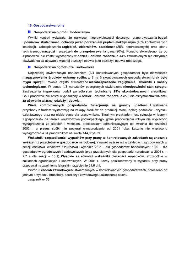 16. Gospodarstwa rolne Gospodarstwa o profilu hodowlanym Wyniki kontroli wskazały, że najwięcej nieprawidłowości dotyczyło: przeprowadzania badań i pomiarów skuteczności ochrony przed porażeniem prądem elektrycznym (40% kontrolowanych instalacji), zabezpieczania zagłębień, zbiorników, studzienek (25% kontrolowanych) oraz stanu technicznego narzędzi i urządzeń do przygotowywania pasz (20%). Ponadto stwierdzono, że co 4 pracownik nie został wyposażony w odzież i obuwie robocze, a 44% zatrudnionych nie otrzymało ekwiwalentu za używanie własnej odzieży i obuwia jako odzieży i obuwia roboczego. Gospodarstwa ogrodnicze i sadownicze Najczęściej stwierdzanym naruszeniem (3/4 kontrolowanych gospodarstw) było niewłaściwe magazynowanie środków ochrony roślin; w 3 na 5 skontrolowanych gospodarstwach brak było myjni sprzętu, równie często stwierdzano niezabezpieczone zagłębienia, zbiorniki i kanały technologiczne. W ponad 1/3 warsztatów podręcznych stwierdzono nieodpowiedni stan sprzętu. Zastrzeżenia inspektorów budził ponadto stan techniczny 29% skontrolowanych ciągników. Co 7 pracownik nie został wyposażony w odzież i obuwie robocze, a co 6 nie otrzymał ekwiwalentu za używanie własnej odzieży i obuwia. Wiele kontrolowanych gospodarstw funkcjonuje na granicy upadłości. Uzyskiwane przychody z trudem wystarczają na zakupy środków do produkcji rolnej, opłatę podatków i czynszu dzierżawnego oraz na niskie płace dla pracowników. Skrajnym przykładem jest sytuacja w jednym z gospodarstw na terenie województwa podkarpackiego, gdzie pracownikom rolnym nie wypłacono wynagrodzenia za sierpień i wrzesień, pracownikom administracyjnym od kwietnia do września 2002 r., a prezes spółki nie pobierał wynagrodzenia od 2001 roku. Łącznie nie wypłacono wynagrodzenia 34 pracownikom na kwotę 144,8 tys. zł. Wskaźniki częstotliwości wypadków przy pracy w kontrolowanych zakładach są znacznie wyższe niż przeciętne w gospodarce narodowej, a nawet wyższe niż w zakładach zgrupowanych w sekcji: rolnictwo, leśnictwo i łowiectwo i wynoszą 23,2 – dla gospodarstw hodowlanych; 13,9 – dla gospodarstw ogrodniczych i sadowniczych (przy przeciętnych dla gospodarki narodowej w 2001 r. – 7,7 a dla sekcji – 10,1). Wysokie są również wskaźniki ciężkości wypadków, szczególnie w zakładach ogrodniczych i sadowniczych. W 2001 r. każdy poszkodowany w wypadku przy pracy przebywał na zwolnieniu lekarskim przeciętnie 51,6 dni. Wśród 3 chorób zawodowych, stwierdzonych w kontrolowanych gospodarstwach, orzeczono po jednym przypadku brucelozy, boreliozy i zawodowego uszkodzenia słuchu. załącznik nr 33