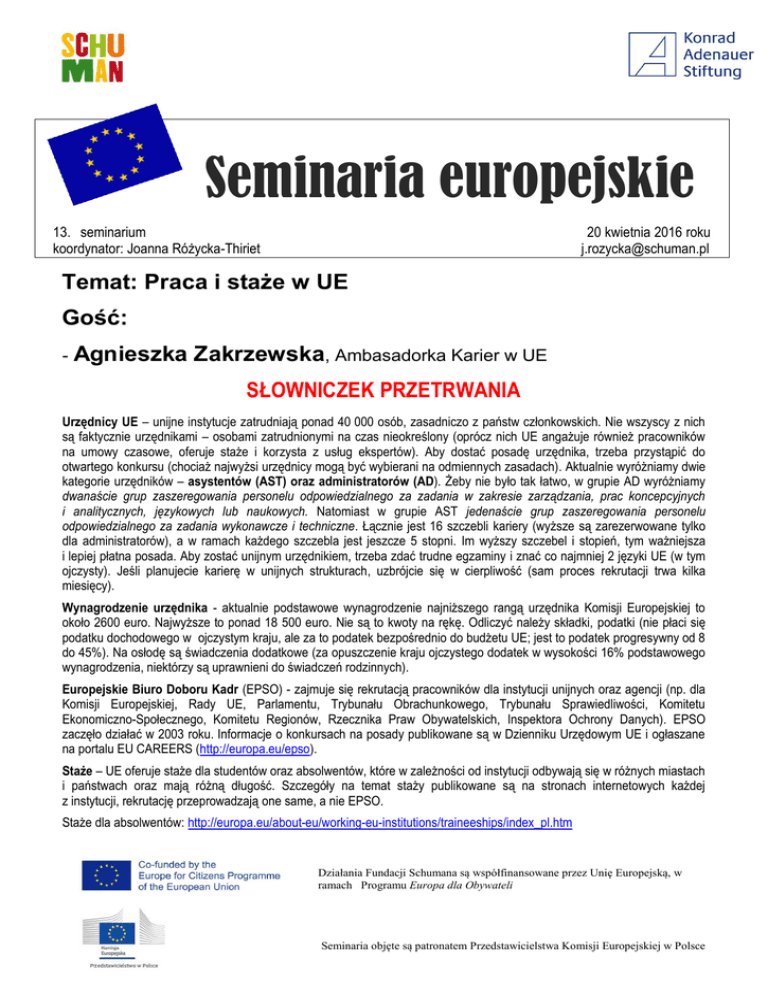 Seminaria europejskie 13. seminarium koordynator: Joanna Różycka-Thiriet 20 kwietnia 2016 roku [email protected] Temat: Praca i staże w UE Gość: - Agnieszka Zakrzewska, Ambasadorka Karier w UE SŁOWNICZEK PRZETRWANIA Urzędnicy UE – unijne instytucje zatrudniają ponad 40 000 osób, zasadniczo z państw członkowskich. Nie wszyscy z nich są faktycznie urzędnikami – osobami zatrudnionymi na czas nieokreślony (oprócz nich UE angażuje również pracowników na umowy czasowe, oferuje staże i korzysta z usług ekspertów). Aby dostać posadę urzędnika, trzeba przystąpić do otwartego konkursu (chociaż najwyżsi urzędnicy mogą być wybierani na odmiennych zasadach). Aktualnie wyróżniamy dwie kategorie urzędników – asystentów (AST) oraz administratorów (AD). Żeby nie było tak łatwo, w grupie AD wyróżniamy dwanaście grup zaszeregowania personelu odpowiedzialnego za zadania w zakresie zarządzania, prac koncepcyjnych i analitycznych, językowych lub naukowych. Natomiast w grupie AST jedenaście grup zaszeregowania personelu odpowiedzialnego za zadania wykonawcze i techniczne. Łącznie jest 16 szczebli kariery (wyższe są zarezerwowane tylko dla administratorów), a w ramach każdego szczebla jest jeszcze 5 stopni. Im wyższy szczebel i stopień, tym ważniejsza i lepiej płatna posada. Aby zostać unijnym urzędnikiem, trzeba zdać trudne egzaminy i znać co najmniej 2 języki UE (w tym ojczysty). Jeśli planujecie karierę w unijnych strukturach, uzbrójcie się w cierpliwość (sam proces rekrutacji trwa kilka miesięcy). Wynagrodzenie urzędnika - aktualnie podstawowe wynagrodzenie najniższego rangą urzędnika Komisji Europejskiej to około 2600 euro. Najwyższe to ponad 18 500 euro. Nie są to kwoty na rękę. Odliczyć należy składki, podatki (nie płaci się podatku dochodowego w ojczystym kraju, ale za to podatek bezpośrednio do budżetu UE; jest to podatek progresywny od 8 do 45%). Na osłodę są świadczenia dodatkowe (za opuszczenie kraju ojczystego dodatek w wysokości 16% podstawowego wynagrodzenia, niektórzy są uprawnieni do świadczeń rodzinnych). Europejskie Biuro Doboru Kadr (EPSO) - zajmuje się rekrutacją pracowników dla instytucji unijnych oraz agencji (np. dla Komisji Europejskiej, Rady UE, Parlamentu, Trybunału Obrachunkowego, Trybunału Sprawiedliwości, Komitetu Ekonomiczno-Społecznego, Komitetu Regionów, Rzecznika Praw Obywatelskich, Inspektora Ochrony Danych). EPSO zaczęło działać w 2003 roku. Informacje o konkursach na posady publikowane są w Dzienniku Urzędowym UE i ogłaszane na portalu EU CAREERS (http://europa.eu/epso). Staże – UE oferuje staże dla studentów oraz absolwentów, które w zależności od instytucji odbywają się w różnych miastach i państwach oraz mają różną długość. Szczegóły na temat staży publikowane są na stronach internetowych każdej z instytucji, rekrutację przeprowadzają one same, a nie EPSO. Staże dla absolwentów: http://europa.eu/about-eu/working-eu-institutions/traineeships/index_pl.htm Działania Fundacji Schumana są współfinansowane przez Unię Europejską, w ramach Programu Europa dla Obywateli Seminaria objęte są patronatem Przedstawicielstwa Komisji Europejskiej w Polsce Staże dla studentów: http://europa.eu/about-eu/working-eu-institutions/students/index_pl.htm Siedziby instytucji, agencji i innych organów UE – wybierając się do pracy czy na staż do unijnych instytucji, agencji i innych organów należy pamiętać, że nie wszystkie są ulokowane w Brukseli. W belgijskiej stolicy znajduje się siedziba Komisji Europejskiej, Rady Europejskiej i Rady UE, Komitetu Ekonomiczno-Społecznego i Komitetów Regionów. Parlament Europejski obraduje w Brukseli i Strasburgu. Komisje parlamentarne mieszczą się w Brukseli, a sekretariat w Luksemburgu. W tym ostatnim mieści się także Europejski Bank Inwestycyjny, Trybunał Obrachunkowy (unijny NIK) czy Trybunał Sprawiedliwości Unii Europejskiej. Siedziby kilkudziesięciu agencji porozrzucane są po całej Unii. Np. Agencja Środowiska mieści się w Kopenhadze, Europejskie Centrum Monitorowania Narkotyków i Narkomanii w Lizbonie, Europejska Agencja Praw Podstawowych w Wiedniu, Europol w Hadze, a zajmujący się bezpieczeństwem za zewnętrznych granicach FRONTEX w Warszawie. DOBRZE POWIEDZIANE – FRAZA DNIA Art. 11 ust. 1 Regulaminu pracowniczego urzędników Unii Europejskiej Urzędnik przy wykonywaniu swoich obowiązków i w swoim postępowaniu musi kierować się wyłącznie interesem Unii. Nie może on zwracać się o instrukcje ani przyjmować instrukcji od jakiegokolwiek rządu, organu, organizacji lub osoby spoza instytucji, w której pracuje. Urzędnik musi pełnić swoje obowiązki w sposób obiektywny, bezstronny oraz w poszanowaniu obowiązku zachowania lojalności wobec Unii. Art. 27 ust. 1 Regulaminu pracowniczego urzędników Unii Europejskiej Przy naborze dąży się do pozyskania do służby urzędników spełniających najwyższe wymogi w zakresie kwalifikacji, wydajności i uczciwości, rekrutowanych spośród obywateli państw członkowskich Unii z uwzględnieniem jak najszerszego zasięgu geograficznego. Żadne stanowiska nie mogą być rezerwowane dla obywateli jakiegokolwiek konkretnego państwa członkowskiego. Źródło: http://ec.europa.eu/polska/about_us/index_pl.htm PORTRETY MNIEJ ZNANYCH MĘŻCZYZN I KOBIET Od 1 kwietnia br. Przedstawicielstwo Komisji Europejskiej w Polsce ma nowego dyrektora - Marka Prawdę (ur. 1956 roku). Nie byłoby w tym nic dziwnego, gdyby nie fakt, że do niedawna Prawda był Stałym Przedstawicielem Polski przy Unii Europejskiej (powołano go na to stanowisko w 2012 roku). W lutym 2016 został niespodziewanie odwołany z Brukseli przez ministra spraw zagranicznych Witolda Waszczykowskiego (choć formalnie zadecydował o tym prezydent Andrzej Duda). Podobno wpływ na wybór nowego dyrektora miał sam przewodniczący Komisji Europejskiej Jean-Claude 
