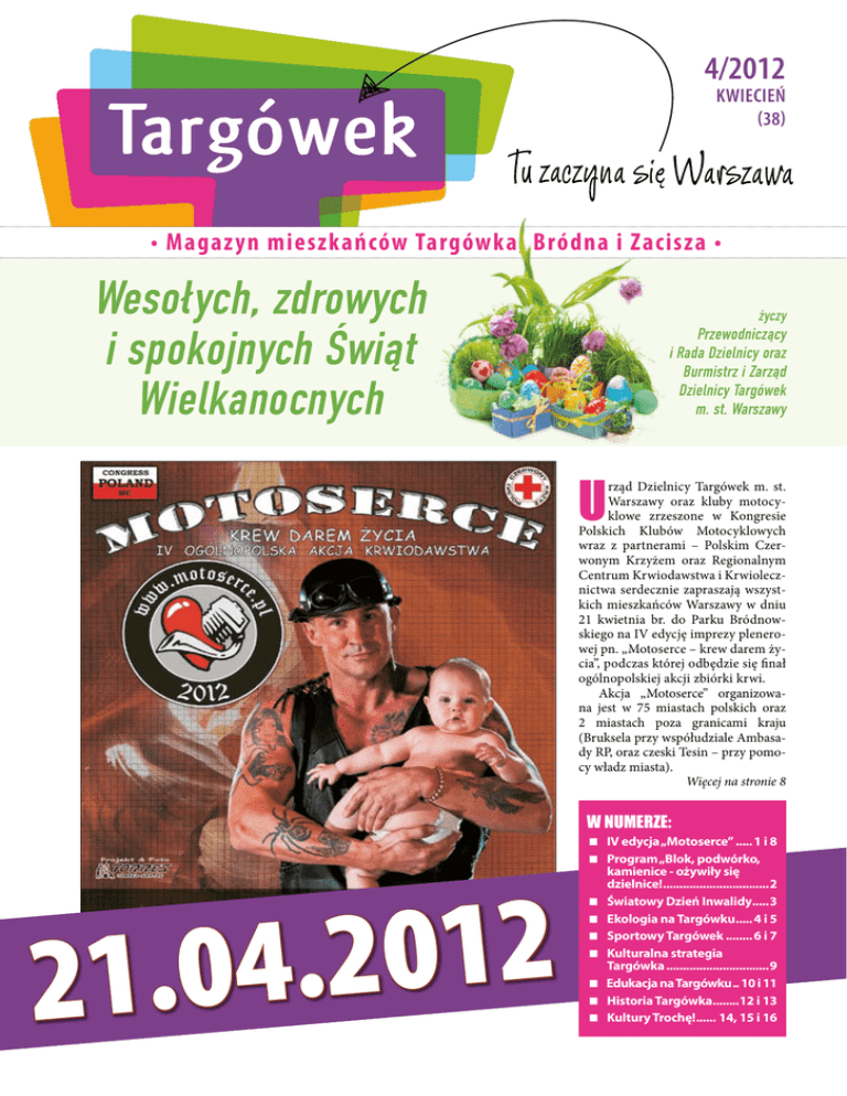 4/2012 KWIECIEŃ (38) • Magazyn mieszkańców Targówka, Bródna i Zacisza • Wesołych, zdrowych i spokojnych Świąt Wielkanocnych życzy Przewodniczący i Rada Dzielnicy oraz Burmistrz i Zarząd Dzielnicy Targówek m. st. Warszawy U rząd Dzielnicy Targówek m. st. Warszawy oraz kluby motocyklowe zrzeszone w Kongresie Polskich Klubów Motocyklowych wraz z partnerami – Polskim Czerwonym Krzyżem oraz Regionalnym Centrum Krwiodawstwa i Krwiolecznictwa serdecznie zapraszają wszystkich mieszkańców Warszawy w dniu 21 kwietnia br. do Parku Bródnowskiego na IV edycję imprezy plenerowej pn. „Motoserce – krew darem życia”, podczas której odbędzie się finał ogólnopolskiej akcji zbiórki krwi. Akcja „Motoserce” organizowana jest w 75 miastach polskich oraz 2 miastach poza granicami kraju (Bruksela przy współudziale Ambasady RP, oraz czeski Tesin – przy pomocy władz miasta). Więcej na stronie 8 W NUMERZE: 2 1 0 2 . 4 0 . 1 2 I V edycja „Motoserce”...... 1 i 8 Program „Blok, podwórko, kamienice - ożywiły się dzielnice!.................................2 Światowy Dzień Inwalidy......3 Ekologia na Targówku...... 4 i 5 Sportowy Targówek......... 6 i 7 Kulturalna strategia Targówka................................9 Edukacja na Targówku... 10 i 11 Historia Targówka.........12 i 13 Kultury Trochę!....... 14, 15 i 16 Z dzielnicy N Dzielnica Targówek m. st. Warszawy sukcesywnie pozyskuje środki unijne na działania społeczne. Dotychczasowe działania były skierowane na projekty edukacyjne, teraz również zatrudnienie i integracja społeczna należą do priorytetów rozwoju społecznego dzielnicy. 2 a podstawie diagnozy problemów społecznych przeprowadzonej w 2010/2011 roku wynika, że wsparciem powinny zostać objęte osoby pozostające bez pracy. Przykładem tego jest program „Blok, podwórko, kamienice – ożywiły się dzielnice”, który jest skierowany do osób młodych, zamieszkujących tereny objęte programem rewitalizacji według działania 5.2. Regionalnego Programu Operacyjnego Województwa Mazowieckiego. Obszar Bródna, Targówka Mieszkaniowego i Targówka Fabrycznego to tzw. obszary kryzysowe ujęte w Lokalnym Programie Rewitalizacji wymagające największego wsparcia. Dzielnica Targówek przystąpiła do projektu z przekonaniem, że rewitalizacja społeczna jest nierozerwalnie związana z rewitalizacją infrastrukturalną i wówczas przynosi spójne efekty. Projekt na Targówku realizowany jest w partnerstwie ze Stowarzyszeniem Monopol Warszawski i ma na celu wypracowanie najlepszych rozwiązań oraz standardu rewitalizacji społecznej na poziomie lokalnym. Od 01.10.2011 do 31.12.2012 przez m. st. Warszawa realizowany jest program „Blok, podwórko, kamienice – ożywiły się dzielnice”. Jego celem jest integracja i przeciwdziałanie wykluczeniu społecznemu mieszkańców trzech prawobrzeżnych dzielnic Warszawy. Wsparcie projektowe jest kierowane do 535 osób (280 kobiet, 255 mężczyzn) z obszarów kryzysowych dzielnicy Targówek, Praga Północ, Praga Południe w tym 50% w wieku 15-25 lat. Realizacja projektu będzie wpływać na wzmocnienie więzi sąsiedzkich, zwiększy zaangażowanie mieszkańców w kształtowanie najbliższego otoczenia, jak też poprawi umiejętność aktywnego poszukiwania pracy przez młodych dorosłych. Wartość programu wynosi 1.886.498,90 zł, wartość dofinansowania 1.569.353,90 zł Program realizowany jest w partnerstwie z organizacjami pozarządowymi. Liderem projektu jest m. st. Warszawa (Biuro Funduszy Europejskich) we współpracy z Ośrodkiem Pomocy Społecznej Dzielnicy Praga Południe, Dzielnicą Targówek, Dzielnicą Praga Południe, Dzielnicą Praga Północ. Partnerami są: Stowarzyszenie „Wspólne Podwórko”, Stowarzyszenie na rzecz poprawy środowiska mieszkalnego „Odblokuj” oraz Stowarzyszenie Monopol Warszawski. Pierwszym działaniem realizowanym na Targówku jest streetworking. Jest to rodzaj pracy socjalnej skierowanej do dzieci i młodzieży zagrożonej marginalizacją, patologią, uzależnieniem od Z dzielnicy alkoholu i wykluczeniem społecznym, które z różnych przyczyn nie korzystają z pomocy oferowanej przez stacjonarne instytucje. Wkrótce rozpoczyna się cykl działań pod wspólną nazwą „Targówek wespół w zespół” realizowany przez Stowarzyszenie Monopol Warszawski. W kwietniu rozpoczynamy pracę w zaniedbanych podwórkach, gdzie chcemy zorganizować ekologiczne ogródki. Dzięki akcji „Zasadź Targówek” powstanie wspólnie 5 ogródków, których niepowtarzalny charakter będzie zależał od inwencji twórczej mieszkańców. mijany codziennie, może być impulsem do zmiany nastawienia, roześmiania się, czy postawienia pytania, a może by tak...? Praca artystów będzie miała na celu zainspirowanie uczestników projektu, stymulację ich potencjału twórczego i emocjonalnego. W listopadzie mieszkańcy Targówka będą uczestniczyć w grze miejskiej „Targuj się o Targówek”. Jest to edukacyjnorozrywkowa forma łącząca w sobie cechy gier komputerowych, RPG, harcerskich rajdów oraz flash mobów i happeningów ulicznych, co jest szczególnie atrakcyjne dla młodych ludzi. Poprzez zabawę Wkrótce rozpoczyna się cykl działań pod wspólną nazwą „Targówek wespół w zespół” realizowany przez Stowarzyszenie Monopol Warszawski. W kwietniu rozpoczynamy pracę w zaniedbanych podwórkach, gdzie chcemy zorganizować ekologiczne ogródki. „Punkty zwrotne” to inicjatywa, w ramach której powstaną na terenie Targówka mozaikowe tablice będące nośnikami pozytywnych treści refleksyjnych. Mozaiki będą umieszczone na wybranych chodnikach, ścieżkach, alejkach (np. poprzez wymienienie jednej z płyt chodnikowych). Mozaiki będą atrakcyjnymi i efektownymi dziełami plastycznymi stworzonymi z kolorowej ceramiki w okresie kwietnia i maja. Artyści prowadzący projekt zadbają o estetykę ich wykonania. Bodźcem do refleksji może być