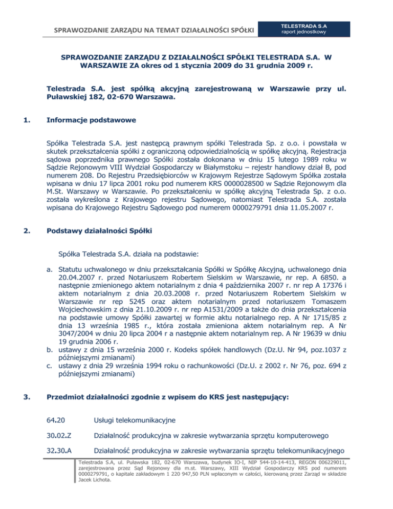 SPRAWOZDANIE ZARZĄDU NA TEMAT DZIAŁALNOŚCI SPÓŁKI TELESTRADA S.A raport jednostkowy SPRAWOZDANIE ZARZĄDU Z DZIAŁALNOŚCI SPÓŁKI TELESTRADA S.A. W WARSZAWIE ZA okres od 1 stycznia 2009 do 31 grudnia 2009 r. Telestrada S.A. jest spółką akcyjną zarejestrowaną w Warszawie przy ul. Puławskiej 182, 02-670 Warszawa. 1. Informacje podstawowe Spółka Telestrada S.A. jest następcą prawnym spółki Telestrada Sp. z o.o. i powstała w skutek przekształcenia spółki z ograniczoną odpowiedzialnością w spółkę akcyjną. Rejestracja sądowa poprzednika prawnego Spółki została dokonana w dniu 15 lutego 1989 roku w Sądzie Rejonowym VIII Wydział Gospodarczy w Białymstoku – rejestr handlowy dział B, pod numerem 208. Do Rejestru Przedsiębiorców w Krajowym Rejestrze Sądowym Spółka została wpisana w dniu 17 lipca 2001 roku pod numerem KRS 0000028500 w Sądzie Rejonowym dla M.St. Warszawy w Warszawie. Po przekształceniu w spółkę akcyjną Telestrada Sp. z o.o. została wykreślona z Krajowego rejestru Sądowego, natomiast Telestrada S.A. została wpisana do Krajowego Rejestru Sądowego pod numerem 0000279791 dnia 11.05.2007 r. 2. Podstawy działalności Spółki Spółka Telestrada S.A. działa na podstawie: a. Statutu uchwalonego w dniu przekształcania Spółki w Spółkę Akcyjną, uchwalonego dnia 20.04.2007 r. przed Notariuszem Robertem Sielskim w Warszawie, nr rep. A 6850. a następnie zmienionego aktem notarialnym z dnia 4 października 2007 r. nr rep A 17376 i aktem notarialnym z dnia 20.03.2008 r. przed Notariuszem Robertem Sielskim w Warszawie nr rep 5245 oraz aktem notarialnym przed notariuszem Tomaszem Wojciechowskim z dnia 21.10.2009 r. nr rep A1531/2009 a takŜe do dnia przekształcenia na podstawie umowy Spółki zawartej w formie aktu notarialnego rep. A Nr 1715/85 z dnia 13 września 1985 r., która została zmieniona aktem notarialnym rep. A Nr 3047/2004 w dniu 20 lipca 2004 r a następnie aktem notarialnym rep. A Nr 19639 w dniu 19 grudnia 2006 r. b. ustawy z dnia 15 września 2000 r. Kodeks spółek handlowych (Dz.U. Nr 94, poz.1037 z późniejszymi zmianami) c. ustawy z dnia 29 września 1994 roku o rachunkowości (Dz.U. z 2002 r. Nr 76, poz. 694 z późniejszymi zmianami) 3. Przedmiot działalności zgodnie z wpisem do KRS jest następujący: 64.20 Usługi telekomunikacyjne 30.02.Z Działalność produkcyjna w zakresie wytwarzania sprzętu komputerowego 32.30.A Działalność produkcyjna w zakresie wytwarzania sprzętu telekomunikacyjnego Telestrada S.A, ul. Puławska 182, 02-670 Warszawa, budynek IO-I, NIP 544-10-14-413, REGON 006229011, zarejestrowana przez Sąd Rejonowy dla m.st. Warszawy, XIII Wydział Gospodarczy KRS pod numerem 0000279791, o kapitale zakładowym 1 220 947,50 PLN wpłaconym w całości, kierowaną przez Zarząd w składzie Jacek Lichota. TELESTRADA S.A raport jednostkowy SPRAWOZDANIE ZARZĄDU NA TEMAT DZIAŁALNOŚCI SPÓŁKI 4. 51.64.Z Działalność handlowa w zakresie telekomunikacyjnym w hurcie obrotu sprzętem komputerowym i 52.48.A Działalność handlowa w zakresie telekomunikacyjnym w detalu obrotu sprzętem komputerowym i 72.50.Z Działalność usługowa telekomunikacyjnego serwisu sprzętu komputerowego i 32.30.Z Działalność usługowa w zakresie serwisu sprzętu telekomunikacyjnego 72.20.Z Tworzenie, zwielokrotnianie komputerowego 72.40.Z Tworzenie i prowadzenie baz danych szczególności rodzajów ”www” i „wap” 72.60.Z Projektowanie i prowadzenie serwisów internetowych, grafiki komputerowej 72.60.Z Usługi dydaktyczne w zakresie obsługi komputerowego oraz oprogramowania 72.60.Z Przygotowanie i prowadzenie aukcji internetowych 74.40.Z Działalność reklamowa i marketingowa 70.31.Z Usługi pośrednictwa w obrocie nieruchomościami, w szczególności zawierania umów sprzedaŜy, najmu lub dzierŜawy 65.23. Usługi pośrednictwa finansowego pozostałe, gdzie indziej nie sklasyfikowane 74.14. Doradztwo w zakresie prowadzenia działalności gospodarczej i zarządzania 74.15. Działalność holdingów 45 Budownictwo 67.20 Usługi związane z ubezpieczeniami i funduszami emerytalno-rentowymi w zakresie i rozpowszechnianie oraz stron sprzętu oprogramowania internetowych, w telekomunikacyjnego, Zasadniczy, wykonywany przedmiot działalności Spółki jest następujący: a. b. c. d. e. f. g. h. świadczenie usług telekomunikacyjnych – działalność dominująca, tworzenie i prowadzenie baz danych oraz stron internetowych, projektowanie i prowadzenie serwisów internetowych projektowanie i tworzenie grafiki komputerowej, przygotowanie i prowadzenie aukcji internetowych działalność reklamowa i marketingowa, usługi pośrednictwa finansowego, budownictwo Telestrada S.A, ul. Puławska 182, 02-670 Warszawa, budynek IO-I, NIP 544-10-14-413, REGON 006229011, zarejestrowana przez Sąd Rejonowy dla m.st. Warszawy, XIII Wydział Gospodarczy KRS pod numerem 0000279791, o kapitale zakładowym 1 220 947,50 PLN wpłaconym w całości, kierowaną przez Zarząd w składzie Jacek Lichota. SPRAWOZDANIE ZARZĄDU NA TEMAT DZIAŁALNOŚCI SPÓŁKI 5. TELESTRADA S.A raport jednostkowy Kapitał Kapitał akcyjny Spółki wynosi 1 270 947,50 zł i dzieli się na 2 541 895 akcji o nominale 50 gr. kaŜda. 6. Numer statystyczny w systemie REGON 006229011 7. Numer identyfikacji podatkowej NIP 544-10-14-413 8. Zatrudnienie Średnioroczne zatrudnienie w roku 2009 wyniosło 17 osób w przeliczeniu na pełne etaty. 9. Zarząd Zarząd Spółki powoływany jest przez Zgromadzenie Akcjonariuszy na okres trzech lat. W roku 2009 Zarząd był jednoosobowy. BieŜące sprawy oraz reprezentacja Spółki na zewnątrz prowadzona była przez Prezesa Zarządu Pana Jacka Lichotę. Do składania oświadczeń woli w imieniu Spółki upowaŜniony jest członek zarządu – jednoosobowo. 10. Rada Nadzorcza Rada Nadzorcza Spółki powoływana jest na okres trzech lat. Jej działalność reguluje regulamin uchwalony przez Walne Zgromadzenie Akcjonariuszy. W s