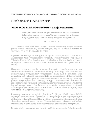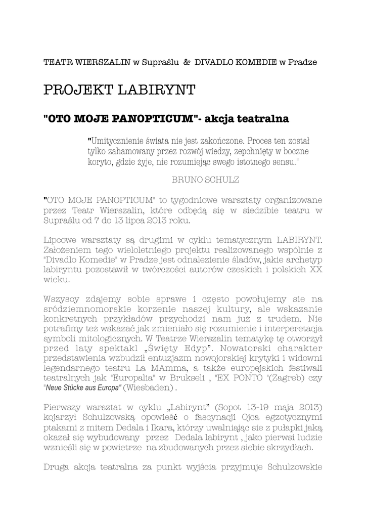 TEATR WIERSZALIN w Supraślu & DIVADLO KOMEDIE w Pradze PROJEKT LABIRYNT "OTO MOJE PANOPTICUM"- akcja teatralna "Umitycznienie świata nie jest zakończone. Proces ten został tylko zahamowany przez rozwój wiedzy, zepchnięty w boczne koryto, gdzie żyje, nie rozumiejąc swego istotnego sensu." BRUNO SCHULZ "OTO MOJE PANOPTICUM" to tygodniowe warsztaty organizowane przez Teatr Wierszalin, które odbędą się w siedzibie teatru w Supraślu od 7 do 13 lipca 2013 roku. Lipcowe warsztaty są drugimi w cyklu tematycznym LABIRYNT. Założeniem tego wieloletniego projektu realizowanego wspólnie z "Divadlo Komedie" w Pradze jest odnalezienie śladów, jakie archetyp labiryntu pozostawił w twórczości autorów czeskich i polskich XX wieku. Wszyscy zdajemy sobie sprawe i często powołujemy sie na sródziemnomorskie korzenie naszej kultury, ale wskazanie konkretnych przykładów przychodzi nam już z trudem. Nie potrafimy też wskazać jak zmieniało się rozumienie i interperetacja symboli mitologicznych. W Teatrze Wierszalin tematykę tę otworzył przed laty spektakl „Święty Edyp”. Nowatorski charakter przedstawienia wzbudził entuzjazm nowojorskiej krytyki i widowni legendarnego teatru La MAmma, a także europejskich festiwali teatralnych jak "Europalia" w Brukseli , "EX PONTO "(Zagreb) czy "Neue Stücke aus Europa" (Wiesbaden) . Pierwszy warsztat w cyklu „Labirynt” (Sopot 13-19 maja 2013) kojarzył Schulzowską opowieść o fascynacji Ojca egzotycznymi ptakami z mitem Dedala i Ikara, którzy uwalniając sie z pułapki jaką okazał się wybudowany przez Dedala labirynt , jako pierwsi ludzie wznieśli się w powietrze na zbudowanych przez siebie skrzydłach. Druga akcja teatralna za punkt wyjścia przyjmuje Schulzowskie panopticum, które Ojciec w tajemnicy przed całym światem buduje w podziemiach domu. Przy pomocy żywych obrazów chcemy pookazać, jak niewiele dzieli to panopticum Ojca od pierwotnego labiryntu, który w pajęczynie korytarzy ukrywał Minotaura - istotę żywiącą sie mięsem ludzi- pół człowieka- pół zwierzę. „Oto moje panopticum” będzie widowiskiem plenerowym, które w siedzibie supraskiego teatru odbędzie się 13 lipca o godzinie 20.00. Bedzie to zarazem ostatni dzień akcji . Tydzień wcześniej w sobotę 7 lipca uczestnicy warsztatów w ramach pierwszego dnia zajęć obejrzą „Traktat o manekinach” – spektakl Teatru Wierszalin - by wspólnie z nami wkroczyć w świat Schulzowskich symboli i metafor - WKROCZYĆ DO LABIRYNTU, KTÓRY PRZEZ SIEDEM NASTĘPNYCH DNI BĘDZIE NASZYM DOMEM. Warsztaty będą podzielone na dwa bloki: I – część poranna – trening aktorski prezentujący techniki pracy wykorzystywane przez aktorów Teatru Wierszalin w ich pracy nad rolą. Trening obejmować będzie elementy techniki aktorskiej w zakresie plastyki ruchu scenicznego I gry aktora w masce. Trening będzie również kształtował odwagę i kreatywność sceniczną. Prowadzenie: Miłosz Pietruski, Katarzyna Siergiej , II – cześć popołudniowa – PRACA TWÓRCZA AKTORA Tę część warszatów poprowadzi Rafał Gąsowski przy udziale D a r i u s z a M a t ys a . D z i a ł a n i a a k t o r ó w o r a z a s p i r a n t ó w uczestniczących w warsztacie skupione będą ściśle na scenicznej kreacji Schulzowskiego "Panopticum" oraz mitologicznego labiryntu, który skrywa postać Minotaura. POMYSŁODAWCA I REŻYSER PROJEKTU LABIRYNT - PIOTR TOMASZUK - będzie sprawował opiekę nad przebiegiem całości. Wspólna praca AKTORÓW teatru i uczestniczących w warsztatach ASPIRANTÓW przebiegać będzie tak jak codzienna praca naszego zespołu. Po tygodniu wspólnie wyjdziemy na scenę i wspólnie ZAGRAMY dla WIDZÓW zgromadzonych na terenie okalającym Teatr w Supraślu.. Czy będzie to tylko teatralna przygoda czy głębokie, oczyszczające przeżycie? Czy poczujemy katharsis, czy niedosyt? Eksperymentalny charakter naszej pracy wiąże się zawsze z ryzykiem. Jedne co wiemy na pewno, to, że plenerową akcję "OTO MOJE PANOPTICUM" pokazujemy w lipcową sobotę - 13- tego - o godzinie 20.00 . JEŻELI ZDECYDUJESZ SIĘ NA UCZESTNICTWO W NASZYM PROJEKCIE ZOBACZYSZ ŚWIAT PO DRUGIEJ STRONIE RAMPY, POCZUJESZ ODDECH WIDOWNI I LEPIEJ POZNASZ SIEBIE. "TO MOJE PANOPTICUM... " - - TAK TWOJE. Zgłoszenia, wraz z ewentualnym krótkim opisem dotychczasowego doświadczenia scenicznego, prosimy kierować na adres: [email protected] Koszt uczestnictwa w warsztatach wynosi 400 PLN (cena nie zawiera kosztów transportu oraz zakwaterowania. Teatr Wierszalin służy pomocą w organizacji noclegów w Supraślu oraz zapewnia lunch w przerwie pomiędzy porannymi a popołudniowymi spotkaniami warsztatowymi.) Do uczestctwa zapraszamy młodzież starszą i osoby dorosłe.