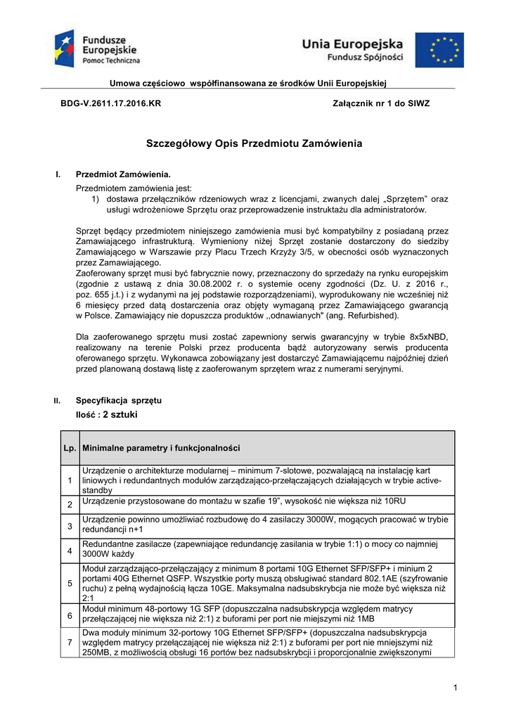 Umowa częściowo współfinansowana ze środków Unii Europejskiej BDG-V.2611.17.2016.KR Załącznik nr 1 do SIWZ Szczegółowy Opis Przedmiotu Zamówienia I. Przedmiot Zamówienia. Przedmiotem zamówienia jest: 1) dostawa przełączników rdzeniowych wraz z licencjami, zwanych dalej „Sprzętem” oraz usługi wdrożeniowe Sprzętu oraz przeprowadzenie instruktażu dla administratorów. Sprzęt będący przedmiotem niniejszego zamówienia musi być kompatybilny z posiadaną przez Zamawiającego infrastrukturą. Wymieniony niżej Sprzęt zostanie dostarczony do siedziby Zamawiającego w Warszawie przy Placu Trzech Krzyży 3/5, w obecności osób wyznaczonych przez Zamawiającego. Zaoferowany sprzęt musi być fabrycznie nowy, przeznaczony do sprzedaży na rynku europejskim (zgodnie z ustawą z dnia 30.08.2002 r. o systemie oceny zgodności (Dz. U. z 2016 r., poz. 655 j.t.) i z wydanymi na jej podstawie rozporządzeniami), wyprodukowany nie wcześniej niż 6 miesięcy przed datą dostarczenia oraz objęty wymaganą przez Zamawiającego gwarancją w Polsce. Zamawiający nie dopuszcza produktów ,,odnawianych" (ang. Refurbished). Dla zaoferowanego sprzętu musi zostać zapewniony serwis gwarancyjny w trybie 8x5xNBD, realizowany na terenie Polski przez producenta bądź autoryzowany serwis producenta oferowanego sprzętu. Wykonawca zobowiązany jest dostarczyć Zamawiającemu najpóźniej dzień przed planowaną dostawą listę z zaoferowanym sprzętem wraz z numerami seryjnymi. Specyfikacja sprzętu II. Ilość : 2 sztuki Lp. Minimalne parametry i funkcjonalności 2 Urządzenie o architekturze modularnej – minimum 7-slotowe, pozwalającą na instalację kart liniowych i redundantnych modułów zarządzająco-przełączających działających w trybie activestandby Urządzenie przystosowane do montażu w szafie 19”, wysokość nie większa niż 10RU 3 Urządzenie powinno umożliwiać rozbudowę do 4 zasilaczy 3000W, mogących pracować w trybie redundancji n+1 4 Redundantne zasilacze (zapewniające redundancję zasilania w trybie 1:1) o mocy co najmniej 3000W każdy 1 5 6 7 Moduł zarządzająco-przełączający z minimum 8 portami 10G Ethernet SFP/SFP+ i minium 2 portami 40G Ethernet QSFP. Wszystkie porty muszą obsługiwać standard 802.1AE (szyfrowanie ruchu) z pełną wydajnością łącza 10GE. Maksymalna nadsubskrybcja nie może być większa niż 2:1 Moduł minimum 48-portowy 1G SFP (dopuszczalna nadsubskrypcja względem matrycy przełączającej nie większa niż 2:1) z buforami per port nie miejszymi niż 1MB Dwa moduły minimum 32-portowy 10G Ethernet SFP/SFP+ (dopuszczalna nadsubskrypcja względem matrycy przełączającej nie większa niż 2:1) z buforami per port nie mniejszymi niż 250MB, z możliwością obsługi 16 portów bez nadsubskrybcji i proporcjonalnie zwiększonymi 1 Umowa częściowo współfinansowana ze środków Unii Europejskiej buforami do 500MB per port. Wszystkie porty muszą obsługiwać standard 802.1AE (szyfrowanie ruchu) z pełną wydajnością łącza 10GE. 8 Wkładki optyczne (SFP, SFP+, QSFP) przeznaczone do instalacji w przełączniku muszą pochodzić od tego samego producenta co oferowany przełącznik 9 Minimum 3 sloty na moduły w urządzeniu muszą pozostać wolne – celem jego przyszłej rozbudowy 10 Dostępne pasmo min. 440 Gbps na każdy z dostępnych slotów Wydajność przełączania na poziomie min. 60 Mpps per moduł liniowy dla przełączania L2 oraz 11 routingu IPv4 i 30 Mpps per moduł liniowy dla routingu IPv6, tunelowania GRE oraz VPLS Obsługa przetwarzania rozproszonego – wszystkie oferowane karty liniowe muszą mieć 12 możliwość samodzielnego przełączania ruchu (bez pośrednictwa karty zarządzającej), jeśli wymagane są dodatkowe moduły zapewniające tą funkcjonalność muszą być dołączone Wymagane parametry wydajnościowe: a) min. 100 000 wpisów w tablicy adresów MAC b) min. 250 000 wpisów w tablicy routingowej IPv4 13 c) min. 125 000 wpisów w tablicy routingowej IPv6 d) min. 125 000 tras multicast e) min. 64 000 wpisów na potrzeby realizacji polityk QoS i bezpieczeństwa (listy kontroli dostępu) Obsługa protokołów warstwy 3 dla IPv4: Open Shortest Path First (OSPF), BGPv4 14 15 Obsługa protokoły warstwy 3 dla IPv6: Open Shortest Path First (OSPFv3), MP-BGP 16 Mechanizm Non-Stop-Forwarding lub równoważny Obsługa sprzętowa ruchu multicastowego w tym PIM Sparse i Dense Mode, SSM, IGMP/MLD 17 Urządzenie musi umożliwiać rozszerzenie funkcjonalności o wsparcie dla MPLS, LDP, L2 i L3 VPN, VPLS, MPLS TE, MPLS traceruote poprzez zakup odpowiedniej licencji lub wymianę 18 oprogramowana bez konieczności modernizacji sprzętowej urządzenia 19 Obsługa sprzętowa tunelowania GRE Urządzenie musi wspierać następujące mechanizmy związane z zapewnieniem ciągłości pracy sieci: a. mechanizm BFD (Bidirectional Forwarding Detection) co najmniej dla protokołu OSPFv2 i OSPFv3 b. IEEE 802.1w Rapid Spanning Tree 20 c. IEEE 802.1s Multiple Spanning Tree d. IEEE 802.3ad (Link Aggregation Control Protocol) umożliwiający grupowanie portów z wykorzystaniem portów znajdujących się na różnych kartach liniowych e. pozwala na wymianę kart liniowych oraz modułu fantray bez wyłączania zasilania (tzw. HotSwap) Urządzenie musi wspierać następujące mechanizmy związane z zapewnieniem jakości usług w sieci (QoS): a. Obsługa min. 8 kolejek sprzętowych dla portów 10GE i min. 4 kolejek sprzętowych dla portów GE b. Obsługa co najmniej jednej kolejki ze statusem strict priority 21 c. Klasyfikacja ruchu do klas różnej jakości obsługi (QoS) poprzez nadawanie wartości 802.1p (CoS) oraz IP Precedence/DSCP w ramkach Ethernet oraz pakietach IP. Wykorzystanie następujących parametrów w klasyfikacji: źródłowy/docelowy adres MAC, źródłowy/docelowy adres IP, żródłowy/docelowy port TCP d. Możliwość zmiany przez urządzenie kodu wartości QoS zawartego w ramce Ethernet oraz pakiecie IP –