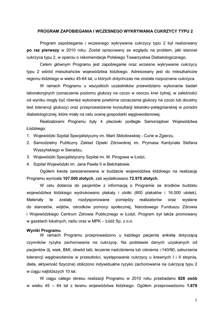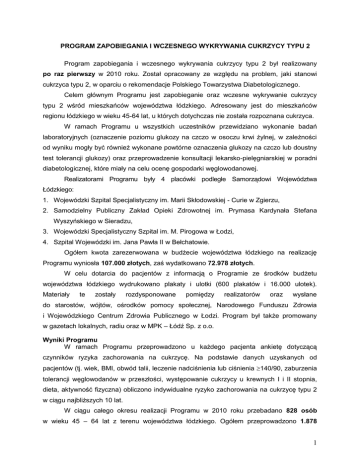 PROGRAM ZAPOBIEGANIA I WCZESNEGO WYKRYWANIA CUKRZYCY TYPU 2 Program zapobiegania i wczesnego wykrywania cukrzycy typu 2 był realizowany po raz pierwszy w 2010 roku. Został opracowany ze względu na problem, jaki stanowi cukrzyca typu 2, w oparciu o rekomendacje Polskiego Towarzystwa Diabetologicznego. Celem głównym Programu jest zapobieganie oraz wczesne wykrywanie cukrzycy typu 2 wśród mieszkańców województwa łódzkiego. Adresowany jest do mieszkańców regionu łódzkiego w wieku 45-64 lat, u których dotychczas nie została rozpoznana cukrzyca. W ramach Programu u wszystkich uczestników przewidziano wykonanie badań laboratoryjnych (oznaczenie poziomu glukozy na czczo w osoczu krwi żylnej, w zależności od wyniku mogły być również wykonane powtórne oznaczenia glukozy na czczo lub doustny test tolerancji glukozy) oraz przeprowadzenie konsultacji lekarsko-pielęgniarskiej w poradni diabetologicznej, które miały na celu ocenę gospodarki węglowodanowej. Realizatorami Programu były 4 placówki podległe Samorządowi Województwa Łódzkiego: 1. Wojewódzki Szpital Specjalistyczny im. Marii Skłodowskiej - Curie w Zgierzu, 2. Samodzielny Publiczny Zakład Opieki Zdrowotnej im. Prymasa Kardynała Stefana Wyszyńskiego w Sieradzu, 3. Wojewódzki Specjalistyczny Szpital im. M. Pirogowa w Łodzi, 4. Szpital Wojewódzki im. Jana Pawła II w Bełchatowie. Ogółem kwota zarezerwowana w budżecie województwa łódzkiego na realizację Programu wyniosła 107.000 złotych, zaś wydatkowano 72.978 złotych. W celu dotarcia do pacjentów z informacją o Programie ze środków budżetu województwa łódzkiego wydrukowano plakaty i ulotki (600 plakatów i 16.000 ulotek). Materiały te zostały rozdysponowane pomiędzy realizatorów oraz wysłane do starostów, wójtów, ośrodków pomocy społecznej, Narodowego Funduszu Zdrowia i Wojewódzkiego Centrum Zdrowia Publicznego w Łodzi. Program był także promowany w gazetach lokalnych, radiu oraz w MPK – Łódź Sp. z o.o. Wyniki Programu W ramach Programu przeprowadzono u każdego pacjenta ankietę dotyczącą czynników ryzyka zachorowania na cukrzycę. Na podstawie danych uzyskanych od pacjentów (tj. wiek, BMI, obwód talii, leczenie nadciśnienia lub ciśnienia 140/90, zaburzenia tolerancji węglowodanów w przeszłości, występowanie cukrzycy u krewnych I i II stopnia, dieta, aktywność fizyczna) obliczono indywidualne ryzyko zachorowania na cukrzycę typu 2 w ciągu najbliższych 10 lat. W ciągu całego okresu realizacji Programu w 2010 roku przebadano 828 osób w wieku 45 – 64 lat z terenu województwa łódzkiego. Ogółem przeprowadzono 1.878 1 konsultacji w poradni diabetologicznej, wykonano 879 oznaczeń glukozy na czczo oraz 202 testy doustnego obciążenia glukozą. Analizując ryzyko cukrzycy wśród badanej populacji można stwierdzić, iż 32,37% osób (tj. 268) miała nieznacznie podwyższone ryzyko cukrzycy, 23,70% (tj. 197 badanych) umiarkowane, 23,43% (tj.194 badanych) - wysokie, 13,04% - niskie ryzyko. Odsetek osób, które miały bardzo wysokie ryzyko zachorowania cukrzycy (oznaczające, że zachoruje w przybliżeniu 1 osoba na 2) wynosił 7,37% (tj. 61 osób). Szczegółowe informacje na ten temat zamieszczono na Wykresie Nr 1. Wykres Nr 1. Ryzyko zachorowania na cukrzycę wśród badanej populacji ryzyko bardzo wysokie; 7,37% ryzyko niskie; 13,04% ryzyko wysokie; 23,43% ryzyko umiarkowane; 23,79% ryzyko nieznacznie podwyższone; 32,37% W wyniku badań przeprowadzonych w ramach Programu rozpoznano cukrzycę u 44 osób, czyli u 5,31% populacji badanej. Ponadto u 174 pacjentów zdiagnozowano stan przedcukrzycowy (tj. 21,01% ankietowanych). Mając na uwadze fakt, iż późne wykrycie cukrzycy wiąże się z poważnymi konsekwencjami zdrowotnymi, takimi jak uszkodzenia różnych narządów, szczególnie oczu, nerek, nerwów, serca i naczyń krwionośnych można stwierdzić, iż efekty Programu zapobiegania i wczesnego wykrywania cukrzycy typu 2 są znaczące. 2