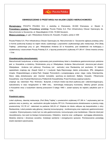 OBWIESZCZENIE O PRZETARGU NA NAJEM CZĘŚCI NIERUCHOMOŚCI Wynajmujący: POCZTA POLSKA S.A. z siedzibą w Warszawie, 00-940 Warszawa, ul. Stawki 2. Prowadzący przetarg: Prowadzący przetarg: Poczta Polska S.A. Pion Infrastruktury Obszar Operacyjny ds. Nieruchomości w Szczecinie, al. Niepodległości 41/42, 70-940 Szczecin. Miejsce przetargu: ul. gen. Władysława Andersa 22, Koszalin, III piętro, pokój nr 309 Poczta Polska S.A. Pion Infrastruktury Obszar Operacyjny ds. Nieruchomości w Szczecinie ogłasza przetarg ustny w formie publicznej licytacji na najem lokalu użytkowego ( poprzednio użytkowanego jako restauracja „Pod Złotą Trąbką) położonego przy ul. gen. Władysława Andersa 22 w Koszalinie, pod działalność nie kolidującą z działalnością i wizerunkiem Poczty Polskiej S.A. o łącznej powierzchni użytkowej 471,99 m2. Okres trwania umowy – 5 lat. Charakterystyka nieruchomości: Nieruchomość budynkowa, w której usytuowany jest przedmiotowy lokal o charakterze gastronomicznym położona jest w Koszalinie, w dzielnicy Śródmieście, przy ul. Władysława Andersa. Nieruchomość otoczona jest ulicami: Władysława Andersa (od północy), Pocztową (od zachodu) oraz Racławicką (od wschodu). W bliskim sąsiedztwie znajdują się: Zespół Szkół nr 1, budynek Sądu Rejonowego (także prokuratura, IPN, delegatura Urzędu Wojewódzkiego), a także Park Książąt Pomorskich, z przepływającą przez niego rzeką Dzierżęcinką. Nieco dalej, zlokalizowany jest również kompleks sportowy ze stadionem Bałtyku Koszalin, Filharmonia Koszalińska oraz Wydział Mechaniczny Politechniki Koszalińskiej. Przed frontową częścią budynku znajduje się natomiast Plac Wolności. Budynek, w którym mieści się lokal użytkowy jest czterokondygnacyjny, wybudowany w stylu neogotyckim w 1884 roku, technologią tradycyjną murowaną. Główny gmach poczty w Koszalinie wraz z budynkiem dawnej powozowni 5 lutego 1993 r. został wpisany do rejestru zabytków pod nr 1236. Przedmiot najmu: Lokal użytkowy, dawniej restauracja „Pod Złotą Trąbką” o powierzchni użytkowej 471,99 m 2 usytuowany jest na parterze oraz w piwnicy, we wschodnim skrzydle budynku PP S.A. Pomieszczenia zlokalizowane w piwnicy mają powierzchnię 131,76 m2, natomiast na parterze 340,23 m 2. Wejście do lokalu odbywa się bezpośrednio z ulicy Racławickiej. Lokal posiada salę główną ( dawniej konsumpcyjną) , konferencyjną oraz zaplecze( gastronomiczne) i socjalne. Wykorzystywany może być na cele gastronomiczne, konsumpcyjne oraz bankietowe. Obecnie lokal jest nieużytkowany, lecz jest na bieżąco konserwowany. Okładziny ścienne oraz podłogowe wymagają odświeżenia. Stolarka okienna i drzwiowa szczelna. Instalacje sanitarne i energetyczne sprawne. Pomieszczenia posiadają średni standard wykończenia. Wywoławcza stawka czynszu netto dla części nieruchomości, której dotyczy postępowanie przetargowe wynosi: 1) usytuowanej w piwnicy wynosi 5,00 PLN netto /m2 miesięcznie 2) usytuowanej na parterze wynosi 11,03 PLN netto /m2 miesięcznie *Podane powyżej stawki czynszu nie obejmują dostarczenia do nieruchomości ciepła, energii elektrycznej, wody, odprowadzania ścieków, jak również wywozu nieczystości stałych. Postąpienia: 1) dla części nieruchomości usytuowanej w piwnicy wynosi – 0,10 zł 2) dla części nieruchomości usytuowanej na parterze wynosi – 0,20 zł Wadium: 13 234,62 PLN Szczegółowe informacje na temat przetargu i warunków najmu można uzyskać w siedzibie Pionu Infrastruktury Obszar Operacyjny ds. nieruchomości w Szczecinie, al. Niepodległości 41/42 , 70-940 Szczecin – Natalia Jąder pokój nr 159 tel. 91 440 13 47, kom. 502-019-781, w godzinach od 730- 1530. Termin licytacji ustnej: 10.09.2014 r. godz. 1100 – w Koszalinie, ul. gen. Władysława Andersa 22, III piętro, pokój nr 309 Warunkiem przystąpienia do przetargu jest: 1. Wniesienie wadium przelewem na rachunek bankowy w Banku Pocztowym S.A. w Bydgoszczy nr konta: 85 1320 0019 0099 0718 2000 0025 w terminie do dnia: 08.09.2014 r., przy czym jako termin wpłaty rozumiany jest termin uznania wpłaty na rachunku Poczty Polskiej S.A. z dopiskiem na przelewie „PI Szczecin przetarg, lokal użytkowy, restauracja – Koszalin, Andersa 22”. 2. Okazanie komisji przetargowej oryginału lub kopii wpłaty wadium. 3. Wypełnienie formularza zgłoszenia uczestnictwa w przetargu (na miejscu) zawierającego: dane osobowe, oświadczenie o zapoznaniu się z treścią obwieszczenia o przetargu, ze stanem technicznym przedmiotu najmu, z treścią projektu umowy najmu, oświadczenie że akceptuje wszystkie warunki przetargu oraz treść projektu umowy najmu. 4. Przed rozpoczęciem licytacji osoba fizyczna zobowiązana jest do okazania dowodu osobistego. W przypadku przystąpienia do przetargu przez jednego z małżonków, konieczne jest przedłożenie pisemnego wyrażenia zgody współmałżonka na przystąpienie do przetargu z zamiarem najmu części nieruchomości, będącej przedmiotem przetargu, ze środków pochodzących z majątku wspólnego, za cenę ustaloną w przetargu. 5. W przypadku osób prawnych i jednostek organizacyjnych nieposiadających osobowości prawnej, osoba reprezentująca biorąca udział w licytacji zobowiązana jest do okazania dowodu osobistego oraz odpowiednich dokumentów potwierdzających uprawnienie do reprezentowania tych osób lub jednostek w postępowaniu przetargowym. Informacje dodatkowe: Wadium wpłacone przez wyłonionego w przetargu najemcę, ulega zaliczeniu na poczet kaucji. Pozostałą do zapłaty kwotę kaucji najemca zobowiązany jest wpłacić na konto Poczty Polskiej S.A. 85 1320 0019 0099 0718 2000 0025 w terminie 7 dni od powzięcia informacji o zatwierdzeniu przez Dyrektora Operacyjnego ds. Nieruchomości wyboru oferenta. Wadium przepada na rzecz Poczty Polskiej S.A.: jeżeli Oferent, którego oferta została przyjęta uchyli się w wyznaczonym terminie 