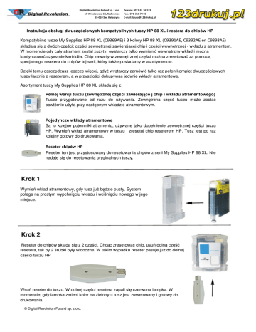 Digital Revolution Poland sp. z o.o. ul. Wrocławska 60, Radwanice 55-010 Św. Katarzyna Telefon: 071-31 16 123 Fax.: 071-311 70 03 E-mail: [email protected] Instrukcja obsługi dwuczęściowych kompatybilnych tuszy HP 88 XL i restera do chipów HP Kompatybilne tusze My Supplies HP 88 XL (C9369AE) i 3 kolory HP 88 XL (C9391AE, C9392AE en C9393AE) składają się z dwóch części: części zewnętrznej zawierającej chip i części wewnętrznej - wkładu z atramentem. W momencie gdy cały atrament został zużyty, wystarczy tylko wymienić wewnętrzny wkład i można kontynuować używanie kartridża. Chip zawarty w zewnętrznej części można zresetować za pomocą specjalnego resetera do chipów tej serii, który także posiadamy w asortymencie. Dzięki temu oszczędzasz jeszcze więcej, gdyż wystarczy zamówić tylko raz pełen komplet dwuczęściowych tuszy łącznie z reseterem, a w przyszłości dokupywać jedynie wkłady atramentowe. Asortyment tuszy My Supplies HP 88 XL składa się z: Pełnej wersji tuszu (zewnętrznej części zawierające j chip i wkładu atramentowego) Tusze przygotowane od razu do używania. Zewnętrzna część tuszu może zostać powtórnie użyta przy następnym wkładzie atramentowym. Pojedyncze wkłady atramentowe Są to kolejne pojemniki atramentu, używane jako dopełnienie zewnętrznej części tuszu HP. Wymień wkład atramentowy w tuszu i zresetuj chip reseterem HP. Tusz jest po raz kolejny gotowy do drukowania. Reseter chipów HP Reseter ten jest przystosowany do resetowania chipów z serii My Supplies HP 88 XL. Nie nadaje się do resetowania oryginalnych tuszy. Krok 1 Wymień wkład atramentowy, gdy tusz już będzie pusty. System polega na prostym wypchnięciu wkładu i wciśnięciu nowego w jego miejsce. Krok 2 Reseter do chipów składa się z 2 części. Chcąc zresetować chip, usuń dolną część resetera, tak by 2 śrubki były widoczne. W takim wypadku reseter pasuje już do dolnej części tuszu HP Wsuń reseter do tuszu. W dolnej części resetera zapali się czerwona lampka. W momencie, gdy lampka zmieni kolor na zielony – tusz jest zresetowany i gotowy do drukowania. © Digital Revolution Poland sp. z o.o.