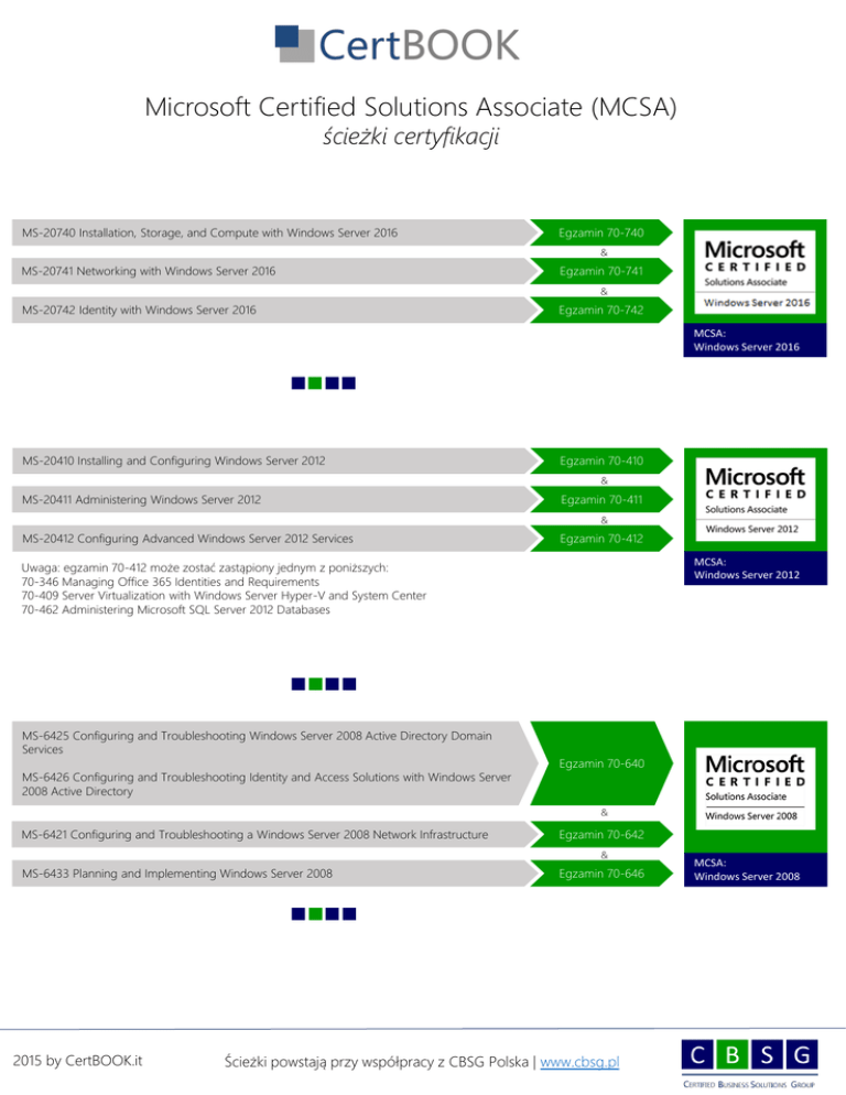 Microsoft Certified Solutions Associate (MCSA) ścieżki certyfikacji MS-20740 Installation, Storage, and Compute with Windows Server 2016 Egzamin 70-740 & MS-20741 Networking with Windows Server 2016 Egzamin 70-741 & MS-20742 Identity with Windows Server 2016 Egzamin 70-742 MCSA: Windows Server 2016 MS-20410 Installing and Configuring Windows Server 2012 Egzamin 70-410 MS-20411 Administering Windows Server 2012 Egzamin 70-411 & & MS-20412 Configuring Advanced Windows Server 2012 Services Egzamin 70-412 MCSA: Windows Server 2012 Uwaga: egzamin 70-412 może zostać zastąpiony jednym z poniższych: 70-346 Managing Office 365 Identities and Requirements 70-409 Server Virtualization with Windows Server Hyper-V and System Center 70-462 Administering Microsoft SQL Server 2012 Databases MS-6425 Configuring and Troubleshooting Windows Server 2008 Active Directory Domain Services MS-6426 Configuring and Troubleshooting Identity and Access Solutions with Windows Server 2008 Active Directory Egzamin 70-640 & MS-6421 Configuring and Troubleshooting a Windows Server 2008 Network Infrastructure Egzamin 70-642 & MS-6433 Planning and Implementing Windows Server 2008 2015 by CertBOOK.it Egzamin 70-646 Ścieżki powstają przy współpracy z CBSG Polska | www.cbsg.pl MCSA: Windows Server 2008 Microsoft Certified Solutions Associate (MCSA) ścieżki certyfikacji MS-20761 Querying Data with Transact-SQL Egzamin 70-761 & MS-20762 Developing SQL Databases Egzamin 70-762 MCSA: SQL 2016 Database Development MS-20764 Administering a SQL Database Infrastructure Egzamin 70-764 MS-20765 Provisioning SQL Databases Egzamin 70-765 & MCSA: SQL 2016 Database Administration MS-20767 Implementing a SQL Data Warehouse Egzamin 70-767 & MS-20768 Developing SQL Data Models Egzamin 70-768 MCSA: SQL 2016 Business Intelligence Development 2015 by CertBOOK.it Ścieżki powstają przy współpracy z CBSG Polska | www.cbsg.pl Microsoft Certified Solutions Associate (MCSA) ścieżki certyfikacji MS-20461 Querying Microsoft SQL Server 2012/2014 Egzamin 70-461 & MS-20462 Administering Microsoft SQL Server Databases 2012/2014 Egzamin 70-462 & MS-20463 Implementing a Data Warehouse with Microsoft SQL Server 2012/2014 Egzamin 70-463 Uwaga: egzamin 70-463 może zostać zastąpiony jednym z poniższych: 70-411 Administering Windows Server 2012 70-412 Configuring Advanced Windows Server 2012 Services 70-417 Upgrading Your Skills to MCSA Windows Server 2012 70-483 Programming in C# MCSA: SQL Server 2012/2014 MCSA: SQL Server 2008 lub dowolny MCTS z zakresu SQL Server Egzamin 70-457 MS-20461 Querying Microsoft SQL Server 2012/2014 Egzamin 70-458 MS-20462 Administering Microsoft SQL Server Databases 2012/2014 MCSA: SQL Server 2012/2014 MS-20463 Implementing a Data Warehouse with Microsoft SQL Server 2012/2014 MS-6231 Maintaining a Microsoft SQL Server 2008 R2 Database MS-2778 Writing Queries Using Microsoft SQL Server 2008 Transact-SQL Egzamin 70-432 & MS-6234 Implementing and Maintaining Microsoft SQL Server 2008 Analysis Services MS-6235 Implementing and Maintaining Microsoft SQL Server 2008 Integration Services Egzamin 70-448 MS-6236 Implementing and Maintaining Microsoft SQL Server 2008 Reporting Services 2015 by CertBOOK.it Ścieżki powstają przy współpracy z CBSG Polska | www.cbsg.pl MCSA: SQL Server 2008 Microsoft Certified Solutions Associate (MCSA) ścieżki certyfikacji MS-20697-1 Installing and Configuring Windows 10 Egzamin 70-698 MS-20697-2 Deploying and Managing Windows 10 Using Enterprise Services Egzamin 70-697 MCSA: Windows 10 MCSA: Windows 8 MS-20697-1 Installing and Configuring Windows 10 Egzamin 70-697 MS-20697-2 Deploying and Managing Windows 10 Using Enterprise Services MCSA: Windows 10 MS-20687 Configuring Windows 8.1 Egzamin 70-687 & MS-20688 Supporting Windows 8.1 Egzamin 70-688 MCSA: Windows 8 2015 by CertBOOK.it Ścieżki powstają przy współpracy z CBSG Polska | www.cbsg.pl Microsoft Certified Solutions Associate (MCSA) ścieżki certyfikacji MS-20533 Implementing Microsoft Azure Infrastructure Solutions Egzamin 70-533 & LFS201 Essentials of Linux System Administration Egzamin LFCS MCSA: Linux on Azure MS-20346 Managing Office 365 Identities and Services Egzamin 70-346 MS-20347 Enabling and Managing Office 365 Egzamin 70-347 & MCSA: Office 365 2015 by CertBOOK.it Ścieżki powstają przy współpracy z CBSG Polska | www.cbsg.pl