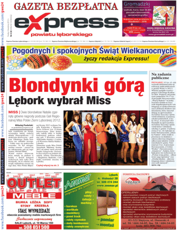 Środa, 4 kwietnia 2012 r. Nr 5 (5) NAKŁAD 10 000 EGZ. Express Powiatu Lęborskiego tel. 533 903 900 | tel. 791 980 155 Express Powiatu Wejherowskiego | tel. 791 980 155 Express Gdyński | tel. 791 764 155 Express Gdańsk Sopot | tel. 604 414 540 Express Powiatu Kartuskiego | tel. 501 226 085 Blondynki górą Lębork wybrał Miss MISS | Dwie blondwłose Natalie zgarnęły główne nagrody podczas Gali Regionalnej Miss Polski Ziemi Lęborskiej 2012. Mikołaj Podolski [email protected] Sala wypełniona po brzegi, wiwatujący ludzie, ciekawe układy choreograficzne i 22 atrakcyjne dziewczyny – podczas sobotniego finału konkursu nie zabrakło niczego. - Udało nam się praktycznie wszystko. To był niezapomniany wieczór – cieszył się po zakończeniu gali jej organizator, Michał Sałata. Wśród sześciu dziewcząt, które stanęły na podium w każdej z dwóch kategorii wiekowych, były tylko dwie blondynki, ale to właśnie one mogły najbardziej cieszyć się tego dnia. Miss Polski Błękit- nej Krainy 2012 wybrano Natalię Kujawską z Maszewa. Nowa królowa jest 22-letnią bizneswoman, która doskonale radziła sobie w każdej konkurencji podczas sobotniej gali. I Wicemiss została Aleksandra Hennig z Luzina, a II Wicemiss Halina Mańka z Lęborka. Natomiast tytułu Miss Polski Nastolatek Błękitnej Krainy 2012 od soboty może używać Natalia Szlagowska. Pozostałe dwa miejsca na podium obsadziły Jolanta Dawidowska i Magdalena Badulska. Cała trójka nastolatek mieszka w Lęborku. Czytaj więcej na str. 3 foto-wesele.eu www.facebook.com/gwe24 | www.facebook.com/gwe24 | www.facebook.com/gwe24 | www.facebook.com/gwe24 |www.facebook.com/gwe24 GAZETA BEZPŁATNA Na zadania publiczne PIENIĄDZE | 61 tys. zł - tyle wyniosło dofinansowanie na realizację zadań publicznych w gminie Wicko w 2012 r. Właśnie nastąpiło rozstrzygnięcie I Otwartego Konkursu Ofert. Wsparcie otrzymało sześć podmiotów. Po 17 tys. zł przypadło Stowarzyszeniu „Więcej Radości” na podejmowanie działań na rzecz osób niepełnosprawnych i ich integrację ze społeczeństwem oraz Łebskiemu Klubowi Jeździeckiemu, który otrzymał dotację na upowszechnianie kultury fizycznej i sportu wśród młodzieży za pomocą szkoleń jeździeckich. Z kolei 10 tys. zł otrzymał UKS Ekoludek na upowszechnianie kultury fizycznej i sportu wśród dzieci i młodzieży szkolnej w gminie. O połowę mniej (5 tys. zł) wpłynęło na konto Stowarzyszenia „Iskierka Nadziei”, które środki te przeznaczy na działania z zakresu aktywnej integracji i odkrywania talentów wśród mieszkańców gminy. Natomiast po 6 tys. zł przyznano Stowarzyszeniu „Uwolnić Wiedzę” i Stowarzyszeniu „Inicjatywa”. Zadania, które będą przez nie realizowane to „Poznaj swoją gminę – odkryj świat i jego tajemnicę” oraz „Działaj lokalnie – aktywna integracja dzieci i młodzieży oraz osób starszych”. oprac. mp www WYDARZENIA PODATKI | Trwająca od czterech lat akcja rozliczania PIT-ów, zainicjowana przez radną powiatu Agnieszkę Pujszę-Pomorską, w tym roku pobiła rekord. Zgłosiło się aż 90 osób. Przez pierwsze dwa lata radna dyżurowała razem z mamą Janiną w salce Parafii NMP Królowej Polski w Lęborku. Natomiast od poprzedniego roku, od kiedy to również w rozliczaniu pomaga Agnieszka Wieczorkiewicz, trójka księgowych Na zdjęciu Agnieszka przyjmowała chętnych Pujsza-Pomorska przy ul. Zwycięstwa 7. W tym roku panie dyżurowały w każdy wtorek łącznie dziewięćdziesięciu. od 21 lutego do 27 marca. - To rekord mojej inicjaty- Wśród podatników domi- wy – cieszy się radna. - To nowały PIT-y 37 w ramach także zasługa lokalnych rozliczenia małżonków. mediów i proboszczów paNajpopularniejsze odlirafii, którzy informowali o czenia to ulgi na dziecko możliwościach rozliczania i internet. Pojawiały się PIT-ów. Bywały dni, gdy również odliczenia na leki, na korytarzu kłębiło się krwiodawstwo, a także ponad 30 osób. W takim na sprzęt rehabilitacyjny. wypadku część rozliczeń Wymagały one dodatkozabierałyśmy do domu i wych obliczeń, zestawień i wydawałyśmy wypełnione ogólnie były czasochłonne za tydzień. – podsumowuje Agnieszka Co równie ważne, panie Pujsza-Pomorska. nie zapominały o jednym Łącznie odbyło się osiem procencie. Na przychodządwugodzinnych dyżuce osoby czekała lista orrów. Panie rozliczały też ganizacji pożytku publiczjednak zeznania w swoich nego, na które można było domach. przekazać 1% podatku. Z bezpłatnej pomocy moWśród obdarowanych dogła skorzystać każda osoba minowało lęborskie hospifizyczna z powiatu lęborcjum i indywidualne konta skiego, zwłaszcza starsza chorych dzieci z powiatu lub biedna. Ale księgowe lęborskiego. nie odmawiały nikomu, Organizatorki deklarują, że kto o to poprosił. Zdarzao ile starczy im zdrowia, to li się więc i mieszkańcy podobną akcję przeprowaŁęczyc czy Brzeźna Lędzą również za rok. borskiego. Chętnych było Oprac. mp Lęborski problem z kaszubskością KASZUBI | Choć coraz więcej osób przyznaje się do swoich kaszubskich korzeni, w powiecie lęborskim wciąż jest to duży problem. Mikołaj Podolski [email protected] Jak wynika z pierwszych danych z Narodowego Spisu Powszechnego, w Polsce mieszka niemal 230 tys. osób deklarujących kaszubską przynależność. 211 tys. utożsamia się zarówno z Polakami, jak i Kaszubami, zaś 17 tys. tylko z Kaszubami. Z jednej strony to duży sukces tej drugiej w kraju grupy etnicznej, z drugiej jednak działacze wciąż czują niedosyt. - Ten wynik dla nas nie jest wcale zły, ale moim zdaniem wciąż za mało osób przyznaje się do swoich korzeni – mówi Kazimierz Szweda, prezes lęborskiego oddziału Zrzeszenia Kaszubsko – Pomorskiego. I dodaje, że Kaszubów na samym Pomorzu jest około pół miliona. - Sam nim jestem z dziada pradziada i nie mam z tym żadnego problemu. Ale niektórzy niestety wciąż si