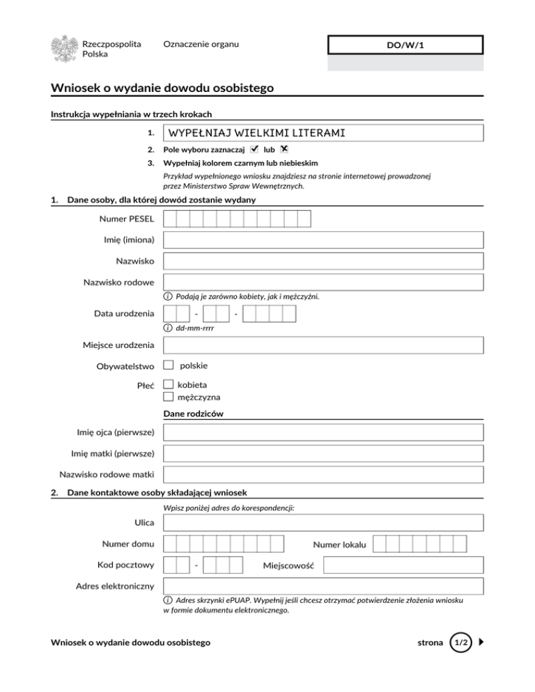 a Rzeczpospolita Polska Oznaczenie organu DO/W/1 Wniosek o wydanie dowodu osobistego Instrukcja wypełniania w trzech krokach 1. WYPEŁNIAJ WIELKIMI LITERAMI 2. Pole wyboru zaznaczaj z lub x 3. Wypełniaj kolorem czarnym lub niebieskim Przykład wypełnionego wniosku znajdziesz na stronie internetowej prowadzonej przez Ministerstwo Spraw Wewnętrznych. 1. Dane osoby, dla której dowód zostanie wydany Numer PESEL Imię (imiona) Nazwisko Nazwisko rodowe i Podają je zarówno kobiety, jak i mężczyźni. Data urodzenia - - i dd-mm-rrrr Miejsce urodzenia Obywatelstwo Płeć polskie kobieta mężczyzna Dane rodziców Imię ojca (pierwsze) Imię matki (pierwsze) Nazwisko rodowe matki 2. Dane kontaktowe osoby składającej wniosek Wpisz poniżej adres do korespondencji: Ulica Numer domu Kod pocztowy Numer lokalu - Miejscowość Adres elektroniczny i Adres skrzynki ePUAP. Wypełnij jeśli chcesz otrzymać potwierdzenie złożenia wniosku w formie dokumentu elektronicznego. Wniosek o wydanie dowodu osobistego strona o 1 /2 s Numer telefonu i Numer nie jest obowiązkowy, ale ułatwi kontakt w sprawie dowodu. Adres e-mail i E-mail nie jest obowiązkowy, ale ułatwi kontakt w sprawie dowodu. 3. Fotografia osoby, która ma otrzymać dowód Do wniosku dołącz jedną fotografię. 4. Powód ubiegania się o wydanie dowodu pierwszy dowód zmiana danych zawartych w dowodzie upływ terminu ważności dowodu utrata dowodu zmiana wizerunku twarzy uszkodzenie dowodu g f inny (wpisz jaki) 5. Oświadczenie, podpis Jeśli ktoś podaje nieprawdę lub zataja prawdę we wniosku, podlega karze pozbawienia wolności do lat 3. Oświadczam, że rozumiem odpowiedzialność karną za zatajenie prawdy lub podanie nieprawdy w tym wniosku. Potwierdzam własnoręcznym podpisem, że powyższe dane są prawdziwe. Podstawa prawna: art. 233 § 1 w związku z § 6 ustawy z dnia 6 czerwca 1997 r. Kodeks karny. Miejscowość Data - - i dd-mm-rrrr Własnoręczny czytelny podpis wnioskodawcy Adnotacje urzędowe (wypełnia urzędnik) Dane rodzica, opiekuna prawnego lub kuratora, jeśli składa wniosek o dowód w imieniu dziecka lub podopiecznego. Imię (imiona) Nazwisko Nazwa, seria i numer dokumentu tożsamości Sposób ustalenia tożsamości osoby ubiegającej się o wydanie dowodu. Adnotacje Wniosek o wydanie dowodu osobistego strona o 2 /2 a Rzeczpospolita Polska Oznaczenie organu DO/F/2 Formularz zgłoszenia utraty lub uszkodzenia dowodu osobistego Instrukcja wypełniania w trzech krokach 1. WYPEŁNIAJ WIELKIMI LITERAMI 2. Pole wyboru zaznaczaj z lub x 3. Wypełniaj kolorem czarnym lub niebieskim Przykład wypełnionego wniosku znajdziesz na stronie internetowej prowadzonej przez Ministerstwo Spraw Wewnętrznych. 1. Dane posiadacza utraconego lub uszkodzonego dowodu Imię (imiona) Nazwisko Nazwisko rodowe i Podają je zarówno kobiety, jak i mężczyźni. Data urodzenia - - i dd-mm-rrrr Miejsce urodzenia Dane rodziców Imię ojca (pierwsze) Imię matki (pierwsze) Nazwisko rodowe matki 2. Powód zgłoszenia Zaznacz powód zgłoszenia: utrata dowodu uszkodzenie dowodu Seria i numer utraconego lub uszkodzonego dowodu i Jeśli nie znasz tych danych, pozostaw puste pole. Formularz zgłoszenia utraty lub uszkodzenia dowodu osobistego strona o 1 /2 s Wypełnij w przypadku zaznaczenia opcji „uszkodzenie dowodu”. Uszkodzony dowód osobisty: został przekazany zostanie przekazany osobiście pocztą 3. Wniosek o wydanie zaświadczenia o zgłoszeniu utraty lub uszkodzenia dowodu Wypełnij ten punkt tylko, jeśli jesteś poza granicami kraju i składasz wniosek pocztą lub faksem. Zaznacz, jak chcesz odebrać zaświadczenie: osobiście na piśmie pocztą na piśmie Wpisz adres korespondencyjny, jeśli chcesz otrzymać zaświadczenie pocztą. Ulica Numer domu Kod pocztowy 4. Numer lokalu - Miejscowość Pouczenie Zgłoszenie utraty dowodu osobistego powoduje jego unieważnienie. W przypadku odnalezienia zgłoszonego dowodu nie można się nim posługiwać. 5. Podpis osoby, która zgłasza utratę lub uszkodzenie dowodu Data - - i dd-mm-rrrr Własnoręczny czytelny podpis osoby, która zgłasza utratę lub uszkodzenie dowodu Formularz zgłoszenia utraty lub uszkodzenia dowodu osobistego strona o 2 /2
