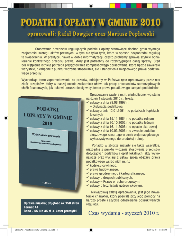 PODATKI I OPŁATY W GMINIE 2010 opracowali: Rafał Dowgier oraz Mariusz Popławski Stosowanie przepisów regulujących podatki i opłaty stanowiące dochód gmin wymaga znajomości szeregu aktów prawnych, w tym nie tylko tych, które w sposób bezpośredni regulują te świadczenia. W praktyce, nawet w dobie informatyzacji, często problemy sprawia szybkie odnalezienie konkretnego przepisu prawa, który jest potrzebny do rozstrzygnięcia danej sprawy. Stąd bez wątpienia istnieje potrzeba przygotowania kompleksowego opracowania, które będzie zawierało wszystkie, niezbędne z punktu widzenia stosowania, ale i stanowienia miejscowego prawa podatkowego przepisy. Wychodząc temu zapotrzebowaniu na przeciw, oddajemy w Państwa ręce opracowany przez nas zbiór przepisów, który w naszej ocenie znakomicie ułatwi tak pracę pracowników samorządowych służb finansowych, jak i ułatwi poruszanie się w systemie prawa podatkowego samych podatników. Opracowanie zawiera m.in. ujednolicone, wg stanu na dzień 1 stycznia 2010 r., teksty: ustawy z dnia 29.08.1997 r. – Ordynacja podatkowa ustawy z dnia 12.01.1991 r. o podatkach i opłatach lokalnych ustawy z dnia 15.11.1984 r. o podatku rolnym ustawy z dnia 30.10.2002 r. o podatku leśnym ustawy z dnia 16.11.2006 r. o opłacie skarbowej ustawy z dnia 10.03.2006 r. o zwrocie podatku akcyzowego zawartego w cenie oleju napędowego wykorzystywanego do produkcji rolnej. Ponadto w zbiorze znalazły się także wszystkie, niezbędne z punktu widzenia stosowania przepisów dotyczących podatków i opłat lokalnych, akty wykonawcze oraz wyciągi z ustaw spoza obszaru prawa podatkowego wśród nich m.in.: kodeksu cywilnego, prawa budowlanego, prawa geodezyjnego i kartograficznego, ustawy o drogach publicznych, ustawy – Prawo o ruchu drogowym, ustawy o lecznictwie uzdrowiskowym. Niewątpliwą zaletą opracowania, jest jego nowatorski charakter, który pozwala przy jego pomocy na bardzo proste i szybkie odnalezienie poszukiwanych ok.150 stron Oprawa miękka; Objętość regulacji. Format A4 Cena - 55 lub 35 zł + koszt przesyłki Czas wydania - styczeń 2010 r. ulotkaA5_Podatki i opłaty Gminne_7a.indd 1 2009-12-01 11:01:48 Z AMAWIAM Nazwa instytucji ........................................................................................................ Adres: ................................................................................... Kod: ........................... Miejscowość: ........................................................................ Woj.: .......................... NIP .........................................................................tel.: (.......) ................................. e-mail: ............................................................ Data: ............................... ► ► Jesteśmy płatnikiem VAT ► Wyrażamy zgodę na umieszczenie naszych danych w bazie TAXPRESS oraz TAK NIE Upoważniamy Wydawnictwo TAXPRESS do wystawienia faktury VAT bez naszego podpisu. korzystanie z nich i przetwarzanie w celach marketingowych i promocyjnych. Płatności prosimy regulować na podstawie faktury sprzedaży. Koszty przesyłki pokrywa nabywca. W cenę wliczony jest VAT. Nazwa Podatki i opłaty w gminie 2010 Ilość Cena Wartość 55 zł * 35 zł ** * dla prenumeratorów “Przeglądu Podatków Lokalnych i Finansów Samorządowych” 10 % rabatu. ** dla uczestników szkoleń z zakresu "Wymiar podatków lokalnych ... w 2010r." ................................................... Zamawiajacy ................................................... Pieczątka Wypełnione zamówienie prosimy przesłać na adres firmy: Wydawnictwo TAXPRESS s.c. Al. Stanów Zjednoczonych 51 lok. 517, 04-028 Warszawa lub faxem: 022 44 87 122; tel.: 022 517 78 00 www.taxpress.com.pl, www.taxpress.pl, www.pomocpubliczna.com ulotkaA5_Podatki i opłaty Gminne_7a.indd 2 2009-12-01 11:01:48