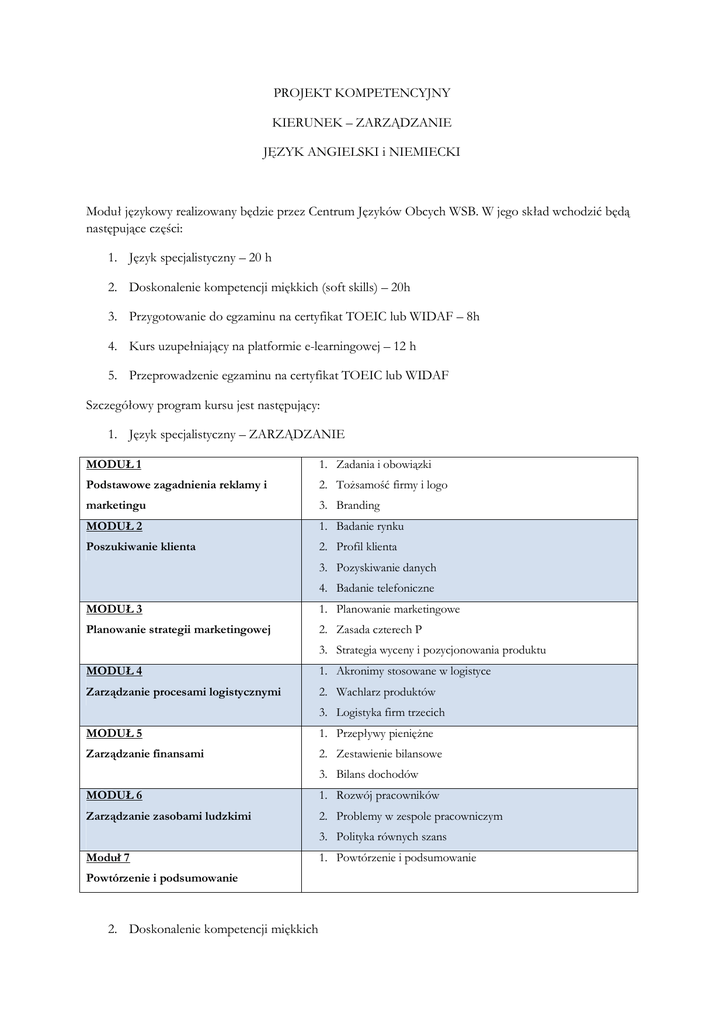 PROJEKT KOMPETENCYJNY KIERUNEK – ZARZĄDZANIE JĘZYK ANGIELSKI i NIEMIECKI Moduł językowy realizowany będzie przez Centrum Języków Obcych WSB. W jego skład wchodzić będą następujące części: 1. Język specjalistyczny – 20 h 2. Doskonalenie kompetencji miękkich (soft skills) – 20h 3. Przygotowanie do egzaminu na certyfikat TOEIC lub WIDAF – 8h 4. Kurs uzupełniający na platformie e-learningowej – 12 h 5. Przeprowadzenie egzaminu na certyfikat TOEIC lub WIDAF Szczegółowy program kursu jest następujący: 1. Język specjalistyczny – ZARZĄDZANIE MODUŁ 1 1. Zadania i obowiązki Podstawowe zagadnienia reklamy i 2. Tożsamość firmy i logo marketingu 3. Branding MODUŁ 2 1. Badanie rynku Poszukiwanie klienta 2. Profil klienta 3. Pozyskiwanie danych 4. Badanie telefoniczne MODUŁ 3 1. Planowanie marketingowe Planowanie strategii marketingowej 2. Zasada czterech P 3. Strategia wyceny i pozycjonowania produktu MODUŁ 4 1. Akronimy stosowane w logistyce Zarządzanie procesami logistycznymi 2. Wachlarz produktów 3. Logistyka firm trzecich MODUŁ 5 1. Przepływy pieniężne Zarządzanie finansami 2. Zestawienie bilansowe 3. Bilans dochodów MODUŁ 6 1. Rozwój pracowników Zarządzanie zasobami ludzkimi 2. Problemy w zespole pracowniczym 3. Polityka równych szans Moduł 7 Powtórzenie i podsumowanie 2. Doskonalenie kompetencji miękkich 1. Powtórzenie i podsumowanie MODUŁ 1 1. Nawiązywanie kontaktu Spotkania biznesowo - towarzyskie 2. Przywitanie 3. Prowadzenie formalnej i nieformalnej rozmowy 4. Spotkanie biznesowe w restauracji 5. Sesja networkingowa MODUŁ 2 1. Efektywne negocjacje Negocjacje 2. Wizyta w firmie 3. Style negocjacyjne 4. Zasada win-win w negocjacjach MODUŁ 3 1. Rozpoczynanie prezentacji, plan Prezentacje i wypowiedzi publiczne 2. Opis trendów, wykresów, prognozy 3. Kończenie prezentacji, podsumowanie 4. Konstruowanie pytań i odpowiedzi MODUŁ 4 1. Budowa i język CV CV i rozmowa o pracę 2. Rozmowa rekrutacyjna, pytania i odpowiedzi 3. Język ciała 4. Sposoby radzenia sobie ze stresem MODUŁ 5 1. Powtórzenie i podsumowanie Powtórzenie i podsumowanie 3. Przygotowanie do egzaminu na certyfikat: TOEIC lub WIDAF 1. Przygotowanie do egzaminu na certyfikat TOEIC lub WIDAF. 2. Platforma e-learningowa: PLATFORMA E-LEARNINGOWA 1. Powtórzenie gramatyki 2. Czytanie 3. Słuchanie 4. Zadania i testy powtórkowe Serdecznie zapraszamy do udziału w projekcie Zespół Centrum Języków Obcych WSB