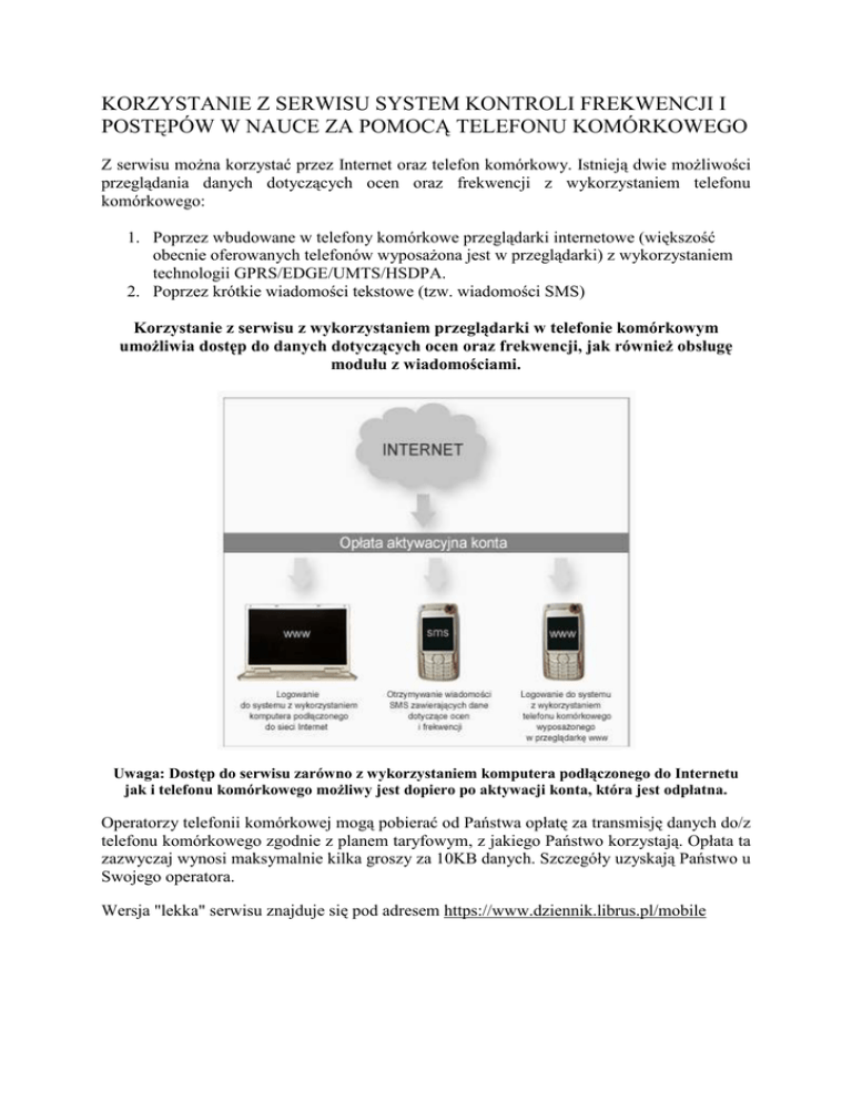 KORZYSTANIE Z SERWISU SYSTEM KONTROLI FREKWENCJI I POSTĘPÓW W NAUCE ZA POMOCĄ TELEFONU KOMÓRKOWEGO Z serwisu moŜna korzystać przez Internet oraz telefon komórkowy. Istnieją dwie moŜliwości przeglądania danych dotyczących ocen oraz frekwencji z wykorzystaniem telefonu komórkowego: 1. Poprzez wbudowane w telefony komórkowe przeglądarki internetowe (większość obecnie oferowanych telefonów wyposaŜona jest w przeglądarki) z wykorzystaniem technologii GPRS/EDGE/UMTS/HSDPA. 2. Poprzez krótkie wiadomości tekstowe (tzw. wiadomości SMS) Korzystanie z serwisu z wykorzystaniem przeglądarki w telefonie komórkowym umoŜliwia dostęp do danych dotyczących ocen oraz frekwencji, jak równieŜ obsługę modułu z wiadomościami. Uwaga: Dostęp do serwisu zarówno z wykorzystaniem komputera podłączonego do Internetu jak i telefonu komórkowego moŜliwy jest dopiero po aktywacji konta, która jest odpłatna. Operatorzy telefonii komórkowej mogą pobierać od Państwa opłatę za transmisję danych do/z telefonu komórkowego zgodnie z planem taryfowym, z jakiego Państwo korzystają. Opłata ta zazwyczaj wynosi maksymalnie kilka groszy za 10KB danych. Szczegóły uzyskają Państwo u Swojego operatora. Wersja "lekka" serwisu znajduje się pod adresem https://www.dziennik.librus.pl/mobile Funkcje serwisu związane z konfiguracją konta jak i moŜliwość opłacania dostępu do serwisu są dostępne tylko po zalogowaniu do tradycyjnej części serwisu dostępnej pod adresem https://www.dziennik.librus.pl Usługa SMSInfo świadczona jest tylko na krajowe numery telefonów komórkowych. Ilość wysłanych jednorazowo wiadomości SMS jest zaleŜna od ilości nieobecności oraz ocen, które uczeń uzyskał oraz od konfiguracji usługi (raz dziennie/raz w tygodniu). W przypadku duŜej ilości danych moŜe wystąpić sytuacja, Ŝe raport z ocenami i/lub nieobecnościami zostanie podzielony na większą liczbę SMS-ów, co zwiększy koszt jego wysłania. W wiadomości SMS wysyłane są dane, które zostały wprowadzone do systemu w czasie odpowiadającym okresowi za jaki wiadomość jest wysyłana. JeŜeli Państwa dziecko nie przyjdzie do szkoły np. we wtorek i nauczyciel wprowadzi tę informacje w ten sam dzień, powiadomienie otrzymają Państwo równieŜ we wtorek. JeŜeli jednak nauczyciel wprowadzi do systemu tę informację dopiero w środę, nieobecność ta zostanie ujęta dopiero w środowym raporcie (oczywiście pod warunkiem odpowiedniego skonfigurowania usługi – raport raz dziennie) Usługa SMSinfo działa na zasadzie przedpłaty (pre-paid) tzn. Ŝe najpierw naleŜy wykupić pakiet sms-ów, z którego później korzysta się do czasu wykorzystania wszystkich sms-ów Ilość sms-ów w pakiecie 50 sms 100 sms 150 sms Opłata za wykup pakietu 17zł 30 zł 43 zł UWAGA! Doładowanie konta SMS zostanie zrealizowane w momencie zaksięgowania wpłaty na koncie firmy. Podczas aktywowania usługi SMSinfo naleŜy dostosować funkcje usługi do własnych potrzeb (konfiguracja modułu): 1. Wybrać numer telefonu, na który przesyłane będą wiadomości SMS z danymi o ocenach i frekwencji. MoŜna zaznaczyć dwa numery telefonów. W tym przypadku informacja zostanie przesłana jednocześnie na oba numery telefonów (zostanie odjęta równieŜ podwójna ilość sms-ów z pakietu). 2. MoŜna wybrać wysyłanie sms-ów z informacjami w trybie tygodniowym (raz w tygodniu) lub codziennym. System wymaga równieŜ określenia godziny wysłania wiadomości z danymi. Jeśli wybierzemy wysyłanie sms-ów codziennie po godzinie 11 wtedy w środę otrzymamy sms z informacjami, które zostały wprowadzone do systemu od wtorku godz. 11.01 do środy do godz. 11.00. 3. Im większa ilość danych tym więcej sms-ów jest wysyłanych jednorazowo, dlatego kaŜdy rodzic moŜe wybrać czy chce otrzymywać informacje tylko o ocenach czy o frekwencji lub łącznie. KaŜdy sms wysłany przez system jest odejmowany od ilości sms-ów w pakiecie. Aby umoŜliwić Państwu lepszą kontrolę nad ilością sms-ów w pakiecie system powiadamia o zerowym stanie konta z wyprzedzeniem (tzn. kiedy zostaje na koncie 5-7 smsów). MoŜna wybrać funkcję powiadamiania poprzez sms (przy czym wtedy sms z powiadomieniem jest równieŜ odliczany od puli sms-ów w pakiecie) lub jako wiadomość wysłaną na skrzynkę pocztową email.