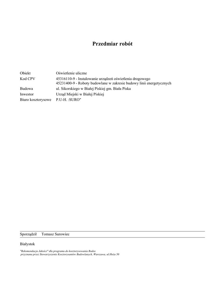Przedmiar robót Obiekt Kod CPV Budowa Inwestor Biuro kosztorysowe Sporządził Oświetlenie uliczne 45316110-9 - Instalowanie urządzeń oświetlenia drogowego 45231400-9 - Roboty budowlane w zakresie budowy linii energetycznych ul. Sikorskiego w Białej Piskiej gm. Biała Piska Urząd Miejski w Białej Piskiej P.U-H. :SURO" Tomasz Surowiec Białystok "Rekomendacja Jakości" dla programu do kosztorysowania Rodos przyznana przez Stowarzyszenie Kosztorysantów Budowlanych, Warszawa, ul.HoŜa 50 Rodos 6.8.3.2 [9051] Strona 2/4 Tabela przedmiaru robót Oświetlenie uliczne Nr Podstawa Nr ST 1 KNR 2-01 0701.2/02 Opis robót 2. Ciąg od ul. Sikorskiego 2.1. Oświetlenie uliczne Kod CPV: 45316110-9 Ręczne kopanie rowów kablowych o głębokości do 0,8m i szerokości dna do 0,4m w gruncie kategorii III 2 KNR 2-01 0704.2/02 Ręczne zasypywanie rowów kablowych o głębokości do 0,6m i szerokości dna do 0,4m w gruncie kategorii III 3 KNNR N005-0706 010 Nasypanie warstwy piasku na dnie rowu kablowego o szerokości do 0,4 m 4 KNNR 5 0707.1/02 Ręczne układanie kabli o masie do 1kg/m w rowach kablowych z przykryciem folią kalandrowaną z PCW uplastycznionego - YAKXs 4x35 5 KNNR 5 1005/01 MontaŜ osłony stalowej ocynkowanej OSK 6 KNNR 5 0906/03 MontaŜ ogranicznika przepięć w liniach napowietrznych NN z przewodów izolowanych ASA-A-500-5B+F1+K 7 KNNR 5 0717/02 Układanie kabli o masie do 1kg/m bezpośrednio na słupie betonowym - YAKXs 4x35 8 KNNR 5 0714/02 Układanie kabli o masie do 1kg/m w budynkach, budowlach lub na estakadach bez mocowania YAKXs 4x35 9 KNNR N005-0412 060 10 KNNR 5 1001/01 MontaŜ i stawianie słupów oświetleniowych o masie do 100kg - słup dł 4m ocynkowany ośmiokątny z 11 KNNR 5 1003/01 MontaŜ przewodów do opraw oświetleniowych wciąganych w słupy, rury osłonowe i wysięgniki przy wysokości latarni bez wysięgnika do 4m 12 KNNR 5 1004/02 MontaŜ opraw oświetlenia zewnętrznego na wysięgniku -CLIMA 70W 13 KNNR 5 1006/01 MontaŜ tablic bezpiecznikowych wnękowych 14 KNNR 5 0603/01 MontaŜ przewodów uziemiających i wyrównawczych w kanałach lub tunelach luzem - bednarka ocynkowana 25x3 mm 15 KNNR 5 0602/04 MontaŜ przewodów uziemiających i wyrównawczych ułoŜonych luzem w budynkach - bednarka ocynkowana 25x3 mm 16 KNNR N005-0605 020 MontaŜ bednarki FeZn 25x4 z wykopaniem rowu zasypaniem i zagęszeniem 17 KNNR N005-0606 05010 Uziomy o długości 4,5 m typu GALMAR 5/8" 18 KNNR N005-0606 060 Uziomy - za kaŜde następne 1,5 m długości, ze stali profilowanej miedziowane (metoda wykonania udarowa) z zastosowaniem młota udarowego. Kategoria gruntu III 19 KNNR 5 0726/10 20 AW- 21 KNNR N005-1302 030 Jm Ilość m 83,000 m 83,000 m 166,000 m 83,000 m 2,500 szt 3,000 m 10,000 m 12,000 szt 6,000 szt 6,000 kpl 6,000 szt 6,000 szt 6,000 m 83,000 m 10,000 m 12,000 szt 3,000 szt 9,000 szt 13,000 kpl 1,000 odcinek 6,000 MontaŜ fundamentów pod słup oswietleniowy - pozycja adoptowana Zarobienie końca kabla 5-Ŝyłowego o przekroju Ŝył do 50mm2 na napięcie do 1kV o izolacji i powłoce z tworzyw sztucznych Projekt organizacji ruchu i obsługa geodezyjna Badanie linii kablowej niskiego napięcia. Kabel N.N. o ilości Ŝył - 4 Rodos 6.8.3.2 [9051] Strona 3/4 Tabela przedmiaru robót Oświetlenie uliczne Nr Podstawa 22 KNNR 5 1301/01 Nr ST Opis robót Sprawdzenie i pomiar obwodu elektrycznego 1-fazowego niskiego napięcia 23 KNNR N005-1304 050 24 KNNR 5 1302/02 Badanie i pomiar impedancji pętli zwarcia 25 KNNR 5 1302/03 Badanie i pomiar pętli zwarcia 26 Kalkulacja własna Jm Ilość pomiar 1,000 szt 1,000 odcinek 11,000 odcinek 1,000 Badania i pomiary skuteczności zerowania, pomiar pierwszy Obsługa geodezyjna 1,000 2. Szafka oświetleniowa i zasilanie Kod CPV: 45231400-9 MontaŜ fundamentu z Ŝywic poliestrowych o objętości w wykopie do 0,15m3 w gruncie kategorii III pod rozdzielnice 27 KNNR 5 0412/05 28 KNNR 5 0401/01 MontaŜ złącza kablowego ZK1(+ szafka oświetleniowa) RO 29 KNNR 5 0714/02 Układanie kabla w ZK-1 i w stacji YAKXs 4x70 30 KNNR 5 0714/03 Układanie kabli o masie do 2kg/m w budynkach, budowlach lub na estakadach bez mocowania ukłądanie istniejacego kabla oświetleniowego w budynku staji oraz w złaczu - YAKXs 4x70 31 KNNR 5 0726/10 Zarobienie końca kabla 4-Ŝyłowego YAKXs 4x70mm2 na napięcie do 1kV o izolacji i powłoce z tworzyw sztucznych 32 KNNR 5 0606/05 MontaŜ uziomów o długości 4,5m ze stali profilowanej miedziowanej metodą udarową w gruncie kategorii III 33 KNNR 5 0606/06 MontaŜ uziomów ze stali profilowanej miedziowanej metodą udarową w gruncie kategorii III - za następne 1,5m długości uziomu 34 KNNR 5 1302/03 Badanie linii kablowej 4 Ŝyłowej niskiego napięcia 35 KNNR 5 1302/03 Badanie i pomiar pętli zwarcia 36 KNNR 5 0406/01 MontaŜ aparatów elektrycznych o masie do 2,5kg -Wkąłdki WT1-gG100 szt 1,000 kpl 1,000 m 8,000 m 6,000 szt 3,000 szt 1,000 szt 3,000 odcinek 2,000 odcinek 1,000 szt 3,000 Rodos 6.8.3.2 [9051] Spis działów przedmiaru robót Oświetlenie uliczne Nr Opis robót 2. Ciąg od ul. Sikorskiego 2.1. Oświetlenie uliczne Kod CPV: 45316110-9 2. Szafka oświetleniowa i zasilanie Kod CPV: 45231400-9 Strona 4/4 Przedmiar robót Obiekt Kod CPV Budowa Inwestor Biuro kosztorysowe Sporządził Oświetlenie uliczne 45316110-9 - Instalowanie urządzeń oświetlenia drogowego 45231400-9 - Roboty budowlane w zakresie budowy linii energetycznych ul. Konopnickiej w Białej Piskiej Urząd Miejski w Białej Piskiej P.U-H. :SURO" Tomasz Surowiec Białystok "Rekomendacja Jakości" dla programu do kosztorysowania Rodos przyznana przez Stowarzyszenie Kosztorysantów Budowlanych, Warszawa, ul.HoŜa 50 Rodos 6.8.3.2 [9051] Strona 2/4 Tabela przedmiaru robót Oświetlenie uliczne Nr Podstawa Nr ST 1 KNR 2-01 0701.2/02 Opis robót 1. Ciąg od ul. Konopnickiej 1.1. Oświetlenie uliczne Kod CPV: 45316110-9 Ręczne kopanie rowów kablowych o głębokości do 0,8m i szerokości dna do 0,4m w gruncie kategorii III 2 KNR 2-