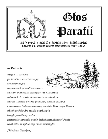 Głos Parafii NR 7 (115) ROK X LIPIEC 2012 BIERZGŁOWO PARAFIA PW. WNIEBOWZIĘCIA NAJŚWIĘTSZEJ MARYI PANNY w Tatrach stojąc w wodzie po kostki nieruchomiejąc wabiłem rybę wyszedłeś powoli zza grani białym obłokiem stanąłeś na Kazalnicy mówiłeś do mnie cichutko bezszelestnie naraz wzdłuż ściany pionowy ludzki skowyt i czerwone kola na ciemnej wodzie Czarnego Stawu obłok znikł ryba nagle odpłynęła krzyk powtórzył echo pozostało pytanie gdzie byłeś prawdziwiej Panie w obłoku w rybie czy może w krzyku /Wacław Oszajca/ – LIPCOWE KALENDARIUM – 01 lipca Liturgia niedzielna – XIII Niedziela Zwykła 02 lipca Wyjazd dzieci do Aquaparku w Wielkiej Nieszawce i do ogrodu zoobotanicznego w Toruniu 03 lipca Wspomnienie św. Tomasza Apostoła 04 lipca Wycieczka dzieci do Gdyni i podróż tramwajem wodnym na Hel 05 lipca Wspomnienie św. Marii Goretti, patronki młodzieży 06 lipca Wspomnienie bł. Marii Teresy Ledóchowskiej – Pierwszy piątek miesiąca – Ks. proboszcz odwiedza chorych 08 lipca Liturgia niedzielna – XIV Niedziela Zwykła 11 lipca Wspomnienie św. Benedykta, patrona Europy 13 lipca Wspomnienie św. Andrzeja Świerada i św. Benedykta, pustelników 14 lipca Wspomnienie św. Kamila, patrona szpitali, chorych i pielęgniarek 15 lipca Liturgia niedzielna – XV Niedziela Zwykła – Dzień bez Telefonu Komórkowego 16 lipca Wspomnienie Najświętszej Maryi Panny z Góry Karmel (Szkaplerznej) 18 lipca Wspomnienie św. Szymona z Lipnicy 20 lipca Wspomnienie bł. Czesława 21 lipca Wspomnienie św. Wawrzyńca 22 lipca Liturgia niedzielna – XVI Niedziela Zwykła – Wspomnienie św. Marii Magdaleny 23 lipca Wspomnienie św. Brygidy, patronki Europy 24 lipca Wspomnienie św. Kingi – Dzień Policjanta 25 lipca Wspomnienie św. Jakuba Apostoła – Wspomnienie św. Krzysztofa, patrona kierowców – Dzień Bezpiecznego Kierowcy 26 lipca Wspomnienie św. Joachima i św. Anny, rodziców Maryi 29 lipca Liturgia niedzielna – XVII Niedziela Zwykła – Wspomnienie św. Marty – Poświęcenie nowych lub nowo nabytych pojazdów (po Sumie) 30 lipca Wyjazd dzieci do sanktuarium Matki Bożej Bolesnej w Licheniu 31 lipca Wspomnienie św. Ignacego Loyoli Elżbieta Giersz -2- – Z ŻYCIA PARAFII – WYCIECZKI WAKACYJNE Po zakończeniu roku szkolnego i katechetycznego wyjeżdżamy na wycieczki. Na powitanie wakacji, w poniedziałek 2 lipca czeka nas wyjazd do Aquaparku w Wielkiej Nieszawce i do ogrodu botanicznego w Toruniu (mamy dofinansowanie, plus 25 zł), a następnie 4 lipca do Gdyni, z przejazdem tramwajem wodnym na Hel (dopłata 40 zł). Trzecia wyprawa odbędzie się 30 lipca – wyjazd do sanktuarium w Licheniu (dopłata 30 zł). Rodzice mogą zgłaszać dzieci do p. Hanny Jaworskiej w Bierzgłowie. PRACE REMONTOWE Umocowaliśmy z prawej strony, od strony okien kościoła, dwa nowe stelaże pod feretrony. Na jednym stoi feretron św. Rozalii i św. Rocha. Drugi czeka na feretron, który będziemy konserwowali w następnym roku. Jedna praca pociąga drugą. Teraz obraz św. Barbary domaga się zaprojektowania pięknej ramy i powieszenia powyżej feretronów. Trwają prace remontowe przy chodniku wokół i przed kościołem. Chodnik wokół kościoła jest już zrobiony. W piątek – 15 czerwca – w uroczystość Najświętszego Serca Pana Jezusa, po nowym chodniku odprawiliśmy procesję eucharystyczną. Potem wiele osób podchodziło i mówiło, że nie sądziło, iż efekt będzie taki wspaniały. Chodnik równy, że nawet w cienkich butach można swobodnie chodzić. Dziękuję za życzliwość. Patrząc z dystansu, z pewnej odległości, z cmentarza na chodnik i kościół widać harmonię zabytkowej świątyni i kamiennego chodnika. Przy chodniku nasypano już brzegi, posiano trawę. Zrobiono także kamienne dojście do zakrystii. Zrobione zostaną również kamienne rynny odprowadzające wodę od murów kościoła. Wykonanych zostało 160 m2. Firmie jesteśmy winni 13 tys. zł. Część zapłaciłem w minionym tygodniu z dochodu Festynu oraz z ofiar składanych na prace remontowe. Bóg zapłać za ofiary składane przez rodziny. Dziękuję za ofiarowane i przywożone kamienie. W poniedziałek i wtorek – 18 i 19 czerwca – zerwaliśmy stary beton i warstwę gliny sprzed kościoła oraz nawieźliśmy piasek. W tygodniu (między 18 a 23 czerwca) prace układania kamienia nie posunęły się zbytnio ze względu na ciągłe opady deszczu. Wykonując nową nawierzchnię na terenie przed kościołem pragniemy jej nadać formę placu. Teren zostanie powiększony, aby łatwiej można było gromadzić parafian i gości w czasie odpustu parafialnego. Na placu zostanie -3- uformowana rozeta z kamieni o innym kolorze. W katedrach gotyckich, na frontonie, była umieszczana rozeta. Nawiązujemy do tego, ponieważ nasz kościółek jest zbudowany w czasach gotyku. Bóg zapłać za pomoc, za maszyny, paniom za przesadzenie krzewów, które po remoncie wrócą pod krzyż. POLSCY PIŁKARZE NIE WSTYDZĄ SIĘ WIARY Kilka miesięcy temu kapitan reprezentacji Polski Jakub Błaszczykowski dołączył do akcji „Nie wstydzę się Jezusa”. Niedawno breloczek z takim hasłem promował również inny gwiazdor naszej kadry – Robert Lewandowski. W osłupienie milionów widzów wprawił bohater spotkania Polska – Grecja – Przemysław Tytoń, który zaraz po wejściu na boisku odmówił modlitwę i... obronił rzut karny. Warto docenić fakt, że osoby, które są na ustach milionów Polaków odważnie podkreślają swój katolicyzm. Jakub Błaszczykowski „Kuba”, odważył się powiedzieć przed kamerą, że nie wstydzi się Jezusa. Kapitan naszej reprezentacji wielokrotnie podkreślał, że babcia wychowała go na religijnego człowieka. A warto pamiętać, że droga Błaszczykowskiego na piłkarski szczyt była bardzo kręta i często wiodła przez ciernie. Dzięki wsparciu babci i brata matki, nie zrezygnował z futbolu, a jego kariera rozwijała się imponuj
