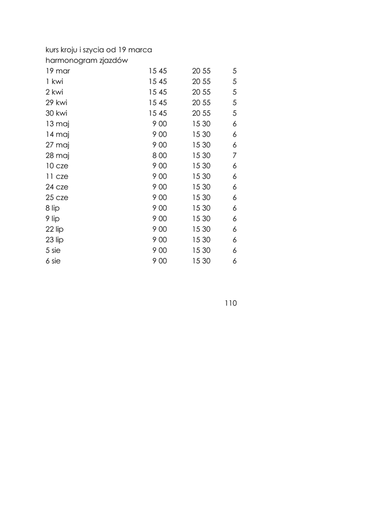 kurs kroju i szycia od 19 marca harmonogram zjazdów 19 mar 15 45 1 kwi 15 45 2 kwi 15 45 29 kwi 15 45 30 kwi 15 45 13 maj 9 00 14 maj 9 00 27 maj 9 00 28 maj 8 00 10 cze 9 00 11 cze 9 00 24 cze 9 00 25 cze 9 00 8 lip 9 00 9 lip 9 00 22 lip 9 00 23 lip 9 00 5 sie 9 00 6 sie 9 00 20 55 20 55 20 55 20 55 20 55 15 30 15 30 15 30 15 30 15 30 15 30 15 30 15 30 15 30 15 30 15 30 15 30 15 30 15 30 5 5 5 5 5 6 6 6 7 6 6 6 6 6 6 6 6 6 6 110