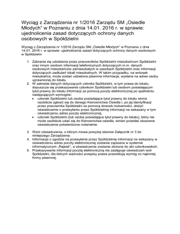 Wyciąg z Zarządzenia nr 1/2016 Zarządu SM „Osiedle Młodych” w