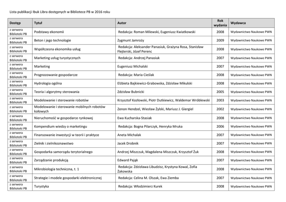 Lista publikacji Ibuk Libra dostępnych w Bibliotece PB w 2016 roku Dostęp z serwera Biblioteki PB z serwera Biblioteki PB z serwera Biblioteki PB z serwera Biblioteki PB z serwera Biblioteki PB z serwera Biblioteki PB z serwera Biblioteki PB z serwera Biblioteki PB z serwera Biblioteki PB z serwera Biblioteki PB z serwera Biblioteki PB z serwera Biblioteki PB z serwera Biblioteki PB z serwera Biblioteki PB z serwera Biblioteki PB z serwera Biblioteki PB z serwera Biblioteki PB z serwera Biblioteki PB z serwera Biblioteki PB Rok Wydawca wydania Tytuł Autor Podstawy ekonomii Redakcja: Roman Milewski, Eugeniusz Kwiatkowski 2008 Wydawnictwo Naukowe PWN Beton i jego technologie Zygmunt Jamroży 2009 Wydawnictwo Naukowe PWN Współczesna ekonomika usług Redakcja: Aleksander Panasiuk, Grażyna Rosa, Stanisław Flejterski, Józef Perenc 2008 Wydawnictwo Naukowe PWN Marketing usług turystycznych Redakcja: Andrzej Panasiuk 2007 Wydawnictwo Naukowe PWN Marketing Eugeniusz Michalski 2007 Wydawnictwo Naukowe PWN Prognozowanie gospodarcze Redakcja: Maria Cieślak 2008 Wydawnictwo Naukowe PWN Hydrologia ogólna Elżbieta Bajkiewicz-Grabowska, Zdzisław Mikulski 2008 Wydawnictwo Naukowe PWN Teoria i algorytmy sterowania Zdzisław Bubnicki 2005 Wydawnictwo Naukowe PWN Modelowanie i sterowanie robotów Krzysztof Kozłowski, Piotr Dutkiewicz, Waldemar Wróblewski 2003 Wydawnictwo Naukowe PWN Modelowanie i sterowanie mobilnych robotów kołowych Zenon Hendzel, Wiesław Żylski, Mariusz J. Giergiel 2002 Wydawnictwo Naukowe PWN Nieruchomość w gospodarce rynkowej Ewa Kucharska-Stasiak 2008 Wydawnictwo Naukowe PWN Kompendium wiedzy o marketingu Redakcja: Bogna Pilarczyk, Henryka Mruka 2006 Wydawnictwo Naukowe PWN Finansowanie inwestycji w teorii i praktyce Aneta Michalak 2007 Wydawnictwo Naukowe PWN Zielnik i zielnikoznawstwo Jacek Drobnik 2007 Wydawnictwo Naukowe PWN Gospodarka samorządu terytorialnego Andrzej Miszczuk, Magdalena Miszczuk, Krzysztof Żuk 2008 Wydawnictwo Naukowe PWN Zarządzanie produkcją Edward Pająk 2007 Wydawnictwo Naukowe PWN Mikrobiologia techniczna, t. 1 Redakcja: Zdzisława Libudzisz, Krystyna Kowal, Zofia Żakowska 2008 Wydawnictwo Naukowe PWN Strategie i modele gospodarki elektronicznej Redakcja: Celina M. Olszak, Ewa Ziemba 2007 Wydawnictwo Naukowe PWN Turystyka Redakcja: Włodzimierz Kurek 2008 Wydawnictwo Naukowe PWN Dostęp Rok Wydawca wydania Tytuł Autor Historia ogrodów, t. 1 Longin Majdecki 2007 Wydawnictwo Naukowe PWN GIS. Obszary zastosowań Robert Olszewski, Dariusz Gotlib, Adam Iwaniak 2007 Wydawnictwo Naukowe PWN Biologiczne przetwarzanie odpadów Andrzej Jędrczak 2008 Wydawnictwo Naukowe PWN Gospodarka regionalna i lokalna Redakcja: Zbigniew Strzelecki 2008 Wydawnictwo Naukowe PWN Metrologia wielkości geometrycznych Władysław Jakubiec, Jan Malinowski 2007 Wydawnictwo WNT Alternatywne zasilanie samochodów benzyną oraz gazami LPG i CNG Kazimierz M. Romaniszyn 2007 Wydawnictwo WNT Statystyka Mieczysław Sobczyk 2007 Wydawnictwo Naukowe PWN Przedsiębiorstwo usługowe. Zarządzanie Redakcja: Aleksander Panasiuk, Beata Filipiak 2008 Wydawnictwo Naukowe PWN Infrastruktura wodno-ściekowa w planowaniu miast Bohdan Łyp 2008 Wybrane zagadnienia biometrii Krzysztof Ślot 2008 Turystyka w naukach humanistycznych Redakcja: Ryszard Winiarski 2008 Wydawnictwo Naukowe PWN Przedsiębiorstwo usługowe. Ekonomika Redakcja: Aleksander Panasiuk, Beata Filipiak 2008 Wydawnictwo Naukowe PWN Historia ogrodów, t. 2 Longin Majdecki 2008 Wydawnictwo Naukowe PWN Ochrona środowiska przyrodniczego Bożena Dobrzańska, Grzegorz Dobrzański, Dariusz Kiełczewski 2008 Wydawnictwo Naukowe PWN Konstrukcje stalowe Szymon Pałkowski 2009 Wydawnictwo Naukowe PWN Wprowadzenie do ekonometrii Karol Kukuła, Antoni Goryl, Zbigniew Jędrzejczyk, Jacek Osiewalski, Anna Walkosz 2009 Wydawnictwo Naukowe PWN Wprowadzenie do CAD Maciej Sydor 2009 Wydawnictwo Naukowe PWN z serwera Biblioteki PB Węzły drogowe i autostradowe Ryszard Krystek, Zygmunt Wrześniowski, Lech Michalski, Kazimierz Jamroz, Marcin Budzyński, Jacek Oskarbski, Joanna Żukowska 2008 Wydawnictwa Komunikacji i Łączności z serwera Biblioteki PB Kompendium wiedzy o turystyce Redakcja: Grzegorz Gołembski 2009 Wydawnictwo Naukowe PWN z serwera Biblioteki PB z serwera Biblioteki PB z serwera Biblioteki PB z serwera Biblioteki PB z serwera Biblioteki PB z serwera Biblioteki PB z serwera Biblioteki PB z serwera Biblioteki PB z serwera Biblioteki PB z serwera Biblioteki PB z serwera Biblioteki PB z serwera Biblioteki PB z serwera Biblioteki PB z serwera Biblioteki PB z serwera Biblioteki PB z serwera Biblioteki PB z serwera Biblioteki PB Wydawnictwa Komunikacji i Łączności Wydawnictwa Komunikacji i Łączności Dostęp libra.ibuk.pl libra.ibuk.pl libra.ibuk.pl Tytuł Niepełnosprawność i niepełnosprawni w polityce społecznej Aktywność osób z ograniczeniami sprawności na rynku pracy: czynniki wspomagające i czynniki ryzyka Osoby z ograniczoną sprawnością na rynku pracy portret środowiska. Autor Rok Wydawca wydania Zbigniew Woźniak 2008 Academica Wydawnictwo SWPS Redakcja: Anna Brzezińska, Konrad Piotrowski, Radosław Kaczan, Piotr Rycielski 2008 Academica Wydawnictwo SWPS Redakcja: Wojciech Łukowski 2008 Academica Wydawnictwo SWPS Academica Wydawnictwo SWPS libra.ibuk.pl Osoby z ograniczoną sprawnością na rynku pracy Redakcja: Anna Izabela Brzezińska, Zbigniew Woźniak, Konrad Maj 2007 libra.ibuk.pl Zadania rodziny i szkoły: od samodzielności dziecka do efektywności pracownika Anna Izabela Brzezińska 2007 libra.ibuk.pl Szkolenia z udziałem osób niepełnosprawnych Redakcja: Konrad Maj 2007 Redakcja: Ewa Trzebińska 2007 Anna Resler-Maj, Konrad Maj 2008 Academica Wydawnictwo SWPS Anna Izabela Brzezińska, Konrad Piotrowski 2008 Academica Wydawnictwo SWPS Anna Izabela Brzezińska, Konrad Piotrowski 2008 Academica Wydawnictwo SWPS Redakcja: Anna Izabela Brzezińska, Radosław Kaczan 2008 Academica Wydawnictwo
