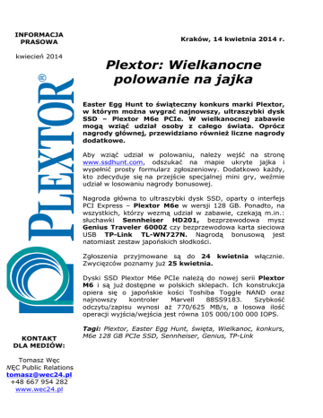 INFORMACJA PRASOWA Kraków, 14 kwietnia 2014 r. kwiecień 2014 Plextor: Wielkanocne polowanie na jajka Easter Egg Hunt to świąteczny konkurs marki Plextor, w którym można wygrać najnowszy, ultraszybki dysk SSD – Plextor M6e PCIe. W wielkanocnej zabawie mogą wziąć udział osoby z całego świata. Oprócz nagrody głównej, przewidziano również liczne nagrody dodatkowe. Aby wziąć udział w polowaniu, należy wejść na stronę www.ssdhunt.com, odszukać na mapie ukryte jajka i wypełnić prosty formularz zgłoszeniowy. Dodatkowo każdy, kto zdecyduje się na przejście specjalnej mini gry, weźmie udział w losowaniu nagrody bonusowej. Nagroda główna to ultraszybki dysk SSD, oparty o interfejs PCI Express – Plextor M6e w wersji 128 GB. Ponadto, na wszystkich, którzy wezmą udział w zabawie, czekają m.in.: słuchawki Sennheiser HD201, bezprzewodowa mysz Genius Traveler 6000Z czy bezprzewodowa karta sieciowa USB TP-Link TL-WN727N. Nagrodą bonusową jest natomiast zestaw japońskich słodkości. Zgłoszenia przyjmowane są do 24 kwietnia włącznie. Zwycięzców poznamy już 25 kwietnia. KONTAKT DLA MEDIÓW: Tomasz Węc WĘC Public Relations [email protected] +48 667 954 282 www.wec24.pl Dyski SSD Plextor M6e PCIe należą do nowej serii Plextor M6 i są już dostępne w polskich sklepach. Ich konstrukcja opiera się o japońskie kości Toshiba Toggle NAND oraz najnowszy kontroler Marvell 88SS9183. Szybkość odczytu/zapisu wynosi aż 770/625 MB/s, a losowa ilość operacji wyjścia/wejścia jest równa 105 000/100 000 IOPS. Tagi: Plextor, Easter Egg Hunt, święta, Wielkanoc, konkurs, M6e 128 GB PCIe SSD, Sennheiser, Genius, TP-Link INFORMACJA PRASOWA O marce Plextor Plextor to wiodący producent, wielokrotnie nagradzanych, napędów optycznych i urządzeń pamięci masowej. Właścicielem marki jest japońska firma Shinano Kenshi. Od wprowadzenia na rynek pierwszego napędu CD-ROM, w roku 1989, Plextor wytrwale dąży do utrzymania wysokiej jakości i maksymalnej wydajności oferowanych produktów. kwiecień 2014 Więcej informacji: www.plextor.com KONTAKT DLA MEDIÓW: Tomasz Węc WĘC Public Relations [email protected] +48 667 954 282 www.wec24.pl