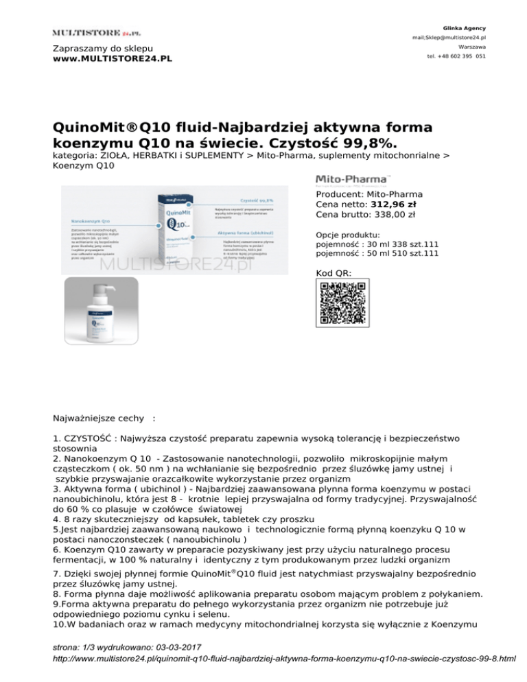 Glinka Agency mail;[email protected] Zapraszamy do sklepu www.MULTISTORE24.PL Warszawa tel. +48 602 395 051 QuinoMit®Q10 fluid-Najbardziej aktywna forma koenzymu Q10 na świecie. Czystość 99,8%. kategoria: ZIOŁA, HERBATKI i SUPLEMENTY > Mito-Pharma, suplementy mitochonrialne > Koenzym Q10 Producent: Mito-Pharma Cena netto: 312,96 zł Cena brutto: 338,00 zł Opcje produktu: pojemność : 30 ml 338 szt.111 pojemność : 50 ml 510 szt.111 Kod QR: Najważniejsze cechy : 1. CZYSTOŚĆ : Najwyższa czystość preparatu zapewnia wysoką tolerancję i bezpieczeństwo stosownia 2. Nanokoenzym Q 10 - Zastosowanie nanotechnologii, pozwoliło mikroskopijnie małym cząsteczkom ( ok. 50 nm ) na wchłanianie się bezpośrednio przez śluzówkę jamy ustnej i szybkie przyswajanie orazcałkowite wykorzystanie przez organizm 3. Aktywna forma ( ubichinol ) - Najbardziej zaawansowana plynna forma koenzymu w postaci nanoubichinolu, która jest 8 - krotnie lepiej przyswajalna od formy tradycyjnej. Przyswajalność do 60 % co plasuje w czołówce światowej 4. 8 razy skuteczniejszy od kapsułek, tabletek czy proszku 5.Jest najbardziej zaawansowaną naukowo i technologicznie formą płynną koenzyku Q 10 w postaci nanoczonsteczek ( nanoubichinolu ) 6. Koenzym Q10 zawarty w preparacie pozyskiwany jest przy użyciu naturalnego procesu fermentacji, w 100 % naturalny i identyczny z tym produkowanym przez ludzki organizm 7. Dzięki swojej płynnej formie QuinoMit®Q10 fluid jest natychmiast przyswajalny bezpośrednio przez śluzówkę jamy ustnej. 8. Forma płynna daje możliwość aplikowania preparatu osobom mającym problem z połykaniem. 9.Forma aktywna preparatu do pełnego wykorzystania przez organizm nie potrzebuje już odpowiedniego poziomu cynku i selenu. 10.W badaniach oraz w ramach medycyny mitochondrialnej korzysta się wyłącznie z Koenzymu strona: 1/3 wydrukowano: 03-03-2017 http://www.multistore24.pl/quinomit-q10-fluid-najbardziej-aktywna-forma-koenzymu-q10-na-swiecie-czystosc-99-8.html Q10 o najwyższej czystości. 11.Zawarty w preparacie koenzym Q10 został oczyszczony za pomocą chromatografii cieczowej, dzięki czemu uzyskano najwyższy stopień czystości 99,8%. 12.Preparat produkowany zgodnie z GMP- stosowanie preparatów produkowanych zgodnie z GMP gwarantuje, że otrzymujecie Państwo określone substancje w dawkach zgodnych z informacją podaną na opakowaniu. W opakowaniach po 39 i 50 ml - wybierz w opcjach QuinoMit®Q10 fluid Preparat QuinoMit®Q10 fluid to rewolucyjne osiągnięcie w przyswajalności koenzymu Q10. Efekt wieloletnich badań Laboratorium MSE dr F. Enzmanna.Dzięki zastosowaniu nanotechnologii mikroskopijnie małe cząsteczki są doskonale przyswajalne i całkowicie wykorzystywane przez organizm. To opatentowany preparat zawierający aktywną (zredukowaną), płynną formę koenzymu Q10 w postaci nanocząsteczek (nanochinol), niacynamid (B3) oraz glicerynę. Dzięki takiej postaci nanochinol wchłania się doskonale przez śluzówkę jamy ustnej, jest natychmiast przyswajalny i całkowicie wykorzystywany przez organizm. Badania wykazały, że ubichinol (forma aktywna koenzymu Q10) w porównaniu z ubichinonem (formą utlenioną) jest 8 –krotnie lepiej przyswajalna. To oznacza, że koenzym Q10 dostarczony do organizmu w formie aktywnej (w przeciwieństwie do formy utlenionej) nie musi już ulec przekształceniu, by móc spełniać swoje zadania. Dodatkowo forma nano (nanoubichinolu) jest gwarancją niezwykle szybkiego dotarcia do mitochondriów komórek. Dzięki licznym badaniom naukowym oraz zastosowaniu najnowocześniejszej technologii w procesie produkcji udało się stworzyć niespotykaną dotychczas biodostępność wynoszącą aż 60%. Oznacza to, iż przyswajalność w porównaniu do tradycyjnych form (proszek, kapsułka) wzrosła 8-krotnie. Jedna dawka w postaci ultra małych nanocząsteczek QuinoMit®Q10 fluid 8,4mg Q10. strona: 2/3 wydrukowano: 03-03-2017 http://www.multistore24.pl/quinomit-q10-fluid-najbardziej-aktywna-forma-koenzymu-q10-na-swiecie-czystosc-99-8.html strona: 3/3 wydrukowano: 03-03-2017 http://www.multistore24.pl/quinomit-q10-fluid-najbardziej-aktywna-forma-koenzymu-q10-na-swiecie-czystosc-99-8.html