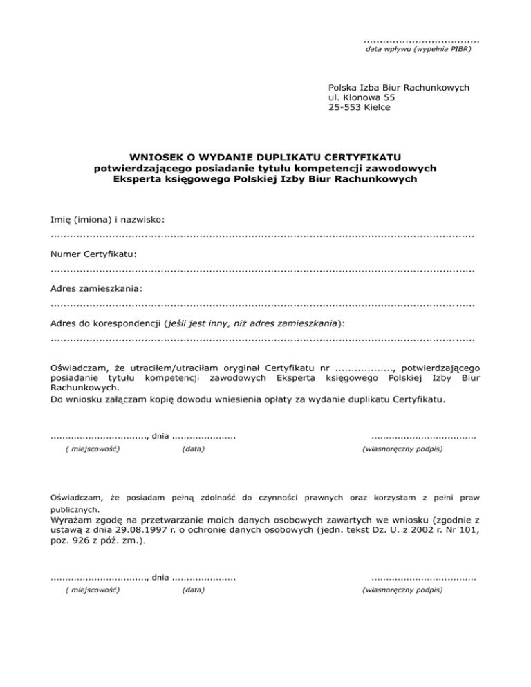 .................................... data wpływu (wypełnia PIBR) Polska Izba Biur Rachunkowych ul. Klonowa 55 25-553 Kielce WNIOSEK O WYDANIE DUPLIKATU CERTYFIKATU potwierdzającego posiadanie tytułu kompetencji zawodowych Eksperta księgowego Polskiej Izby Biur Rachunkowych Imię (imiona) i nazwisko: ................................................................................................................................... Numer Certyfikatu: ................................................................................................................................... Adres zamieszkania: ................................................................................................................................... Adres do korespondencji (jeśli jest inny, niż adres zamieszkania): ................................................................................................................................... Oświadczam, że utraciłem/utraciłam oryginał Certyfikatu nr .................., potwierdzającego posiadanie tytułu kompetencji zawodowych Eksperta księgowego Polskiej Izby Biur Rachunkowych. Do wniosku załączam kopię dowodu wniesienia opłaty za wydanie duplikatu Certyfikatu. ................................., dnia ...................... ( miejscowość) (data) .................................... (własnoręczny podpis) Oświadczam, że posiadam pełną zdolność do czynności prawnych oraz korzystam z pełni praw publicznych. Wyrażam zgodę na przetwarzanie moich danych osobowych zawartych we wniosku (zgodnie z ustawą z dnia 29.08.1997 r. o ochronie danych osobowych (jedn. tekst Dz. U. z 2002 r. Nr 101, poz. 926 z póź. zm.). ................................., dnia ...................... ( miejscowość) (data) .................................... (własnoręczny podpis)