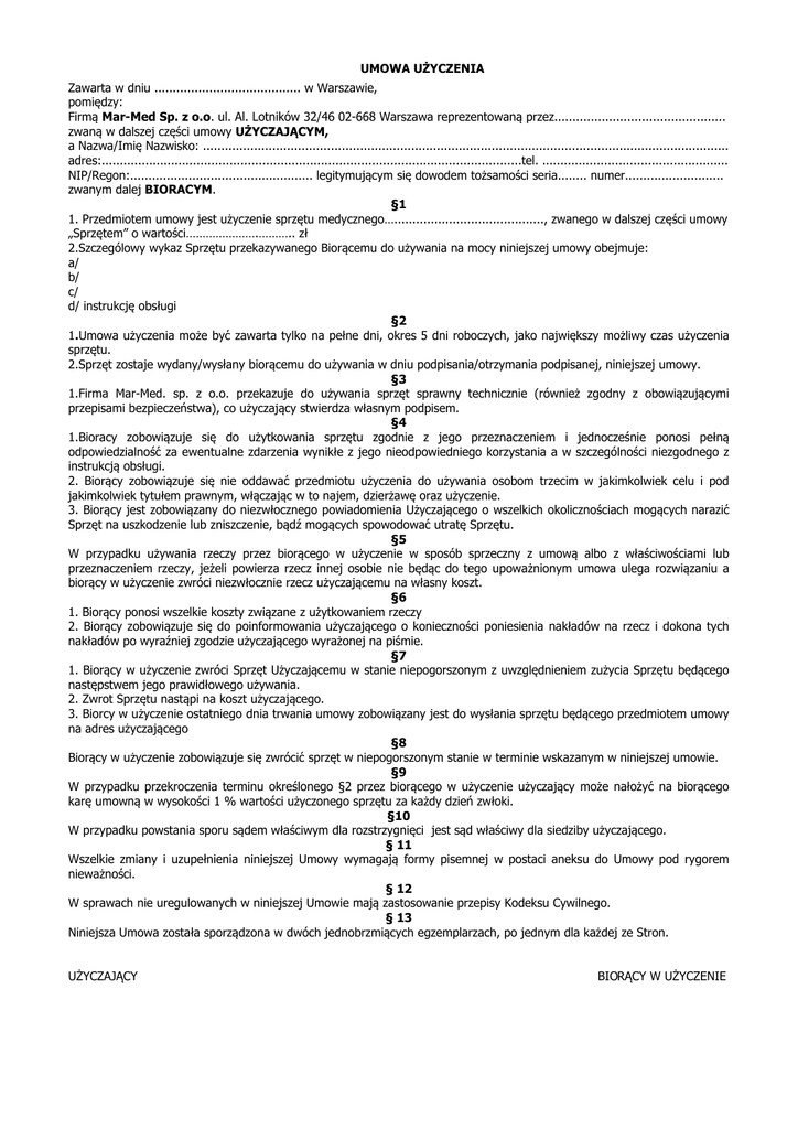 UMOWA UŻYCZENIA Zawarta w dniu ........................................ w Warszawie, pomiędzy: Firmą Mar-Med Sp. z o.o. ul. Al. Lotników 32/46 02-668 Warszawa reprezentowaną przez............................................... zwaną w dalszej części umowy UŻYCZAJĄCYM, a Nazwa/Imię Nazwisko: ................................................................................................................................................ adres:...................................................................................................................tel. ................................................... NIP/Regon:.................................................. legitymującym się dowodem tożsamości seria........ numer........................... zwanym dalej BIORACYM. §1 1. Przedmiotem umowy jest użyczenie sprzętu medycznego…........................................., zwanego w dalszej części umowy „Sprzętem” o wartości………………….……….. zł 2.Szczególowy wykaz Sprzętu przekazywanego Biorącemu do używania na mocy niniejszej umowy obejmuje: a/ b/ c/ d/ instrukcję obsługi §2 1.Umowa użyczenia może być zawarta tylko na pełne dni, okres 5 dni roboczych, jako największy możliwy czas użyczenia sprzętu. 2.Sprzęt zostaje wydany/wysłany biorącemu do używania w dniu podpisania/otrzymania podpisanej, niniejszej umowy. §3 1.Firma Mar-Med. sp. z o.o. przekazuje do używania sprzęt sprawny technicznie (również zgodny z obowiązującymi przepisami bezpieczeństwa), co użyczający stwierdza własnym podpisem. §4 1.Bioracy zobowiązuje się do użytkowania sprzętu zgodnie z jego przeznaczeniem i jednocześnie ponosi pełną odpowiedzialność za ewentualne zdarzenia wynikłe z jego nieodpowiedniego korzystania a w szczególności niezgodnego z instrukcją obsługi. 2. Biorący zobowiązuje się nie oddawać przedmiotu użyczenia do używania osobom trzecim w jakimkolwiek celu i pod jakimkolwiek tytułem prawnym, włączając w to najem, dzierżawę oraz użyczenie. 3. Biorący jest zobowiązany do niezwłocznego powiadomienia Użyczającego o wszelkich okolicznościach mogących narazić Sprzęt na uszkodzenie lub zniszczenie, bądź mogących spowodować utratę Sprzętu. §5 W przypadku używania rzeczy przez biorącego w użyczenie w sposób sprzeczny z umową albo z właściwościami lub przeznaczeniem rzeczy, jeżeli powierza rzecz innej osobie nie będąc do tego upoważnionym umowa ulega rozwiązaniu a biorący w użyczenie zwróci niezwłocznie rzecz użyczającemu na własny koszt. §6 1. Biorący ponosi wszelkie koszty związane z użytkowaniem rzeczy 2. Biorący zobowiązuje się do poinformowania użyczającego o konieczności poniesienia nakładów na rzecz i dokona tych nakładów po wyraźniej zgodzie użyczającego wyrażonej na piśmie. §7 1. Biorący w użyczenie zwróci Sprzęt Użyczającemu w stanie niepogorszonym z uwzględnieniem zużycia Sprzętu będącego następstwem jego prawidłowego używania. 2. Zwrot Sprzętu nastąpi na koszt użyczającego. 3. Biorcy w użyczenie ostatniego dnia trwania umowy zobowiązany jest do wysłania sprzętu będącego przedmiotem umowy na adres użyczającego §8 Biorący w użyczenie zobowiązuje się zwrócić sprzęt w niepogorszonym stanie w terminie wskazanym w niniejszej umowie. §9 W przypadku przekroczenia terminu określonego §2 przez biorącego w użyczenie użyczający może nałożyć na biorącego karę umowną w wysokości 1 % wartości użyczonego sprzętu za każdy dzień zwłoki. §10 W przypadku powstania sporu sądem właściwym dla rozstrzygnięci jest sąd właściwy dla siedziby użyczającego. § 11 Wszelkie zmiany i uzupełnienia niniejszej Umowy wymagają formy pisemnej w postaci aneksu do Umowy pod rygorem nieważności. § 12 W sprawach nie uregulowanych w niniejszej Umowie mają zastosowanie przepisy Kodeksu Cywilnego. § 13 Niniejsza Umowa została sporządzona w dwóch jednobrzmiących egzemplarzach, po jednym dla każdej ze Stron. UŻYCZAJĄCY BIORĄCY W UŻYCZENIE