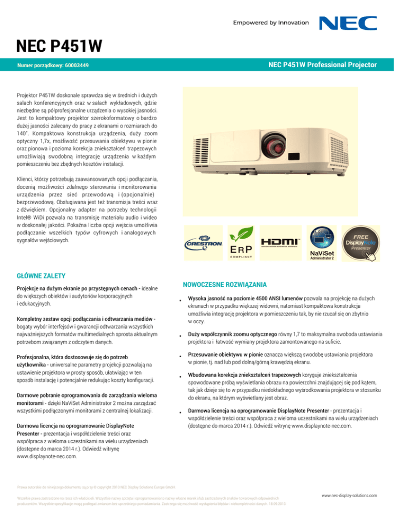 NEC P451W NEC P451W Professional Projector Numer porządkowy: 60003449 Projektor P451W doskonale sprawdza się w średnich i dużych salach konferencyjnych oraz w salach wykładowych, gdzie niezbędne są półprofesjonalne urządzenia o wysokiej jasności. Jest to kompaktowy projektor szerokoformatowy o bardzo dużej jasności zalecany do pracy z ekranami o rozmiarach do 140". Kompaktowa konstrukcja urządzenia, duży zoom optyczny 1,7x, możliwość przesuwania obiektywu w pionie oraz pionowa i pozioma korekcja zniekształceń trapezowych umożliwiają swodobną integrację urządzenia w każdym pomieszczeniu bez zbędnych kosztów instalacji. Klienci, którzy potrzebują zaawansowanych opcji podłączania, docenią możliwości zdalnego sterowania i monitorowania urządzenia przez sieć przewodową i (opcjonalnie) bezprzewodową. Obsługiwana jest też transmisja treści wraz z dźwiękiem. Opcjonalny adapter na potrzeby technologii Intel® WiDi pozwala na transmisję materiału audio i wideo w doskonałej jakości. Pokaźna liczba opcji wejścia umożliwia podłączanie wszelkich typów cyfrowych i analogowych sygnałów wejściowych. GŁÓWNE ZALETY Projekcje na dużym ekranie po przystępnych cenach - idealne do większych obiektów i audytoriów korporacyjnych i edukacyjnych. Kompletny zestaw opcji podłączania i odtwarzania mediów bogaty wybór interfejsów i gwarancji odtwarzania wszystkich najważniejszych formatów multimedialnych sprosta aktualnym potrzebom związanym z odczytem danych. Profesjonalna, która dostosowuje się do potrzeb użytkownika - uniwersalne parametry projekcji pozwalają na ustawienie projektora w prosty sposób, ułatwiając w ten sposób instalację i potencjalnie redukując koszty konfiguracji. Darmowe pobranie oprogramowania do zarządzania wieloma monitorami - dzięki NaViSet Administrator 2 można zarządzać wszystkimi podłączonymi monitorami z centralnej lokalizacji. Darmowa licencja na oprogramowanie DisplayNote Presenter - prezentacja i współdzielenie treści oraz współpraca z wieloma uczestnikami na wielu urządzeniach (dostępne do marca 2014 r.). Odwiedź witrynę www.displaynote-nec.com. NOWOCZESNE ROZWIĄZANIA • Wysoka jasność na poziomie 4500 ANSI lumenów pozwala na projekcję na dużych ekranach w przypadku większej widowni, natomiast kompaktowa konstrukcja umożliwia integrację projektora w pomieszczeniu tak, by nie rzucał się on zbytnio w oczy. • Duży współczynnik zoomu optycznego równy 1,7 to maksymalna swoboda ustawiania projektora i łatwość wymiany projektora zamontowanego na suficie. • Przesuwanie obiektywu w pionie oznacza większą swodobę ustawiania projektora w pionie, tj. nad lub pod dolną/górną krawędzią ekranu. • Wbudowana korekcja zniekształceń trapezowych koryguje zniekształcenia spowodowane próbą wyświetlania obrazu na powierzchni znajdującej się pod kątem, tak jak dzieje się to w przypadku niedokładnego wyśrodkowania projektora w stosunku do ekranu, na którym wyświetlany jest obraz. • Darmowa licencja na oprogramowanie DisplayNote Presenter - prezentacja i współdzielenie treści oraz współpraca z wieloma uczestnikami na wielu urządzeniach (dostępne do marca 2014 r.). Odwiedź witrynę www.displaynote-nec.com. Prawa autorskie do niniejszego dokumentu są przy © copyright 2013 NEC Display Solutions Europe GmbH. Wszelkie prawa zastrzeżone na rzecz ich właścicieli. Wszystkie nazwy sprzętu i oprogramowania to nazwy własne marek i/lub zastrzeżonych znaków towarowych odpowiednich producentów. Wszystkie specyfikacje mogą podlegać zmianom bez uprzedniego powiadamiania. Zastrzega się możliwość wystąpienia błędów i niekompletności danych. 18.09.2013 www.nec-display-solutions.com NEC P451W Dane techniczne NEC P451W PARAMETRY OPTYCZNE Wyświetlacz CECHY SPECJALNE Automatyczny tryb ECO, Blokada klawiszy OSD, FREE DisplayNote Presenter, Funkcja Direct Power-Off, Funkcja identyfikatora sterowania (Control ID), Funkcja lupy, Funkcja Widnows Media Drive, Funkcja Windows Media Connect, Funkcja wirtualnego pilota, Funkcja wyświetlania przez USB wraz z sygnałem audio, Funkcja zdalnego pulpitu, Funkcja zegara, Gniazdo zabezpieczające typu K-Slot, Help Function, Kontrast 4000:1 z technologią Iris, Korekcja zniekształceń poduszkowych, Licznik Carbon savings, Menu OSD w 27 językach, Możliwość wyświetlania plików bezpośrednio z pamięci FLASH, NaViSet Administrator 2, Opcjalane logo użytkownika, Opcjonalna sieć WLAN typu Plug&Play, osłona obiektywu, Plansza kontrolna, Programowa korekcja geometrii, Projektor sieciowy z Windows 7, Przesuwanie obiektywu w pionie +60%, Ręczna regulacja kompensacji koloru ściany, Sterowanie myszą dzięki funkcji wyświetlania przez USB (USB Display), Sterowanie przez przeglądarkę WWW, Symulacja standardu DICOM, Szybki start, Tryb oszczędzania energii: 0,4 W, Unikalne funkcje ograniczenia poboru energii, Wybór wejścia sygnału, Zabezpieczenie hasłem, Automatyczny tryb ECO, Zielony przycisk na pilocie ECO i AV mute, Funkcja 75% AV Mute, Instrukcje do pobrania w wersji elektronicznej, Zgodność z RoHs, Opakowania Eko, Zgodność z ErP 1280 x 800 (WXGA) Kontrast 1 4000:1 Jasność 1 4500 ANSI lumenów w trybie wysokiej jasności / 3600 w trybie normalnym / 2700 w trybie eko Moc lampy 270 W UHP AC Żywotność lampy [godz] 6000 w trybie eko / 4000 w trybie normalnym / 3500 w trybie wysokiej jasności Obiektyw F= 1,7–2,2, f= 17,4–29 mm Przesuwanie obiektywu Przesunięcie obiektywu w pionie 0–0,6 Korekcja zniekształceń trapezowych ręcznie w poziomie/pionie +/-30° Współczynnik projekcji 1.3 – 2.2 : 1 Odległość projekcji [m] 0.7 – 14.6 Przekątna ekranu [cm] Minimalnie: 64 / 0"; Maksymalnie: 762 / 300" Zoom 1 - 1.7; Ręczny Ustawienie ostrości Ręczne Obsługiwane rozdzielczości Maksymalnie 1920 x 1200 — (WUXGA) Częstotliwość Pozioma: 15–100 kHz (RGB: 24 kHz); Pionowa: 50 – 120 Hz MOŻLIWOŚCI 