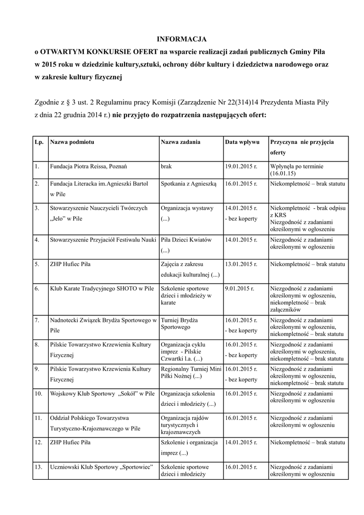 INFORMACJA o OTWARTYM KONKURSIE OFERT na wsparcie realizacji zadań publicznych Gminy Piła w 2015 roku w dziedzinie kultury,sztuki, ochrony dóbr kultury i dziedzictwa narodowego oraz w zakresie kultury fizycznej Zgodnie z § 3 ust. 2 Regulaminu pracy Komisji (Zarządzenie Nr 22(314)14 Prezydenta Miasta Piły z dnia 22 grudnia 2014 r.) nie przyjęto do rozpatrzenia następujących ofert: Lp. Nazwa podmiotu Nazwa zadania Data wpływu Przyczyna nie przyjęcia oferty 1. Fundacja Piotra Reissa, Poznań brak 19.01.2015 r. Wpłynęła po terminie (16.01.15) 2. Fundacja Literacka im.Agnieszki Bartol Spotkania z Agnieszką 16.01.2015 r. Niekompletność – brak statutu Stowarzyszenie Nauczycieli Twórczych Organizacja wystawy 14.01.2015 r. „Jelo” w Pile (...) - bez koperty Niekompletność - brak odpisu z KRS Niezgodność z zadaniami określonymi w ogłoszeniu 14.01.2015 r. Niezgodność z zadaniami określonymi w ogłoszeniu 13.01.2015 r. Niekompletność – brak statutu 9.01.2015 r. Niezgodność z zadaniami określonymi w ogłoszeniu, niekompletność – brak załączników Niezgodność z zadaniami określonymi w ogłoszeniu, niekompletność – brak statutu w Pile 3. 4. Stowarzyszenie Przyjaciół Festiwalu Nauki Piła Dzieci Kwiatów (...) 5. ZHP Hufiec Piła Zajęcia z zakresu edukacji kulturalnej (...) 6. Klub Karate Tradycyjnego SHOTO w Pile 7. Nadnotecki Związek Brydża Sportowego w Turniej Brydża Sportowego Pile 16.01.2015 r. Pilskie Towarzystwo Krzewienia Kultury 16.01.2015 r. 8. Fizycznej 9. 10. Szkolenie sportowe dzieci i młodzieży w karate Organizacja cyklu imprez - Pilskie Czwartki l.a. (...) - bez koperty - bez koperty Fizycznej Regionalny Turniej Mini 16.01.2015 r. Piłki Nożnej (...) - bez koperty Niezgodność z zadaniami określonymi w ogłoszeniu, niekompletność – brak statutu Wojskowy Klub Sportowy „Sokół” w Pile Organizacja szkolenia 16.01.2015 r. Niezgodność z zadaniami określonymi w ogłoszeniu Organizacja rajdów turystycznych i krajoznawczych 16.01.2015 r. Niezgodność z zadaniami określonymi w ogłoszeniu Szkolenie i organizacja 14.01.2015 r. Niekompletność – brak statutu 16.01.2015 r. Niezgodność z zadaniami określonymi w ogłoszeniu Pilskie Towarzystwo Krzewienia Kultury dzieci i młodzieży (...) 11. Oddział Polskiego Towarzystwa Turystyczno-Krajoznawczego w Pile 12. Niezgodność z zadaniami określonymi w ogłoszeniu, niekompletność – brak statutu ZHP Hufiec Piła imprez (...) 13. Uczniowski Klub Sportowy „Sportowiec” Szkolenie sportowe dzieci i młodzieży w Pile 14. Klub Sportowy „Gwardia” w Pile Szkolenie dzieci i młodzieży w lekkiej atletyce 16.01.2015 r. - Niezgodność z zadaniami określonymi w ogłoszeniu, - Załączniki niepotwierdzone za zgodność z oryginałem 15. Klub Sportowy „Gwardia” w Pile Szkolenie dzieci i młodzieży w judo 16.01.2015 r. - Niezgodność z zadaniami określonymi w ogłoszeniu, - Załączniki niepotwierdzone za zgodność z oryginałem 16. Uczniowski Klub Sportowy „MARIO Piła” Szkoleni sportowe dzieci i młodzieży w tenisie ziemnym 16.01.2015 r. Niezgodność z zadaniami określonymi w ogłoszeniu 17. Miejski Klub Pływacki „Szuwarek” Piła Szkolenie dzieci i młodzieży 16.01.2015 r. Niezgodność z zadaniami określonymi w ogłoszeniu 18. Uczniowski Klub Sportowy „Iskra” w Pile Realizacja wydarzenia 15.01.2015 r. Niezgodność z zadaniami określonymi w ogłoszeniu kulturalno-sportowego 19. Uczniowski Klub Sportowy „Iskra” w Pile Szkolenie sportowe dzieci i młodzieży w akrobatyce sportowej 15.01.2015 r. Niezgodność z zadaniami określonymi w ogłoszeniu 20. Uczniowski Klub Sportowy „Iskra” w Pile Szkolenie dzieci i 15.01.2015 r. młodzieży w sportowym tańcu towarzyskim Niezgodność z zadaniami określonymi w ogłoszeniu 21. Uczniowski Klub Sportowy „Iskra” w Pile Szkolenie dzieci i młodzieży w szachach 15.01.2015 r. Niezgodność z zadaniami określonymi w ogłoszeniu 22. Klub Żużlowy VICTORIA PIŁA Prowadzenie szkółki 15.01.2015 r. Niezgodność z zadaniami określonymi w ogłoszeniu żużlowej (...) 23. Pilski Ludowy Klub Sportowy GWDA Piła Szkolenie dzieci i młodzieży w lekkiej atletyce 15.01.2015 r. Niezgodność z zadaniami określonymi w ogłoszeniu 24. Uczniowski Klub Żeglarski „Wodniak” w Pile Szkolenie sportowe dzieci i młodzieży w żeglarstwie 15.01.2015 r. Niezgodność z zadaniami określonymi w ogłoszeniu 25. Uczniowski Klub Sportowy „3” w Pile Szkolenie dzieci i 14.01.2015 r. Niezgodność z zadaniami określonymi w ogłoszeniu młodzieży 26. Strzelecki Klub Sportowy „InterContinental” w Pile Szkolenie sportowe dzieci i młodzieży (...) 13.01.2015 r. Niezgodność z zadaniami określonymi w ogłoszeniu 27. Towarzystwo Piłkarskie „Polonia Piła” Szkolenie sportowe dzieci i młodzieży (...) 13.01.2015 r. Niezgodność z zadaniami określonymi w ogłoszeniu 28. Stowarzyszenie Biegów Ulicznych w Pile Organizacja Międzynarodowego Półmaratonu (...) 9.01.2015 r. Niezgodność z zadaniami określonymi w ogłoszeniu DYREKTOR Wydziału Oświaty, Kultury i Sportu (-) Sebastian Dzikowski