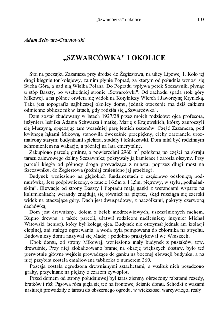 „Szwarcówka” i okolice 103 Adam Schwarz-Czarnowski „SZWARCÓWKA" I OKOLICE Stoi na początku Zazamcza przy drodze do Żegiestowa, na ulicy Lipowej 1. Koło tej drogi biegnie tor kolejowy, za nim płynie Poprad, za którym od południa wznosi się Sucha Góra, a nad nią Wielka Polana. Do Popradu wpływa potok Szczawnik, płynąc u stóp Baszty, po wschodniej stronie „Szwarcówki". Od zachodu spada stok góry Mikowej, a na północ otwiera się widok na Kotylniczy Wierch i Jaworzynę Krynicką. Taka jest topografia najbliższej okolicy domu, jednak otoczenie ma dziś całkiem odmienne oblicze niż w latach, gdy rodziła się „Szwarcówka". Dom został zbudowany w latach 1927/28 przez moich rodziców: ojca profesora, inżyniera leśnika Adama Schwarza i matkę, Marię z Krajewskich, którzy zauroczyli się Muszyną, spędzając tam wcześniej parę letnich sezonów. Część Zazamcza, pod kwitnącą łąkami Mikową, stanowiła ówcześnie przepiękny, cichy zaścianek, urozmaicony starymi budynkami spichrza, stodoły i leśniczówki. Dom miał być rodzinnym schronieniem na wakacje, a później na lata emerytalne. Zakupiono parcelę gminną o powierzchni 2960 m2 położoną po części na skraju tarasu zalewowego doliny Szczawnika; pokrywały ją kamieńce i zarośla olszyny. Przy parceli biegła od północy droga prowadząca z miasta, poprzez długi most na Szczawniku, do Żegiestowa (później zmieniono jej przebieg). Budynek wzniesiono na głębokich fundamentach z częściowo odsłoniętą podmurówką. Jest podpiwniczony, o rzucie 16,5m x 1 l,5m, piętrowy, w stylu „podhalańskim". Elewacje od strony Baszty i Popradu mają ganki z werandami wsparte na kolumienkach; werandy znajdują się również na piętrze, skąd rozciąga się szeroki widok na otaczające góry. Dach jest dwuspadowy, z naczółkami, pokryty czerwoną dachówką. Dom jest drewniany, dołem z belek modrzewiowych, uszczelnionych mchem. Kupno drewna, a także parceli, ułatwił rodzicom nadleśniczy inżynier Michał Witowski (senior), który był kolegą ojca. Budynek nie otrzymał jednak ani izolacji cieplnej, ani stałego ogrzewania, a woda była pompowana do zbiornika na strychu. Budowniczy domu nazywał się Madej i podobno praktykował we Włoszech. Obok domu, od strony Mikowej, wzniesiono mały budynek z pustaków, tzw. drewutnię. Przy niej zlokalizowano bramę na okazję większych dostaw, było też pierwotnie główne wejście prowadzące do ganku na bocznej elewacji budynku, a na niej przybita została emaliowana tabliczka z numerem 360. Posesja została ogrodzona drewnianymi sztachetami, a wzdłuż nich posadzono graby, przycinane na piękny z czasem żywopłot. Przed domem od strony południowej był taras ziemny obrzeżony rabatami rezedy, bratków i róż. Pąsowa róża pięła się też na frontowej ścianie domu. Schodki z wazami nasturcji prowadziły z tarasu do obszernego ogrodu, w większości warzywnego; rosły 104 Adam Schwarz-Czarnowski też jabłonie, śliwy, słoneczniki. Wschodnią część ogrodu zajmował trawnik, na którym leżakowano wśród ozdobnych krzewów. Z tyłu posadzono lipy i klony, a pod nimi stały ławki i stolik. W otoczeniu domu był jeszcze jeden, szczególny obiekt: przy płocie,.pd strony torów kolejowych, kryło się w wierzbach oczko wodne. Zamieszkiwały tam zaskrońce i koncertowały żaby. Cała zatem najbliższa i dalsza okolica stanowiła ostoję natury. Tak więc powstało gniazdo rodzinne, które z czasem stało się dość ekskluzywnym pensjonatem; nazwano go „Pod Basztą", ale potocznie przyjęło sięmiano „Szwarcówka". Latem gromadziło się tam grono ludzi „na stanowiskach": profesorów, inżynierów, prawników... Kwitło życie towarzyskie, a moja matka, prowadząc pensjonat, potrafiła stworzyć beztroską, pełną humoru atmosferę. Po śmierci ojca w 1934 roku pensjonat stanowił dość ważną pozycję w budżecie domowym. Wybudowano cztery dodatkowe pokoje mansardowe z balkonami. Wynajmowano 12 pokoi. W sezonie bywało 20-25 osób, a kilkanaście dochodziło na obiady. Cena pobytu w pensjonacie, z czterema posiłkami dziennie, wynosiła od 5 złotych w 1930 roku do 8 złotych w roku 1939; podniósł się wtedy standard wyżywienia. Zawsze jednak podawano tzw. „domowe" potrawy, które sporządzała kucharka Zosia pod okiem mojej matki, budząc zachwyty najwybredniejszych smakoszów. Znakomite też było pieczywo z piekarni Sterna oraz wędliny z masarni Wójcika. Inne produkty kupowało się u innego Wójcika — Władysława — w Rynku. Wszystko zaś było na kredyt, zapisywany na książeczkach, spłacany co miesiąc. Nieodzownym uzupełnieniem menu była woda mineralna „Milusia", przynoszona ze źródła na Zazamczu. (Tak potocznie mówiono na wodę ze źródła znajdującego się przy drodze prowadzącej na Złockie. Właściwa „Milusia" była i jest w mieście). W pensjonacie pracowali muszynianie z Zazamcza. Niezastąpiony był Antoni Wilczyński. Dźwigał, a później woził, z miasta zakupy, pompował wodę do zbiornika, rąbał drewno, którym paliło się pod kuchnią, czasem wychodził po gości na stację, dumny, w kepi z napisem BASZTA; spełniał też wiele innych posług, m.in. porządkował ogród, zimą zaś dozorował domu. Pokojówkami i pomocnicami w kuchni były: Mania (chyba Bukowska), Zosia Wilczyńska i parę innych na zmianę, „nadwornymi" zaś furmanami: Tyliszczak, Bukowski, Wójcik, z własnymi furkami, a następnie wygodnymi powozami; odbywali kursy do łazienek, na stację kolejową, do kościoła, a czasem robili wycieczki w okoliczne doliny, do Krynicy, do Żegiestowa. Piękne, słoneczne sezony letnie 1938 i 1939 były szczytem działalności pensjonatu „Pod Basztą", czyli popularnej „Szwarcówki"; stanowiły też beztroską, niepowtarzalną „epokę przedwojenną". W okresie wojny dom został zajęty na kwatery dla żołnierzy niemieckich, wypoczywających poza frontem. Sporad