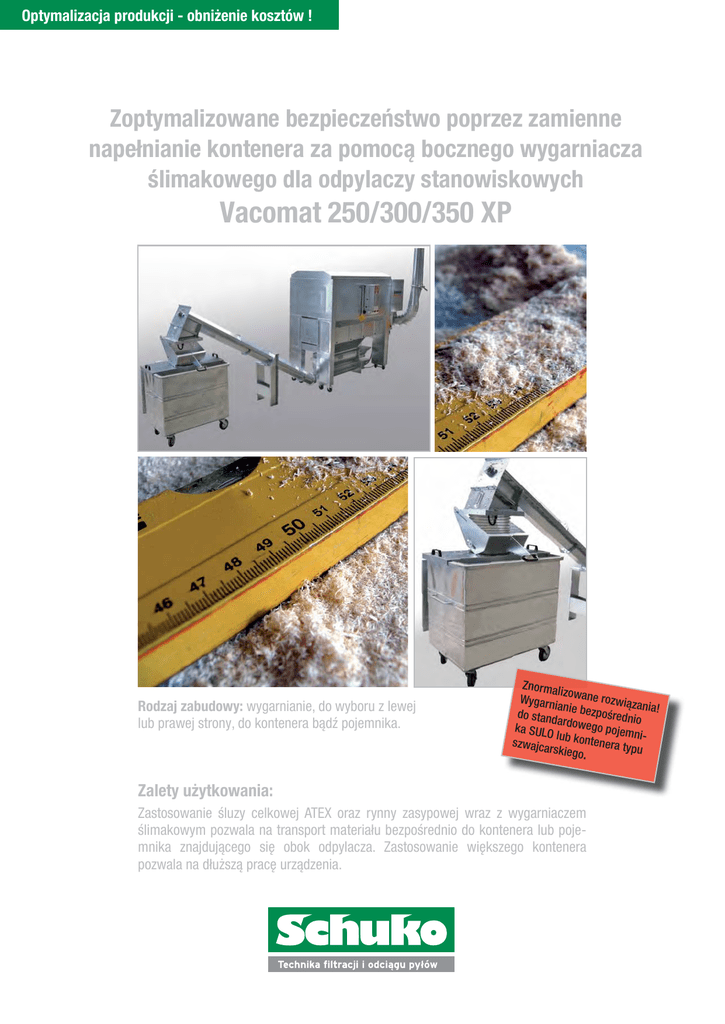 Optymalizacja produkcji - obniżenie kosztów ! Zoptymalizowane bezpieczeństwo poprzez zamienne napełnianie kontenera za pomocą bocznego wygarniacza ślimakowego dla odpylaczy stanowiskowych Vacomat 250/300/350 XP Rodzaj zabudowy: wygarnianie, do wyboru z lewej lub prawej strony, do kontenera bądź pojemnika. Znorma lizowan er Wygarn ianie be ozwiązania! zpośred do stand nio ar ka SULO dowego pojem nilub konte szwajca rskiego. nera typu Zalety użytkowania: Zastosowanie śluzy celkowej ATEX oraz rynny zasypowej wraz z wygarniaczem ślimakowym pozwala na transport materiału bezpośrednio do kontenera lub pojemnika znajdującego się obok odpylacza. Zastosowanie większego kontenera pozwala na dłuższą pracę urządzenia. Sygnalizator poziomu napełnienia Łącznik krańcowy bezpieczeństwa Kontener znormalizowany Kontener znormalizowany Automatyczne wygarnianie bezpośrednio do kontenera / pojemnika – Vacomat 250/300/350 XP Boczny wygarniacz ślimakowy ze śluzą celkową (ATEX) do doprowadzania materiału bezpośrednio do istniejącego kontenera / pojemnika. Rozwiązanie sprawdzone pod względem bezpieczeństwa, do postawienia wewnątrz pomieszczenia, odpowiadające wymaganiom ubezpieczeniowym oraz bezpieczeństwa pracy. Bezpieczeństwo inwestycyjne poprzez najnowszy, techniczny rozwój. Samodzielny montaż, wygarniacz można zamontować do wyboru z lewej bądź prawej strony. Opcjonalnie dostępny jest sygnalizator wirnikowy jako sygnalizator poziomu napełnienia Wyposażenie odpylaczy stanowiskowych Vacomat: >> dłuższa żywotność odpylacza dzięki dużej komorze rozprężnej, >> cicha praca urządzenia poprzez zastosowanie obudowy filtra o podwójnych ściankach 70/74 [dB(A)], >> stała moc ssąca także przy dużym obciążeniu pyłem dzięki antystatycznym workom filtrującym na bazie poliestru igłowego (przebadana przez BGIA*) >> łatwa w obsłudze eksploatacja dzięki automatycznej regeneracji worków filtrujących (pneumatyczno-mechaniczna), >> oszczędność czasu dzięki niezależnemu nadzorowi nad siłą przepływu strumienia powietrza za pomocą czujnika ciśnienia z kontrolką sygnalizacyjną, >> podwyższone bezpieczeństwo poprzez automatyczną proszkową instalację gaśniczą zgodną z normą GS-OH-07 (nie powstają szkody wodne), >> zoptymalizowane możliwości transportowe dzięki redukcji wysokości na 2.120mm, >> opcjonalnie regeneracja impulsami sprężonego powietrza (za dopłatą). * Związki zawodowe. Instytut Bezpieczeństwa Pracy (obecnie IFA: „Instytut Bezpieczeństwa Pracy”). Odpylacze stanowiskowe Vacomat 250 XP, 300 XP są jednakowej budowy. Różnią się wyłącznie średnicą króćca ssawnego i mocą silnika. Króciec ssawny jest w wersji standardowej umieszczony z prawej strony, możliwe jest również w jego umieszczenie z lewej strony. Uwaga: automatyczna szafa sterownicza typu V22/23/24 należy do wyposażenia standardowego Odpylacze stanowiskowe 250/300 XP i 350 XP zostały przebadane przez Stowarzyszenie Zawodowe Drewna i Metalu według GS-HO-07 i dopuszczony jest ich montaż wewnątrz hali. Wszystkie odpylacze otrzymały znak jakości H3 (zawartość pyłu resztkowego w oczyszczonym powietrzu < 0,1 mg/m3) oraz znak GS (sprawdzone bezpieczeństwo). Spełniamy więcej aniżeli normę! Przyłącze rynny spadowej Śluza celkowa ATEX dla odpylaczy stanowiskowych Vacomat 250/300/350 XP Wersja szafy sterowniczej (zawarta w cenie podstawowej urządzenia) Automatyczna szafa sterownicza typu V 22/23 (do Vacomat 5,5 / 7,5 kW) orza V24 (do Vacomat 11 kW) automatyczny rozruch wentylatora przy uruchomieniu do 8 maszyn obróbczych, regeneracja worków filtrujących Numer artykułu Konieczne elementy składowe urządzenia (nie zawarta w cenie podstawowej urządzenia) Rynna spadowa do montażu pod śluzą celkową ZRS 1400x260 mm pod odpylaczem Vacomat 250/300/350 XP Śluza celkowa typu ZRS 10, 1400x260 mm, 10,4 Obr/min, 0,55 kW, 1,54A Wygarniacz ślimakowy skośnorurowy do odpylacza Vacomat 250 XP / 300 XP do montażu pod śluzą celkową ZRS 1400x260 mm, łącznie z szybem wyrzutowym oraz ruchomym króćcem przyłączeniowym d= 350 mm, 6,7 Obr/min, 0,55 kW, 400 V 50 Hz, 1,54 A Dodatkowe sterowanie do odpylacza Vacomat 250/300/350 XP: 1. Śluza celkowa 0,55 kW / 1,54 A 2. Wygarniacz ślimakowy skośnorurowy 0,55 Kw/1,54 A Łącznik krańcowy bezpieczeństwa do szybu wyrzutowego 3. Numer artykułu Opcje: możliwe rozbudowy (nie zawarte w cenie podstawowej urządzenia) Numer artykułu Sterowanie dodatkowe do szafy sterowniczej V22/23/24, do sterowania maksymalnie 8 pneumatycznymi i elektrycznymi zasuwami Sterowanie dodatkowe do szafy sterowniczej V22/23/24, do sterowania maksymalnie 8 pneumatycznymi i elektrycznymi zasuwami, dodawanie czasu biegu Sterowanie regeneracją sprężonym powietrzem dla odpylacza Vacomat 250/300/350 XP Sygnalizator wirnikowy jako sygnalizator poziomu napełnienia 230V (prąd zmienny) Dane techniczne Vacomat 250 XP i 300 XP – do bocznego wygarniacza ślimakowego Vacomat do bocznego wygarniacza ślimakowego ze śluzą celkową** 250 XP 300 XP 350 XP Silnik napędowy Króciec Wydajność 400 V, 50 Hz, 3 ssący powietrza fazy ~[kW] Ø [mm] [m3/h] 5,5 7,5 11 250 300 350 4.400 5.972 7.950 * na cykl czyszczenia ** śluza celkowa i wygarniacz ślimakowy muszą być po dostawie dobudowane Nominalna wydajność powietrza [przy 20 m/s] 3.533 5.087 6.927 włącznie 623 050 710 820 623 060 887 560 888 600 888 650 889 070 638 000 Pneumatyczna Należne PowierzchWymiary Poziom regeneracja worków podciśnienie nia filtracji dł. x szer. x wys. ciśnienia filtrujących. [Pa] [m2] [mm] akustycznego Zapotrzebowanie [dB(A)] powietrza*: 2.750 ok. 11 l przy 6 bar 32 7.020 x 1.580 x 2.700** 70 74 2.760 ok. 11 l przy 6 bar 32 7.020 x 1.580 x 2.700** 72 3.365 7.170 x 1.580 x 2.700** ok. 11 l przy 6 bar 50 schematyczny opis Kontener przemysłowy typu szwajcarskiego Przykład: wygarniacz ślimakowy z prawej strony * Wymiar w odniesieniu do kon