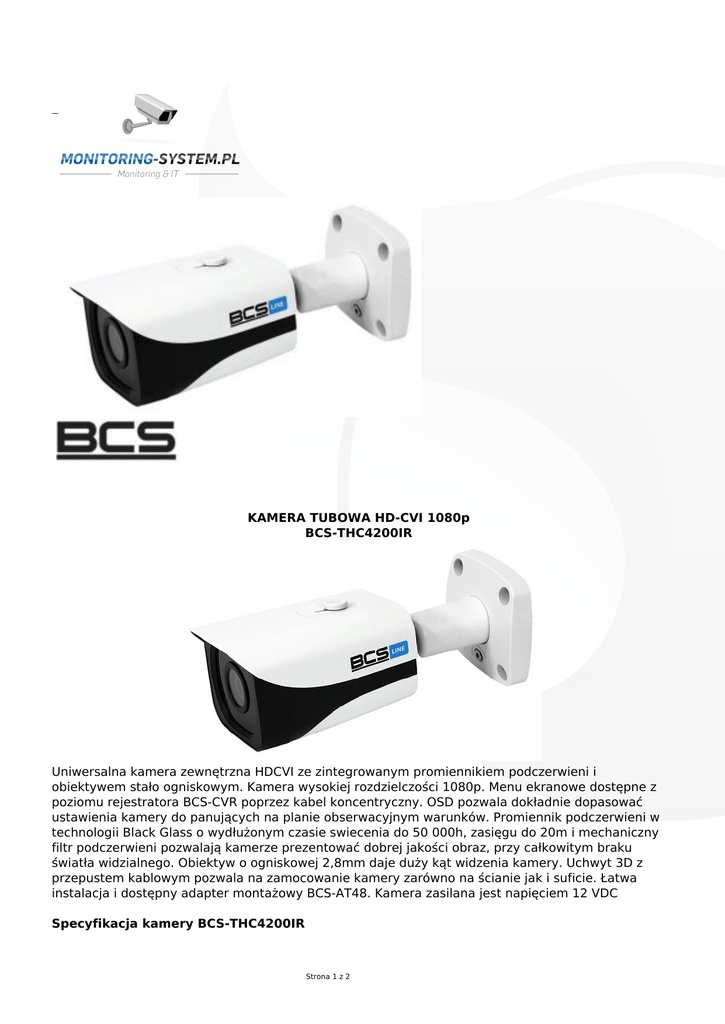 KAMERA TUBOWA HD-CVI 1080p BCS-THC4200IR Uniwersalna kamera zewnętrzna HDCVI ze zintegrowanym promiennikiem podczerwieni i obiektywem stało ogniskowym. Kamera wysokiej rozdzielczości 1080p. Menu ekranowe dostępne z poziomu rejestratora BCS-CVR poprzez kabel koncentryczny. OSD pozwala dokładnie dopasować ustawienia kamery do panujących na planie obserwacyjnym warunków. Promiennik podczerwieni w technologii Black Glass o wydłużonym czasie swiecenia do 50 000h, zasięgu do 20m i mechaniczny filtr podczerwieni pozwalają kamerze prezentować dobrej jakości obraz, przy całkowitym braku światła widzialnego. Obiektyw o ogniskowej 2,8mm daje duży kąt widzenia kamery. Uchwyt 3D z przepustem kablowym pozwala na zamocowanie kamery zarówno na ścianie jak i suficie. Łatwa instalacja i dostępny adapter montażowy BCS-AT48. Kamera zasilana jest napięciem 12 VDC Specyfikacja kamery BCS-THC4200IR Strona 1 z 2 kamera tubowa obsługująca standard HDCVI przetwornik: 1/3" 2MP CMOS rozdzielczość 1080p kompresja H.264 max. 25/30 kl/s w rozdzielczości 1080P czułość: 0.0 Lux/F2.0 (IR włącz.) obiektyw stałoogniskowy 2,8 mm mechaniczny filtr podczerwieni ICR promiennik podczerwieni o zasięgu do 30m w technologii Black Glass funkcja poprawiająca dynamikę kamery D-WDR z możliwością konfiguracji cyfrowa redukcja szumów 2DNR i 3DNR menu ekranowe z wieloma funkcjami konfiguracyjnymi dostępne przez kabel koncentryczny z poziomu rejestratorów BCS-CVR wydłużony czas świecenia do 50 000 godzin szyba dzielona z kołnierzem oddzielającym promiennik od obiektywu funkcje AGC, AES, BLC, maski prywatności uchwyt 3D z przepustem kablowym, łatwa instalacja, dostępne adaptery montażowe obudowa zewnętrzna IP66 zasilanie 12VDC/6W Strona 2 z 2