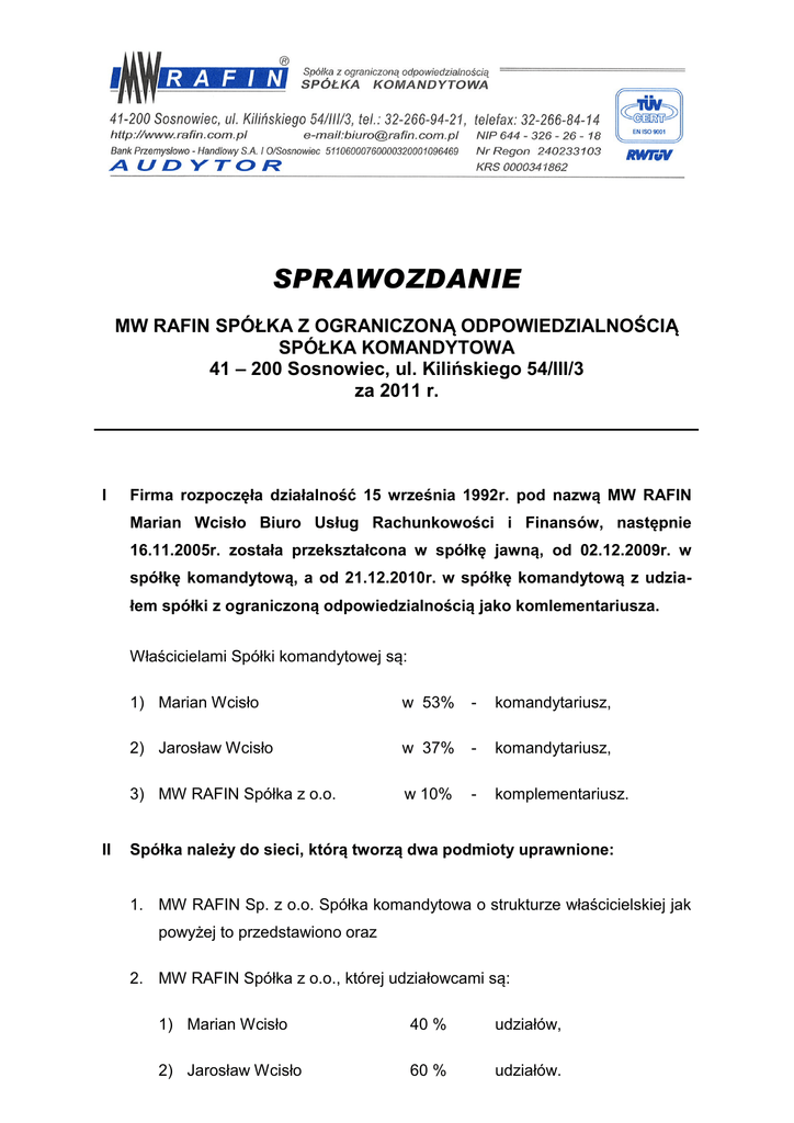 SPRAWOZDANIE MW RAFIN SPÓŁKA Z OGRANICZONĄ ODPOWIEDZIALNOŚCIĄ SPÓŁKA KOMANDYTOWA 41 – 200 Sosnowiec, ul. Kilińskiego 54/III/3 za 2011 r. I Firma rozpoczęła działalność 15 września 1992r. pod nazwą MW RAFIN Marian Wcisło Biuro Usług Rachunkowości i Finansów, następnie 16.11.2005r. została przekształcona w spółkę jawną, od 02.12.2009r. w spółkę komandytową, a od 21.12.2010r. w spółkę komandytową z udziałem spółki z ograniczoną odpowiedzialnością jako komlementariusza. Właścicielami Spółki komandytowej są: II 1) Marian Wcisło w 53% - komandytariusz, 2) Jarosław Wcisło w 37% - komandytariusz, 3) MW RAFIN Spółka z o.o. w 10% - komplementariusz. Spółka należy do sieci, którą tworzą dwa podmioty uprawnione: 1. MW RAFIN Sp. z o.o. Spółka komandytowa o strukturze właścicielskiej jak powyżej to przedstawiono oraz 2. MW RAFIN Spółka z o.o., której udziałowcami są: 1) Marian Wcisło 40 % udziałów, 2) Jarosław Wcisło 60 % udziałów. MW RAFIN Sp. z o.o. została zawiązana 20.10.2009r., a wpisana do KRS pod numerem 0000341345 w dniu 09.11.2009r. Spółka ta, pomimo że jest podmiotem uprawnionym, to od momentu powstania nie zatrudniała i nie zatrudnia żadnych biegłych rewidentów, nie wykonywała i aktualnie nie wykonuje czynności rewizji finansowej (art. 48 ust. 1 ustawy o biegłych rewidentach), jak również usług innych niż czynności rewizji finansowej (art. 48 ust. 2 ustawy o biegłych rewidentach). Spółka powstała głównie w celu współzarządzania – poprzez przede wszystkim wspólną strukturę właścicielską – wcześniej już istniejącym podmiotem uprawnionym, z możliwością przejęcia od niego w przyszłości części usług, o których mowa w art. 48 ust. 1 i 2 ustawy o biegłych rewidentach. Do tego czasu wszystkie wymienione usługi wykonuje przekształcona spółka komandytowa MW RAFIN Sp. z o.o. Spółka komandytowa. 04.01.2010r. została podpisana umowa o współzarządzenie pomiędzy MW RAFIN Marian Wcisło Spółka komandytowa, a MW RAFIN Sp. z o.o., na mocy której Spółka MW RAFIN Sp. z o.o., będzie brała udział w zarządzaniu Spółką MW RAFIN Marian Wcisło Spółka komandytowa, między innymi poprzez: 1) Tworzenie wspólnej dokumentacji prawno – organizacyjnej obu firm (np. polityki rachunkowości, obiegu dowodów księgowych, systemu kontroli wewnętrznej, kontroli jakości usług, itp.); 2) Opracowywanie materiałów szkoleniowych (skryptów, konspektów); 3) Organizowanie szkoleń dla pracowników etatowych oraz współpracujących; 4) Organizowanie Standardów szkoleń w Rachunkowości zakresie i rachunkowości Międzynarodowych (Polskich Standardów Sprawozdawczości Finansowej), finansów, podatków oraz zarządzania. Z tytułu realizacji tej umowy Spółka MW RAFIN Sp. z o.o. otrzymuje wynagrodzenie prowizyjne liczone procentem od sumy przychodów netto uzyskanych z wykonywania usług poświadczających oraz innych usług poświadczających przez Spółką MW RAFIN Marian Wcisło Spółka 2 komandytowa, a od momentu jej przekształcenia (tj. od 21.12.2010r.) przez Spółkę MW RAFIN Sp. z o.o. Spółka komandytowa. Wynagrodzenie to jest jedynym wynagrodzeniem jakie otrzymała Spółka MW RAFIN Sp. z o.o. z tytułu świadczonych przez siebie usług od początku swojej działalności. Z chwilą przekształcenia Spółki MW RAFIN Marian Wcisło Spółka komandytowa w Spółkę MW RAFIN Sp. z o.o. Spółka komandytowa, Spółka MW RAFIN Sp. z o.o. stała się komplementariuszem wcześniejszej Spółki komandytowej, dzięki czemu obie Spółki mają wspólny Zarząd. Od 01.01.2011r. Spółka MW RAFIN Sp. z o.o. wprowadziła u siebie wszystkie procedury jakie powinny obowiązywać w podmiocie uprawnionym, przejmując je od Spółki MW RAFIN Sp. z o.o. Spółka komandytowa. Od tego momentu obie Spółki mają wspólną strukturę właścicielską, wspólny Zarząd, wspólną politykę oraz procedury kontroli jakości i rozpoczęły pracę w sieci, z zachowaniem wyżej opisanej strategii działalności każdej ze Spółek. III Strukturę organizacyjną zarządzania Spółką przedstawia poniższy schemat organizacyjny: 3 MW RAFIN SPÓŁKA Z O.O. SPÓŁKA KOMANDYTOWA Właściciele Spółki komandytowej, DF tworzący jednocześnie Zarząd w Spółce z o.o. SDF DPO PEŁNOMOCNIK PREZESA D/S OCHRONY INFORMACJI NIEJAWNYCH ISO DW ZESPÓŁ WERYFIKATORÓW DKT KIEROWNIK KANCELARII TAJNEJ DM ZESPÓŁ RZECZOZNAWCÓW MAJĄTKOWYCH BM DZIAŁ MARKETINGU SYSTEM ZARZĄDZANIA JAKOŚCIĄ ASYSTENT WŁAŚCICIELI, DZIAŁ PERSONALNY DZ PEŁNOMOCNIK D/S ZARZĄDZANIA JAKOŚCIĄ BG DZIAŁ RACHUNKOWOŚCI I SPRAWOZDAWCZOŚCI FINANSOWEJ BS DR DZIAŁ OBSŁUGI SZKOLEŃ I SPRAW GOSPODARCZYCH ZESPÓŁ BIEGŁYCH REWIDENTÓW, APLIKANTÓW I ASYSTENTÓW BK DZIAŁ OBSŁUGI KOMPUTERÓW I KSERO Zatwierdzam zasada podległości podstawowe elementy funkcjonowania systemu zarządzania jakością Jarosław Wcisło Marian Wcisło Sosnowiec, czerwiec 2011 r 4 IV Opis systemu wewnętrznej kontroli jakości usług poświadczających przedstawia się następująco: Zasad, wynikających z tego systemu zobowiązani są przestrzegać stosownie do zakresu kompetencji i odpowiedzialności pracownicy: 1) Zespołu biegłych rewidentów, aplikantów i asystentów; 2) Zespołu Weryfikatorów; 3) Pełnomocnik ds. Zarządzania Jakością; 4) Asystent właścicieli – Dział Personalny; 5) Działu Marketingu; 6) Działu Obsługi Szkoleń i Spraw Gospodarczych; 7) Działu Rachunkowości i Sprawozdawczości Finansowej; 8) Działu Obsługi Komputerów; Integralną częścią „Systemu kontroli jakości usług poświadczających” są: 1. Księga Jakości System Zarządzania Jakością o znaku PN – EN ISO 9001:2008, w której określone są: 1) Prezentacja MW RAFIN definicje; 2) System zarządzania jakością; 3) Odpowiedzialność kierownictwa; 4) Zarządzanie zasobami; 5) Realizacja usług; 2. UCHWAŁA WSPÓLNIKÓW NR 3/12/2011 z dnia 29 g