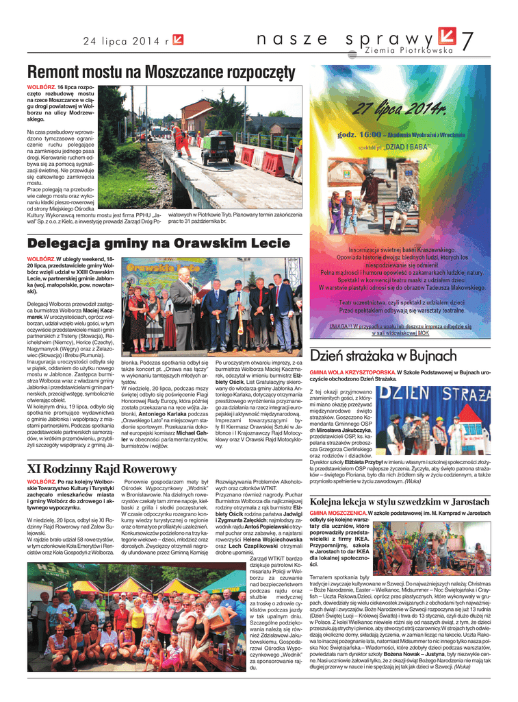 nasze sprawy 24 lipca 2014 r Ziemia Piotrkowska 7 Remont mostu na Moszczance rozpoczęty WOLBÓRZ. 16 lipca rozpoczęto rozbudowę mostu na rzece Moszczance w ciągu drogi powiatowej w Wolborzu na ulicy Modrzewskiego. Na czas przebudowy wprowadzono tymczasowe ograniczenie ruchu polegające na zamknięciu jednego pasa drogi. Kierowanie ruchem odbywa się za pomocą sygnalizacji świetlnej. Nie przewiduje się całkowitego zamknięcia mostu. Prace polegają na przebudowie całego mostu oraz wykonaniu kładki pieszo-rowerowej od strony Miejskiego Ośrodka Kultury. Wykonawcą remontu mostu jest firma PPHU „Jawal” Sp. z o.o. z Kielc, a inwestycję prowadzi Zarząd Dróg Po- wiatowych w Piotrkowie Tryb. Planowany termin zakończenia prac to 31 października br. Delegacja gminy na O rawskim Lecie WOLBÓRZ. W ubiegły weekend, 1820 lipca, przedstawiciele gminy Wolbórz wzięli udział w XXIII Orawskim Lecie, w partnerskiej gminie Jabłonka (woj. małopolskie, pow. nowotarski). Delegacji Wolborza przewodził zastępca burmistrza Wolborza Maciej Kaczmarek.W uroczystościach, oprócz wolborzan, udział wzięło wielu gości, w tym oczywiście przedstawiciele miast i gmin partnerskich z Trsteny (Słowacja), Reichelsheim (Niemcy), Horice (Czechy), Nagymanyok (Węgry) oraz z Żelazowiec (Słowacja) i Brebu (Rumunia). Inauguracja uroczystości odbyła się w piątek, oddaniem do użytku nowego mostu w Jabłonce. Zastępca burmistrza Wolborza wraz z władzami gminy Jabłonka i przedstawicielami gmin partnerskich, przeciął wstęgę, symbolicznie otwierając obiekt. W kolejnym dniu, 19 lipca, odbyło się spotkanie promujące wydawnictwa o gminie Jabłonka i współpracy z miastami partnerskimi. Podczas spotkania przedstawiciele partnerskich samorządów, w krótkim przemówieniu, przybliżyli szczegóły współpracy z gminą Ja- błonka. Podczas spotkania odbył się także koncert pt. „Orawa nas łączy” w wykonaniu tamtejszych młodych artystów. W niedzielę, 20 lipca, podczas mszy świętej odbyło się poświęcenie Flagi Honorowej Rady Europy, która później została przekazana na ręce wójta Jabłonki, Antoniego Karlaka podczas „Orawskiego Lato” na miejscowym stadionie sportowym. Przekazania dokonał europejski komisarz Michael Gahler w obecności parlamentarzystów, burmistrzów i wójtów. Po uroczystym otwarciu imprezy, z-ca burmistrza Wolborza Maciej Kaczmarek, odczytał w imieniu burmistrz Elżbiety Ościk, List Gratulacyjny skierowany do włodarza gminy Jabłonka Antoniego Karlaka, dotyczący otrzymania prestiżowego wyróżnienia przyznanego za działania na rzecz integracji europejskiej i aktywność międzynarodową. Imprezami towarzyszącymi były III Kiermasz Orawskiej Sztuki w Jabłonce i I Krajoznawczy Rajd Motocyklowy oraz V Orawski Rajd Motocyklowy. XI Rodzinny Rajd Rowerowy WOLBÓRZ. Po raz kolejny Wolborskie Towarzystwo Kultury i Turystyki zachęcało mieszkańców miasta i gminy Wolbórz do zdrowego i aktywnego wypoczynku. W niedzielę, 20 lipca, odbył się XI Rodzinny Rajd Rowerowy nad Zalew Sulejowski. W rajdzie brało udział 58 rowerzystów, w tym członkowie Koła Emerytów i Rencistów oraz Koła Gospodyń z Wolborza. Ponownie gospodarzem mety był Ośrodek Wypoczynkowy „Wodnik” w Bronisławowie. Na dzielnych rowerzystów czekały tam zimne napoje, kiełbaski z grilla i słodki poczęstunek. W czasie odpoczynku rozegrano konkursy wiedzy turystycznej o regionie oraz o tematyce profilaktyki uzależnień. Konkursowiczów podzielono na trzy kategorie wiekowe – dzieci, młodzież oraz dorosłych. Zwycięzcy otrzymali nagrody ufundowane przez Gminną Komisję Rozwiązywania Problemów Alkoholowych oraz członków WTKiT. Przyznano również nagrody. Puchar Burmistrza Wolborza dla najliczniejszej rodziny otrzymała z rąk burmistrz Elżbiety Ościk rodzina państwa Jadwigi i Zygmunta Załęckich; najmłodszy zawodnik rajdu Antoś Popielawski otrzymał puchar oraz zabawkę, a najstarsi rowerzyści Helena Wojciechowska oraz Lech Czaplikowski otrzymali drobne upominki. Zarząd WTKiT bardzo dziękuje patrolowi Komisariatu Policji w Wolborzu za czuwanie nad bezpieczeństwem podczas rajdu oraz służbie medycznej za troskę o zdrowie cyklistów podczas jazdy w tak upalnym dniu. Szczególne podziękowania należą się również Zdzisławowi Jakubowskiemu, Gospodarzowi Ośrodka Wypoczynkowego „Wodnik” za sponsorowanie rajdu. Dzień strażaka w Bujnach GMINA WOLA KRZYSZTOPORSKA.W Szkole Podstawowej w Bujnach uroczyście obchodzono Dzień Strażaka. Z tej okazji przyjmowano znamienitych gości, z którymi miano okazję przeżywać międzynarodowe święto strażaków. Goszczono Komendanta Gminnego OSP dh Mirosława Jakubczyka, przedstawicieli OSP, ks. kapelana strażaków proboszcza Grzegorza Cierlińskiego oraz rodziców i dziadków. Dyrektor szkoły Elżbieta Przybył w imieniu własnym i szkolnej społeczności złożyła przedstawicielom OSP najlepsze życzenia. Życzyła, aby święto patrona strażaków – świętego Floriana, było dla nich źródłem siły w życiu codziennym, a także przyniosło spełnienie w życiu zawodowym.(Wuka) Kolejna lekcja w stylu szwedzkim w Jarostach GMINA MOSZCZENICA.W szkole podstawowej im. M. Kamprad w Jarostach odbyły się kolejne warsztaty dla uczniów, które poprowadziły przedstawicielki z firmy IKEA. Przypomnijmy, szkoła w Jarostach to dar IKEA dla lokalnej społeczności. Tematem spotkania były tradycje i zwyczaje kultywowane w Szwecji.Do najważniejszych należą: Christmas – Boże Narodzenie, Easter – Wielkanoc, Midsummer – Noc Świętojańska i Crayfish – Uczta Rakowa.Dzieci, oprócz prac plastycznych, które wykonywały w grupach, dowiedziały się wielu ciekawostek związanych z obchodami tych najważniejszych świąt i zwyczajów. Boże Narodzenie w Szwecji rozpoczyna się już 13 rudnia (Dzień Świętej Łucji – Królowej Światła) i trwa do 13 stycznia, czyli dużo dłużej niż w Polsce. Z k