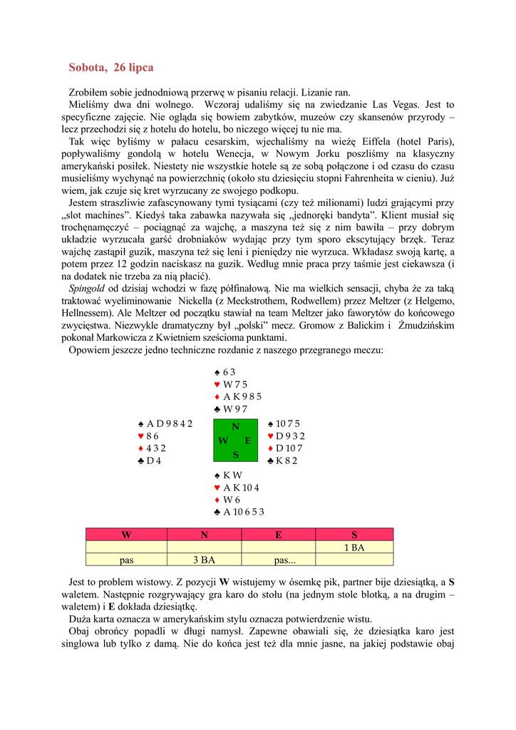 Sobota, 26 lipca Zrobiłem sobie jednodniową przerwę w pisaniu relacji. Lizanie ran. Mieliśmy dwa dni wolnego. Wczoraj udaliśmy się na zwiedzanie Las Vegas. Jest to specyficzne zajęcie. Nie ogląda się bowiem zabytków, muzeów czy skansenów przyrody – lecz przechodzi się z hotelu do hotelu, bo niczego więcej tu nie ma. Tak więc byliśmy w pałacu cesarskim, wjechaliśmy na wieżę Eiffela (hotel Paris), popływaliśmy gondolą w hotelu Wenecja, w Nowym Jorku poszliśmy na klasyczny amerykański posiłek. Niestety nie wszystkie hotele są ze sobą połączone i od czasu do czasu musieliśmy wychynąć na powierzchnię (około stu dziesięciu stopni Fahrenheita w cieniu). Już wiem, jak czuje się kret wyrzucany ze swojego podkopu. Jestem straszliwie zafascynowany tymi tysiącami (czy też milionami) ludzi grającymi przy „slot machines”. Kiedyś taka zabawka nazywała się „jednoręki bandyta”. Klient musiał się trochęnamęczyć – pociągnąć za wajchę, a maszyna też się z nim bawiła – przy dobrym układzie wyrzucała garść drobniaków wydając przy tym sporo ekscytujący brzęk. Teraz wajchę zastąpił guzik, maszyna też się leni i pieniędzy nie wyrzuca. Wkładasz swoją kartę, a potem przez 12 godzin naciskasz na guzik. Według mnie praca przy taśmie jest ciekawsza (i na dodatek nie trzeba za nią płacić). Spingold od dzisiaj wchodzi w fazę półfinałową. Nie ma wielkich sensacji, chyba że za taką traktować wyeliminowanie Nickella (z Meckstrothem, Rodwellem) przez Meltzer (z Helgemo, Hellnessem). Ale Meltzer od początku stawiał na team Meltzer jako faworytów do końcowego zwycięstwa. Niezwykle dramatyczny był „polski” mecz. Gromow z Balickim i Żmudzińskim pokonał Markowicza z Kwietniem sześcioma punktami. Opowiem jeszcze jedno techniczne rozdanie z naszego przegranego meczu: ♠ ♥ ♦ ♣ ♠ AD9842 ♥86 ♦ 432 ♣D4 N W E S ♠ ♥ ♦ ♣ W 63 W75 AK985 W97 N ♠ 10 7 5 ♥D932 ♦ D 10 7 ♣K82 KW A K 10 4 W6 A 10 6 5 3 E S 1 BA pas 3 BA pas... Jest to problem wistowy. Z pozycji W wistujemy w ósemkę pik, partner bije dziesiątką, a S waletem. Następnie rozgrywający gra karo do stołu (na jednym stole blotką, a na drugim – waletem) i E dokłada dziesiątkę. Duża karta oznacza w amerykańskim stylu oznacza potwierdzenie wistu. Obaj obrońcy popadli w długi namysł. Zapewne obawiali się, że dziesiątka karo jest singlowa lub tylko z damą. Nie do końca jest też dla mnie jasne, na jakiej podstawie obaj obrońcy na E zorientowali się, że trzeba wist potwierdzić – partner mógł mieć tylko pięć pików (pewnie uznali, że i tak nie dojdą do podegrania). W każdym razie na naszym stole po 5-minutowej agonii Granovetter szarpnął asa pik. Bez dwóch. Na drugim stole Diamond po równie ciężkim namyśle wyszedł w kiera. Problem tego typu jesz szeroko opisywany w literaturze. Wydaje się, że najlepszym rozwiązaniem jest ilościówka zastępcza z pozycji gracza E. W pierwszym kolorze rozgrywającego sygnalizujemy ilość kart w kolorze wistu. To jeszcze jest łatwe. Niezwykle ciężko jest natomiast zdefiniować, kiedy taki typ marki zastosować. Ja bym to zawęził to do sytuacji, gdy spełnione są warunki: a) Kontrakt bezatutowy b) Na stole leżą same blotki w kolorze wistu c) Wist był spod figury i został pobity na trzecim ręku d) Rozgrywający wziął lewę bezpośrednio wyższą niż położona przez drugiego broniącego (np. pobił dziesiątkę waletem lub waleta damą) Dzisiaj próbujemy się odbić w turnieju Swiss. Grają tam wszyscy oprócz półfinalistów Spingolda. Też niełatwy turniej.