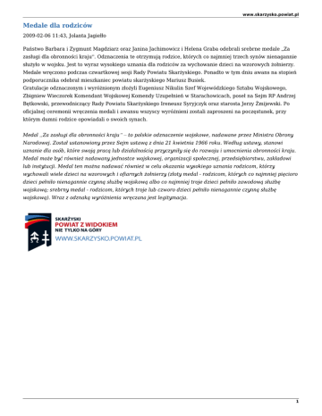 www.skarzysko.powiat.pl Medale dla rodziców 2009-02-06 11:43, Jolanta Jagiełło Państwo Barbara i Zygmunt Magdziarz oraz Janina Jachimowicz i Helena Graba odebrali srebrne medale „Za zasługi dla obronności kraju”. Odznaczenia te otrzymują rodzice, których co najmniej trzech synów nienagannie służyło w wojsku. Jest to wyraz wysokiego uznania dla rodziców za wychowanie dzieci na wzorowych żołnierzy. Medale wręczono podczas czwartkowej sesji Rady Powiatu Skarżyskiego. Ponadto w tym dniu awans na stopień podporucznika odebrał mieszkaniec powiatu skarżyskiego Mariusz Busiek. Gratulacje odznaczonym i wyróżnionym złożyli Eugeniusz Nikulin Szef Wojewódzkiego Sztabu Wojskowego, Zbigniew Wieczorek Komendant Wojskowej Komendy Uzupełnień w Starachowicach, poseł na Sejm RP Andrzej Bętkowski, przewodniczący Rady Powiatu Skarżyskiego Ireneusz Syryjczyk oraz starosta Jerzy Żmijewski. Po oficjalnej ceremonii wręczenia medali i awansu wszyscy wyróżnieni zostali zaproszeni na poczęstunek, przy którym dumni rodzice opowiadali o swoich synach. Medal „Za zasługi dla obronności kraju” – to polskie odznaczenie wojskowe, nadawane przez Ministra Obrony Narodowej. Został ustanowiony przez Sejm ustawą z dnia 21 kwietnia 1966 roku. Według ustawy, stanowi uznanie dla osób, które swoją pracą lub działalnością przyczyniły się do rozwoju i umocnienia obronności kraju. Medal może być również nadawany jednostce wojskowej, organizacji społecznej, przedsiębiorstwu, zakładowi lub instytucji. Medal ten można nadawać również w celu okazania wysokiego uznania rodzicom, którzy wychowali wiele dzieci na wzorowych i ofiarnych żołnierzy (złoty medal - rodzicom, których co najmniej pięcioro dzieci pełniło nienagannie czynną służbę wojskową albo co najmniej troje dzieci pełniło zawodową służbę wojskową; srebrny medal - rodzicom, których troje lub czworo dzieci pełniło nienagannie czynną służbę wojskową). Wraz z odznaką wyróżnienia wręczana jest legitymacja. 1