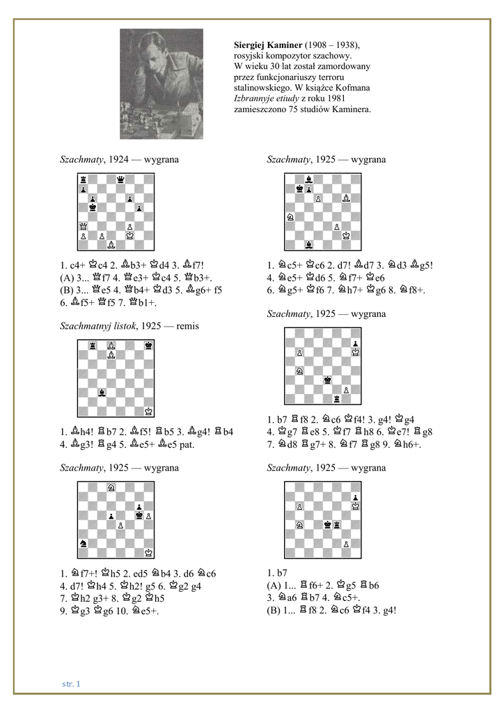 Siergiej Kaminer (1908 – 1938), rosyjski kompozytor szachowy. W wieku 30 lat został zamordowany przez funkcjonariuszy terroru stalinowskiego. W książce Kofmana Izbrannyje etiudy z roku 1981 zamieszczono 75 studiów Kaminera. Szachmaty, 1924 — wygrana Szachmaty, 1925 — wygrana )........*! !0u, ,x, ,]! 0P , , , ]! !0 P , P ,]! 0,m, , P ]! !0 , , , ,]! 0R , ,q, ]! !0q,q, L ,]! 0, ,c, , ]! !\````````^! )........*! !0 ,o, , ,]! 0,mP , , ]! !0 , Q ,c,]! 0, , , , ]! !0i, , , ,]! 0, , ,q, ]! !0 , , ,l,]! 0, O , , ]! !\````````^! 1. c4+ lc4 2. cb3+ ld4 3. cf7! (A) 3... rf7 4. re3+ lc4 5. rb3+. (B) 3... re5 4. rb4+ ld3 5. cg6+ f5 6. cf5+ rf5 7. rb1+. 1. ic5+ lc6 2. d7! cd7 3. id3 cg5! 4. ie5+ ld6 5. if7+ le6 6. ig5+ lf6 7. ih7+ lg6 8. if8+. Szachmaty, 1925 — wygrana Szachmatnyj listok, 1925 — remis )........*! !0 U C , M]! 0, ,c, , ]! !0 , , , ,]! 0, , , , ]! !0 , , , ,]! 0, O , , ]! !0 , , , ,]! 0, , , ,l]! !\````````^! )........*! !0 , , , ,]! 0, , , ,p]! !0 Q , , L]! 0, , , , ]! !0 I , , ,]! 0, , M , ]! !0 , , ,q,]! 0, , ,u, ]! !\````````^! 1. ch4! sb7 2. cf5! sb5 3. cg4! sb4 4. cg3! sg4 5. ce5+ ce5 pat. 1. b7 sf8 2. ic6 lf4! 3. g4! lg4 4. lg7 se8 5. lf7 sh8 6. le7! sg8 7. id8 sg7+ 8. if7 sg8 9. ih6+. Szachmaty, 1925 — wygrana Szachmaty, 1925 — wygrana )........*! !0 , I , ,]! 0, , , , ]! !0 , , ,p,]! 0, ,p, Mq]! !0 , ,q, ,]! 0, , , , ]! !0k, , , ,]! 0, , , ,l]! !\````````^! )........*! !0 , , , ,]! 0, , , ,p]! !0 Q , , L]! 0, , , , ]! !0 I ,mU ,]! 0, , , , ]! !0 , , ,q,]! 0, , , , ]! !\````````^! 1. if7+! lh5 2. ed5 ib4 3. d6 ic6 4. d7! lh4 5. lh2! g5 6. lg2 g4 7. lh2 g3+ 8. lg2 lh5 9. lg3 lg6 10. ie5+. str. 1 1. b7 (A) 1... sf6+ 2. lg5 sb6 3. ia6 sb7 4. ic5+. (B) 1... sf8 2. ic6 lf4 3. g4! Szachmaty, 1925 — wygrana )........*! !0 I , , ,]! 0, , , ,p]! !0 Qp, , L]! 0, ,u,o,s]! !0 , , , ,]! 0, , ,mQ ]! !0 , , , ,]! 0, , , , ]! !\````````^! 1. b7 sb5 2. sf5+ sf5 3. ic6 sf8 4. g4! lg4 5. lg7 se8 6. lf7 sh8 7. le7 sg8 8. id8 sg7+ 9. if7 sg8 10. ih6+. Szachmaty, 1925 — wygrana )........*! !0 ,x, , ,]! 0, , , , ]! !0 , , ,p,]! 0C , , ,p]! !0 , , , M]! 0, , , ,q]! !0s, , ,qL]! 0, , , , ]! !\````````^! 1. sc2 (A) 1... rc2 2. cd8+ g5 3. ca5 re2 4. cc7 rf2 5. cd6 rf4+ 6. g3+ rg3+ 7. cg3x. (B) 1... rf8 2. sc4+ lg5 3. cd2+ lf6 4. sf4+. (B) 3... cc4 4. sa4. (C) 3... cf1 4. sa1 ch3 5. lg3 cg4 6. f4+ lh5 7. sh1+. Szachmatnyj listok, 1926 — wygrana )........*! !0 , , , ,]! 0Mp, , , ]! !0 , ,pP ,]! 0, , ,q, ]! !0 , ,q, P]! 0, , , , ]! !0 , S ,lQ]! 0,u, , , ]! !\````````^! 1. e5 ef5! 2. ef6 sb6 3. f7 sf6 4. sd7 f4 5. lf3 h3 6. se7! sf5 7. sc7 sf6 8. sd7! sf5 9. le4 sf6 10. le5. Szachmaty, 1926 — wygrana )........*! !0u, ,m, ,]! 0P , , Pp]! !0 , , P ,]! 0,l, K , ]! !0q, , Qi,]! 0, , , , ]! !0 S , ,q,]! 0, , , , ]! !\````````^! 1. se2 sb8+ 2. la5 sb2 3. se4!* sg2 4. ie3 se2 5. fe5 f5 6. if5. *3. se1? sg2 4. ie3 ic6+ 5. lb5 se2. Szachmaty, 1926 — wygrana )........*! !0 , , , ,]! 0, , ,m, ]! !0 , , , ,]! 0, Cs, , ]! !0o, , , ,]! 0, , , , ]! !0 Q ,p,lP]! 0,k, , , ]! !\````````^! 1. se5 id2! 2. se2 h1r+ 3. lh1 ie4! 4. cf2 cd1 5. se1 if2+ 6. lg2 id3 7. sd1 ib2 8. sd4. Szachmatnyj listok, 1926 — wygrana )........*! !0 ,o, , ,]! 0, ,p, , ]! !0 , ,p, ,]! 0, , , ,m]! !0 O ,q, ,]! 0, , ,l, ]! !0 ,q, Q ,]! 0, ,s, , ]! !\````````^! 1. sh1+ lg5 2. sh8 ca6 3. sa8 (A) 3... cb7 4. sb8. str. 2 Szachmaty, 1926 — wygrana )........*! !0 ,i,m, ,]! 0,p,p, ,p]! !0 , O , ,]! 0, , P , ]! !0 , , , ,]! 0P ,xQ , ]! !0q, Q , ,]! 0, , L ,r]! !\````````^! 1. re4! ra6 2. rb7 rd3 3. re4 ra6 4. rc4 (A) 4... rc4 5. id6+. (B) 4... rc6 5. rc6. Szachmatnyj listok, 1926 — wygrana Berliner Tageblatt, 1927 — wygrana )........*! !0 , X , ,]! 0P P , , ]! !0 , U , ,]! 0, I Kp,p]! !0rC , , M]! 0, ,q, , ]! !0 , , QlQ]! 0, , , , ]! !\````````^! )........*! !0 , , , ,]! 0, , , , ]! !0 , , , ,]! 0, , , , ]! !0 S , , ,]! 0, , ,m,u]! !0o,c, , Q]! 0, , , L ]! !\````````^! 1. ce1+ (A) 1... ig4 2. f4+ if2 3. cf2+. (B) 1... sd4 2. f4+ lg4 3. rd1+. (C) 1... lg5 2. ie6+ se6 3. rh4+! lh4 4. f4+ lg4 5. h3+ lf4 6. cd2x. Szachmatnyj listok, 1926 — wygrana )........*! !0 , X , ,]! 0P P , , ]! !0 , Up, ,]! 0, I Kp,p]! !0rC , , M]! 0, ,q, , ]! !0 , , QlQ]! 0, , , , ]! !\````````^! 1. ce1+ lg5 2. ie6+! se6 3. rh4+! lh4 4. f4+ lg4 5. h3+ lf4 6. cd2x. Szachmatnyj listok, 1926 — remis )........*! !0 , , , ,]! 0Mp, , , ]! !0 , , O ,]! 0, , , Kp]! !0q, , L ,]! 0, , , C ]! !0 , , ,q,]! 0, , , , ]! !\````````^! 1. lf5 cd8 2. cf4 ih7 3. lg6 if8+ 4. lf7 id7 5. le8 ic5 6. ce3 cb6 7. a5 (A) 7... ca5 8. cc5+. (B) 7... la6 8. ab6 lb6 9. lf7. Zadaczi i etiudy, 1927 — wygrana )........*! !0 , , , ,]! 0, , , ,p]! !0 , , ,q,]! 0, , , Q ]! !0 , , Um,]! 0,c, P , ]! !0 , , , Q]! 0, , , L ]! !\````````^! 1. cd1+ e2 2. ce2+ lg5 3. g7 (A) 3... lh6 4. g8s. (B) 3... sg4+ 4. cg4 lh6 5. g8i+! str. 3 1. cd1+ le3 2. cb3 cb1 3. ce6 sh6 4. sb1 se6 5. se1+. Krasnyj chimik, 1927 — remis )........*! !0 , , ,c,]! 0,m, ,p, ]! !0 , , ,q,]! 0Q Oq, , ]! !0l, , , ,]! 0, ,o,p, ]! !0 , , , C]! 0, , , , ]! !\````````^! 1. cg1 cg1 2. gf7 cc5 3. d6 cd6 4. f8r cf8 5. cd5+ la6 6. cc4+ cc4. Szachmatnyj listok, 1927 — remis )........*! !0 , , , ,]! 0, , , Pp]! !0 ,o, , ,]! 0, M , , ]! !0 , , ,c,]! 0S ,l, , ]! !0 , , , ,]! 0, , , ,u]! !\````````^! 1. sc3+ lb5! 2. sc6 (A) 2... sg1! 3. cf3 sg3 4. le2 sf3 5. sh6. (B) 2... sh4 3. cd7. Berliner Tageblatt, 1927 — wygrana )........*! !0 , O , ,]! 0,c, P ,m]! !0 , , ,p,]! 0,qP , , ]! !0 , , , ,]! 0,k, ,i, ]! !0 , , ,q,]! 0, , , L ]! !\````````^! 1. ig5+ lg8 2. cd5+ e6 3. ie6* cb6 4. ic7+ lf8 5. ia8 cc7 6. b6. *3. ce6+? lf8 4. cb3 cg5. Szachmaty, 1927 — wygrana Szachmaty, 1928 — wygrana )........*! !0 , ,o, ,]! 0, ,p, , ]! !0 Q M , ,]! 0, , , P ]! !0p, , , ,]! 0, , ,iQ ]! !0cQ , ,l,]! 0, O , , ]! !\````````^! )........*! !0 , , Cl,]! 0, , ,p, ]! !0 , , , ,]! 0Q , , , ]! !0 , , , ,]! 0, , ,i, ]! !0qM , , ,]! 0, ,k, ,u]! !\````````^! 1. ie5! ch5 2. lf1 cd1 3. cd5 ce3 4. ic4+ ld5 5. ie3+ lc6 6. id1. 1. a6 sh5 2. ie5 sh4 3. cb4 sh6 4. cd6