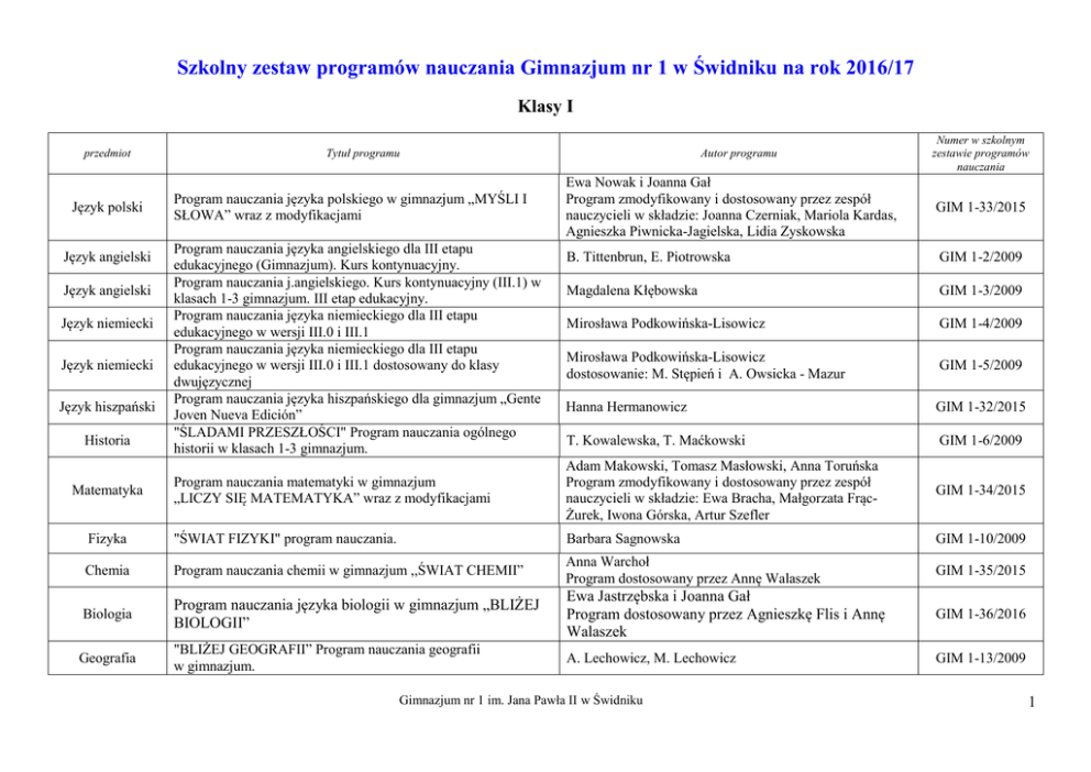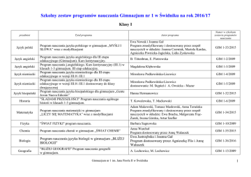 Szkolny zestaw programów nauczania Gimnazjum nr 1 w Świdniku na rok 2016/17 Klasy I Tytuł programu przedmiot Autor programu Numer w szkolnym zestawie programów nauczania Ewa Nowak i Joanna Gał Program zmodyfikowany i dostosowany przez zespół nauczycieli w składzie: Joanna Czerniak, Mariola Kardas, Agnieszka Piwnicka-Jagielska, Lidia Zyskowska GIM 1-33/2015 B. Tittenbrun, E. Piotrowska GIM 1-2/2009 Magdalena Kłębowska GIM 1-3/2009 Mirosława Podkowińska-Lisowicz GIM 1-4/2009 Mirosława Podkowińska-Lisowicz dostosowanie: M. Stępień i A. Owsicka - Mazur GIM 1-5/2009 Hanna Hermanowicz GIM 1-32/2015 T. Kowalewska, T. Maćkowski GIM 1-6/2009 Program nauczania matematyki w gimnazjum „LICZY SIĘ MATEMATYKA” wraz z modyfikacjami Adam Makowski, Tomasz Masłowski, Anna Toruńska Program zmodyfikowany i dostosowany przez zespół nauczycieli w składzie: Ewa Bracha, Małgorzata FrącŻurek, Iwona Górska, Artur Szefler GIM 1-34/2015 Fizyka "ŚWIAT FIZYKI" program nauczania. Barbara Sagnowska GIM 1-10/2009 Chemia Program nauczania chemii w gimnazjum ,,ŚWIAT CHEMII” Anna Warchoł Program dostosowany przez Annę Walaszek GIM 1-35/2015 Biologia Program nauczania języka biologii w gimnazjum „BLIŻEJ BIOLOGII” Ewa Jastrzębska i Joanna Gał Program dostosowany przez Agnieszkę Flis i Annę Walaszek GIM 1-36/2016 Geografia "BLIŻEJ GEOGRAFII” Program nauczania geografii w gimnazjum. A. Lechowicz, M. Lechowicz GIM 1-13/2009 Język polski Język angielski Język angielski Język niemiecki Język niemiecki Język hiszpański Historia Matematyka Program nauczania języka polskiego w gimnazjum „MYŚLI I SŁOWA” wraz z modyfikacjami Program nauczania języka angielskiego dla III etapu edukacyjnego (Gimnazjum). Kurs kontynuacyjny. Program nauczania j.angielskiego. Kurs kontynuacyjny (III.1) w klasach 1-3 gimnazjum. III etap edukacyjny. Program nauczania języka niemieckiego dla III etapu edukacyjnego w wersji III.0 i III.1 Program nauczania języka niemieckiego dla III etapu edukacyjnego w wersji III.0 i III.1 dostosowany do klasy dwujęzycznej Program nauczania języka hiszpańskiego dla gimnazjum „Gente Joven Nueva Edición” "ŚLADAMI PRZESZŁOŚCI" Program nauczania ogólnego historii w klasach 1-3 gimnazjum. zatwierdzono na RP 24.05.2007 Gimnazjum nr 1 im. Jana Pawła II w Świdniku 1 Plastyka „KRAINA SZTUKI” Program nauczania plastyki w gimnazjum. Elżbieta Jezierska GIM 1-14/2009 Muzyka „Muzyka. Program nauczania dla gimnazjum” Krystyna Serwańska GIM 1-15/2009 Program nauczania informatyki LEKCJA Z KOMPUTEREM” wraz z modyfikacjami Wanda Jochemczyk, Witold Kranas, Mirosław Wyczółkowski. Program modyfikowany i dostosowany przez Zbigniewa Jastrzębskiego GIM 1-37/2016 Barbara Gutek, Jacek Czerniakowski, Cezary Sekuła, Aneta Stawecka GIM 1-28/2012 T. Król, K. Maśnik, G. Węglarczyk GIM 1-8/2009 Komisja Wychowania Katolickiego Konferencji Episkopatu Polski GIM 1-29/2013 Elżbieta Wielogołaska, Katarzyna Niedrygoś, Agnieszka Pietrzak. GIM 1-18/2009 Informatyka Wychowanie fizyczne Wychowanie do życia w rodzinie Religia Etyka Program Własny Wychowania Fizycznego z Edukacją Zdrowotną dla III etapu kształcenia – Gimnazjum z rozszerzeniem dla oddziału sportowego „Wychowanie do życia w rodzinie. Program nauczania dla kl. IIII gimnazjum. Program nauczania religii rzymskokatolickiej w przedszkolach i szkołach Gimnazjum - PÓJŚĆ ZA JEZUSEM CHRYSTUSEM (AZ-3-01/10) ETYKA - SZTUKA ŻYCIA. Program nauczania etyki w klasach 1-3 gimnazjum. Klasy II Tytuł programu przedmiot Język polski Język angielski Język angielski Język niemiecki Język niemiecki Program nauczania języka polskiego w gimnazjum „MYŚLI I SŁOWA” wraz z modyfikacjami Program nauczania języka angielskiego dla III etapu edukacyjnego (Gimnazjum). Kurs kontynuacyjny. Program nauczania j.angielskiego. Kurs kontynuacyjny (III.1) w klasach 1-3 gimnazjum. III etap edukacyjny. Program nauczania języka niemieckiego dla III etapu edukacyjnego w wersji III.0 i III.1 Program nauczania języka niemieckiego dla III etapu edukacyjnego w wersji III.0 i III.1 dostosowany do klasy dwujęzycznej zatwierdzono na RP 24.05.2007 Autor programu Numer w szkolnym zestawie programów nauczania Ewa Nowak i Joanna Gał Program zmodyfikowany i dostosowany przez zespół nauczycieli w składzie: Joanna Czerniak, Mariola Kardas, Agnieszka Piwnicka-Jagielska, Lidia Zyskowska GIM 1-33/2015 B. Tittenbrun, E. Piotrowska GIM 1-2/2009 Magdalena Kłębowska GIM 1-3/2009 Mirosława Podkowińska-Lisowicz GIM 1-4/2009 Mirosława Podkowińska-Lisowicz dostosowanie: M. Stępień i A. Owsicka - Mazur GIM 1-5/2009 Gimnazjum nr 1 im. Jana Pawła II w Świdniku 2 Język hiszpański Historia Wiedza o społeczeństwie Program nauczania języka hiszpańskiego dla gimnazjum „Gente Joven Nueva Edición” "ŚLADAMI PRZESZŁOŚCI" Program nauczania ogólnego historii w klasach 1-3 gimnazjum. Program nauczania ogólnego wiedzy o społeczeństwie w klasach I – III gimnazjum ,,DZIŚ I JUTRO” Hanna Hermanowicz GIM 1-32/2015 T. Kowalewska, T. Maćkowski GIM 1-6/2009 Teresa Kowalewska Program dostosowany przez Renatę Piątkiewicz i Anetę Żelazną GIM 1-38/2016 Program nauczania matematyki w gimnazjum „LICZY SIĘ MATEMATYKA” wraz z modyfikacjami Adam Makowski, Tomasz Masłowski, Anna Toruńska Program zmodyfikowany i dostosowany przez zespół nauczycieli w składzie: Ewa Bracha, Małgorzata FrącŻurek, Iwona Górska, Artur Szefler GIM 1-34/2015 Fizyka "ŚWIAT FIZYKI" program nauczania. Barbara Sagnowska GIM 1-10/2009 Chemia Program nauczania chemii w gimnazjum ,,ŚWIAT CHEMII” Anna Warchoł Program dostosowany przez Annę Walaszek GIM 1-35/2015 Biologia „ŚWIAT BIOLOGII" Program nauczania biologii w gimnazjum Małgorzata Liśkiewicz GIM 1-12/2009 Geografia "BLIŻEJ GEOGRAFII” Program nauczania geografii w gimnazjum. A. Lechowicz, M. Lechowicz GIM 1-13/2009 Plastyka „KRAINA SZTUKI” Program nauczania plastyki w gimnazju