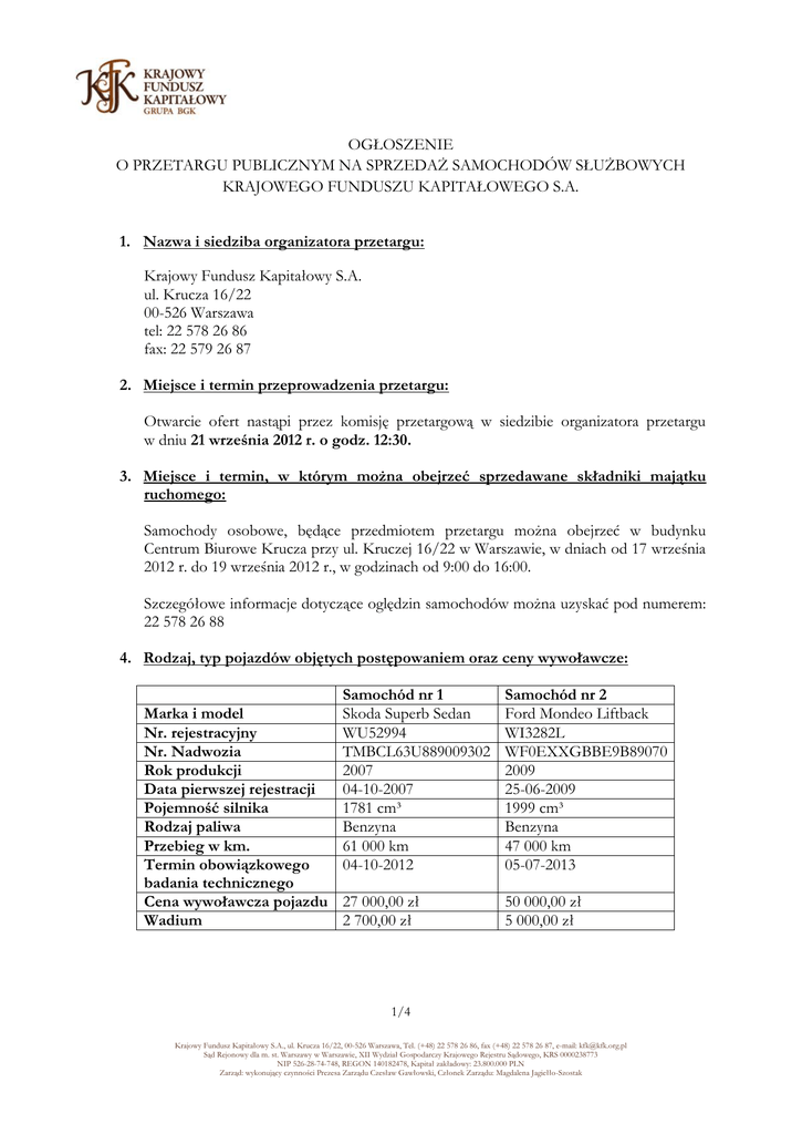 OGŁOSZENIE O PRZETARGU PUBLICZNYM NA SPRZEDAŻ SAMOCHODÓW SŁUŻBOWYCH KRAJOWEGO FUNDUSZU KAPITAŁOWEGO S.A. 1. Nazwa i siedziba organizatora przetargu: Krajowy Fundusz Kapitałowy S.A. ul. Krucza 16/22 00-526 Warszawa tel: 22 578 26 86 fax: 22 579 26 87 2. Miejsce i termin przeprowadzenia przetargu: Otwarcie ofert nastąpi przez komisję przetargową w siedzibie organizatora przetargu w dniu 21 września 2012 r. o godz. 12:30. 3. Miejsce i termin, w którym można obejrzeć sprzedawane składniki majątku ruchomego: Samochody osobowe, będące przedmiotem przetargu można obejrzeć w budynku Centrum Biurowe Krucza przy ul. Kruczej 16/22 w Warszawie, w dniach od 17 września 2012 r. do 19 września 2012 r., w godzinach od 9:00 do 16:00. Szczegółowe informacje dotyczące oględzin samochodów można uzyskać pod numerem: 22 578 26 88 4. Rodzaj, typ pojazdów objętych postępowaniem oraz ceny wywoławcze: Samochód nr 1 Skoda Superb Sedan WU52994 TMBCL63U889009302 2007 04-10-2007 1781 cm³ Benzyna 61 000 km 04-10-2012 Marka i model Nr. rejestracyjny Nr. Nadwozia Rok produkcji Data pierwszej rejestracji Pojemność silnika Rodzaj paliwa Przebieg w km. Termin obowiązkowego badania technicznego Cena wywoławcza pojazdu 27 000,00 zł Wadium 2 700,00 zł Samochód nr 2 Ford Mondeo Liftback WI3282L WF0EXXGBBE9B89070 2009 25-06-2009 1999 cm³ Benzyna 47 000 km 05-07-2013 50 000,00 zł 5 000,00 zł 1/4 Krajowy Fundusz Kapitałowy S.A., ul. Krucza 16/22, 00-526 Warszawa, Tel. (+48) 22 578 26 86, fax (+48) 22 578 26 87, e-mail: [email protected] Sąd Rejonowy dla m. st. Warszawy w Warszawie, XII Wydział Gospodarczy Krajowego Rejestru Sądowego, KRS 0000238773 NIP 526-28-74-748, REGON 140182478, Kapitał zakładowy: 23.800.000 PLN Zarząd: wykonujący czynności Prezesa Zarządu Czesław Gawłowski, Członek Zarządu: Magdalena Jagiełło-Szostak 5. Wysokość wadium oraz forma, termin i miejsce jego wniesienia: a) Wadium w wysokości 10% ceny wywoławczej należy wpłacić do dnia 20 września 2012 r. do godz. 16:00 na rachunek bankowy nr 51 1130 1017 0020 0572 0020 0001 b) Kserokopię pokwitowania wniesienia wadium należy załączyć do oferty. c) Wadium złożone przez oferentów, których oferty nie zostaną wybrane lub zostaną odrzucone, wraca się w terminie 7 dni, odpowiednio od dnia dokonania wyboru lub odrzucenia oferty. d) Wadium złożone przez nabywcę zostanie zaliczone na poczet ceny. e) Wadium nie podlega zwrotowi w przypadku, gdy oferent, który wygrał przetarg, uchyli się od zawarcia umowy. 6. Wymagania jakim powinna odpowiadać oferta w prowadzonym przetargu: Oferta pod rygorem nieważności powinna być sporządzona w formie pisemnej i musi zawierać: a) imię i nazwisko, dokładny adres i telefon kontaktowy lub nazwę (firmę) i adres siedziby oferenta, telefon, fax, NIP oraz numer REGON, b) w przypadku przystąpienia do przetargu osoby prawnej należy do oferty dołączyć aktualny odpis z właściwego rejestru, wystawiony nie wcześniej niż 3 miesięcy przed upływem terminu składania ofert, a w przypadku przedsiębiorcy informacje o wpisie do CEIDG, c) oferowaną cenę za wybrany pojazd objęty przedmiotem przetargu i warunki jej zapłaty, d) oświadczenie oferenta, że zapoznał się ze stanem przedmiotu przetargu lub, że ponosi odpowiedzialność za skutki wynikające z rezygnacji z oględzin, e) dowód wniesienia obowiązującego wadium, f) parafowany wzór umowy (załącznik nr 2) dalej „Umowa”. Wzór formularza ofertowego w załączeniu (załącznik nr 1) 2/4 Krajowy Fundusz Kapitałowy S.A., ul. Krucza 16/22, 00-526 Warszawa, Tel. (+48) 22 578 26 86, fax (+48) 22 578 26 87, e-mail: [email protected] Sąd Rejonowy dla m. st. Warszawy w Warszawie, XII Wydział Gospodarczy Krajowego Rejestru Sądowego, KRS 0000238773 NIP 526-28-74-748, REGON 140182478, Kapitał zakładowy: 23.800.000 PLN Zarząd: wykonujący czynności Prezesa Zarządu Czesław Gawłowski, Członek Zarządu: Magdalena Jagiełło-Szostak 7. Termin, miejsce i tryb złożenia oferty oraz okres, w którym oferta jest wiążąca: Ofertę należy złożyć w zamkniętej kopercie. Koperta musi być zaadresowana wg. poniższego wzoru: Krajowy Fundusz Kapitałowy S.A. ul. Krucza 16/22, 00-526 Warszawa „Oferta przetargowa na zakup samochodu marki……………………………………….. nr rej……………………..” Nie otwierać przed dniem 21 września 2012 r. godz. 12:30 Oferty pisemne należy składać w dni robocze od poniedziałku do piątku w godzinach od 9:00 do 17:00, nie później jednak niż do dnia 21 września 2012 r. do godz. 12:00 w siedzibie Krajowego Funduszu Kapitałowego S.A. przy ul. Kruczej 16/22 w Warszawie, VI piętro. Termin związania ofertą sprzedający określa na 14 dni. W przypadku kiedy Oferent jest zainteresowany zakupem więcej niż jednego pojazdu – ofertę należy złożyć w zamkniętych kopertach oddzielnie na każdy pojazd. 8. Organizatorowi przetargu przysługuje prawo zamknięcia przetargu bez wybrania którejkolwiek z ofert, bez podania przyczyn. 9. Inne informacje. a) Komisja Przetargowa wybierze oferenta, który zaoferuje najwyższą cenę na pojazd objęty przedmiotem przetargu. b) Warunkiem przystąpienia do przetargu jest wniesieni wadium określonego w pkt. 5 niniejszego ogłoszenia. c) Komisja przetargowa odrzuca ofertę, jeżeli: - została złożona po wyznaczonym terminie, niewłaściwym miejscu lub przez oferenta, który nie wniósł wadium, - nie zawiera danych i dokumentów, o których mowa w pkt. 6 lub są one niekompletne, nieczytelne lub budzą inną wątpliwość, zaś złożone wyjaśnień mogłoby prowadzić do uznania jej za nową ofertę. 3/4 Krajowy Fundusz Kapitałowy S.A., ul. Krucza 16/22, 00-526 Warszawa, Tel. (+48) 22 578 26 86, fax (+48) 22 578 26 87, e-mail: [email protected] Sąd Rejonowy dla m. st. Warszawy w Warszawie, XII Wydział Gospodarczy Krajowego Rejestru Sądowego, KRS 0000238773 NIP 526-28-74-748, REGON 