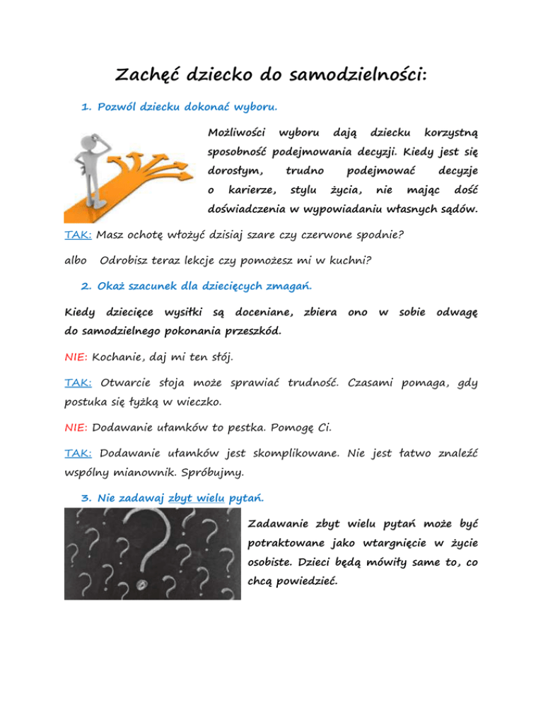 Zachęć dziecko do samodzielności: 1. Pozwól dziecku dokonać wyboru. Możliwości wyboru dają dziecku korzystną sposobność podejmowania decyzji. Kiedy jest się dorosłym, o karierze, trudno stylu podejmować życia, nie decyzje mając dość doświadczenia w wypowiadaniu własnych sądów. TAK: Masz ochotę włożyć dzisiaj szare czy czerwone spodnie? albo Odrobisz teraz lekcje czy pomożesz mi w kuchni? 2. Okaż szacunek dla dziecięcych zmagań. Kiedy dziecięce wysiłki są doceniane, zbiera ono w sobie odwagę do samodzielnego pokonania przeszkód. NIE: Kochanie, daj mi ten słój. TAK: Otwarcie słoja może sprawiać trudność. Czasami pomaga, gdy postuka się łyżką w wieczko. NIE: Dodawanie ułamków to pestka. Pomogę Ci. TAK: Dodawanie ułamków jest skomplikowane. Nie jest łatwo znaleźć wspólny mianownik. Spróbujmy. 3. Nie zadawaj zbyt wielu pytań. Zadawanie zbyt wielu pytań może być potraktowane jako wtargnięcie w życie osobiste. Dzieci będą mówiły same to, co chcą powiedzieć. NIE: Czy zdałaś test z matmy? Czy ktoś przyjdzie dzisiaj do Ciebie po szkole? Nie? Dlaczego? TAK: Cześć, cieszę się, że już jesteś. 4. Nie spiesz się z dawaniem odpowiedzi. Kiedy dzieci zadają pytania, należy dać im szansę, aby najpierw same znalazły odpowiedź. Tato, skąd bierze się deszcz? NIE: Deszcz jest spowodowany parowaniem, nagromadzeniem wilgoci. TAK: To interesujące pytanie. A jak myślisz? 5. Zachęć dziecko do korzystania z cudzych doświadczeń. Chcemy, aby dzieci wiedziały, że nie są zupełnie od nas zależne. Świat poza domem – szkoła, sklep, dom kolegi/ koleżanki – mogą pomóc przy rozwiązywaniu problemów. TAK: Chcesz nauczyć się grać na gitarze? Stasiu może pokazać Ci kilka akordów. 6. Nie odbieraj nadziei. Zamiast przygotowywać dzieci na możliwość porażki, pozwól im na własne poszukiwania i doświadczenia. Mamo, chcę zagrać główną rolę w szkolnym teatrze. Czy myślisz, że ją otrzymam? NIE: Dlaczego zaraz główną rolę, skoro nie masz żadnego doświadczenia? Może jest jakaś mniejsza rola? Tak: Zamierzasz wystąpić w głównej roli? To dopiero będzie przygoda… Tato, może zostanę weterynarzem, kiedy dorosnę? NIE: Z Twoim stopniami z przyrody? Daj spokój! Tak: Zawsze kochałeś zwierzęta. Opowiedz mi o swoich planach. Próbując zabezpieczyć dzieci przed porażką, pozbawiamy je nadziei, dążeń, marzeń, a czasami – możliwości zrealizowania planów. Ćwiczenia Rodzice zwykle mówią: 1. Weź teraz kąpiel. Zaproponujmy wybór. 2. Dlaczego tak się męczysz z wkładaniem tych butów? Dalej, podnieś nogę do góry! Założę Ci. Okażmy szacunek dla dziecięcych zmagań. 3. Jak było w szkole? Co dostałaś? Zjadłaś II śniadanie? Z kim rozmawiałaś? Co było na lekcji? Nie zadawajmy zbyt wielu pytań. 4. Dziecko: Dlaczego tatuś musi pracować? Rodzic: Tatuś musi iść codziennie do pracy, żebyśmy mogli mieć ten ładny dom, dobre jedzenie, ładne rzeczy i … Nie spieszmy się z dawaniem odpowiedzi. 5. Nastolatek: Jestem zbyt gruby. Chcę, żebyś ułożyła mi dietę. Co powinienem jeść? Rodzic: Stale Ci powtarzam, abyś nie jadł tylu cukierków i nie zaglądał do lodówki. Zachęćmy dziecko do korzystania z cudzych doświadczeń (specjalisty). 6. Dziecko: Tato, kiedy dorosnę, zostanę kucharzem. Rodzic: Zmień plany. Trzeba skończyć porządne studia, a gotować to sobie możesz w domu. Nie odbierajmy nadziei. Tekst powstał na podstawie książki A. Faber i E. Mazlish Jak mówić, żeby dzieci nas słuchały? Jak słuchać, żeby dzieci do nas mówiły? Grafika: http://blog.fones.pl/post/2012-07-04/pomysl-na-startup-wybor/ http://zrobmytorazem.blog.pl/2011/11/13/stymulowanie-rozwoju-myslenia-dziecka/ http://angelsms.pl/sloneczko http://zw.pl/news/kto-dostarcza-informacji-pani-burmistrz,123852 Elżbieta Adamkiewicz pedagog A już wkrótce… Siedem sposobów zachęcania dzieci do współpracy