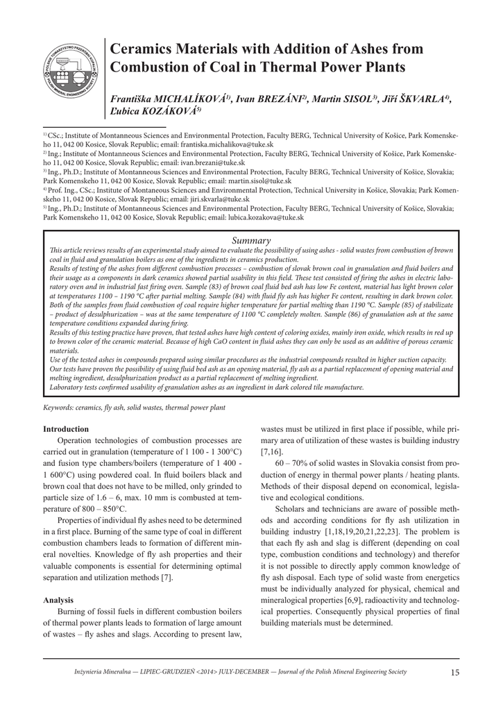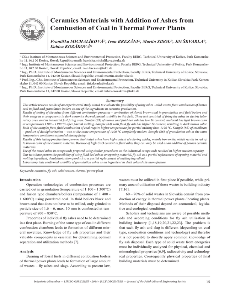 Ceramics Materials with Addition of Ashes from Combustion of Coal in Thermal Power Plants Františka MICHALÍKOVÁ1), Ivan BREZÁNI2), Martin SISOL3), Jiří ŠKVARLA4), Ľubica KOZÁKOVÁ5) CSc.; Institute of Montanneous Sciences and Environmental Protection, Faculty BERG, Technical University of Košice, Park Komenskeho 11, 042 00 Kosice, Slovak Republic; email: [email protected] 2) Ing.; Institute of Montanneous Sciences and Environmental Protection, Faculty BERG, Technical University of Košice, Park Komenskeho 11, 042 00 Kosice, Slovak Republic; email: [email protected] 3) Ing., Ph.D.; Institute of Montanneous Sciences and Environmental Protection, Faculty BERG, Technical University of Košice, Slovakia; Park Komenskeho 11, 042 00 Kosice, Slovak Republic; email: [email protected] 4) Prof. Ing., CSc.; Institute of Montaneous Sciences and Environmental Protection, Technical University in Košice, Slovakia; Park Komenskeho 11, 042 00 Kosice, Slovak Republic; email: [email protected] 5) Ing., Ph.D.; Institute of Montanneous Sciences and Environmental Protection, Faculty BERG, Technical University of Košice, Slovakia; Park Komenskeho 11, 042 00 Kosice, Slovak Republic; email: [email protected] 1) Summary This article reviews results of an experimental study aimed to evaluate the possibility of using ashes - solid wastes from combustion of brown coal in fluid and granulation boilers as one of the ingredients in ceramics production. Results of testing of the ashes from different combustion processes – combustion of slovak brown coal in granulation and fluid boilers and their usage as a components in dark ceramics showed partial usability in this field. These test consisted of firing the ashes in electric laboratory oven and in industrial fast firing oven. Sample (83) of brown coal fluid bed ash has low Fe content, material has light brown color at temperatures 1100 – 1190 °C after partial melting. Sample (84) with fluid fly ash has higher Fe content, resulting in dark brown color. Both of the samples from fluid combustion of coal require higher temperature for partial melting than 1190 °C. Sample (85) of stabilizate – product of desulphurization – was at the same temperature of 1100 °C completely molten. Sample (86) of granulation ash at the same temperature conditions expanded during firing. Results of this testing practice have proven, that tested ashes have high content of coloring oxides, mainly iron oxide, which results in red up to brown color of the ceramic material. Because of high CaO content in fluid ashes they can only be used as an additive of porous ceramic materials. Use of the tested ashes in compounds prepared using similar procedures as the industrial compounds resulted in higher suction capacity. Our tests have proven the possibility of using fluid bed ash as an opening material, fly ash as a partial replacement of opening material and melting ingredient, desulphurization product as a partial replacement of melting ingredient. Laboratory tests confirmed usability of granulation ashes as an ingredient in dark colored tile manufacture. Keywords: ceramics, fly ash, solid wastes, thermal power plant Introduction Operation technologies of combustion processes are carried out in granulation (temperature of 1 100 - 1 300°C) and fusion type chambers/boilers (temperature of 1 400 1 600°C) using powdered coal. In fluid boilers black and brown coal that does not have to be milled, only grinded to particle size of 1.6 – 6, max. 10 mm is combusted at temperature of 800 – 850°C. Properties of individual fly ashes need to be determined in a first place. Burning of the same type of coal in different combustion chambers leads to formation of different mineral novelties. Knowledge of fly ash properties and their valuable components is essential for determining optimal separation and utilization methods [7]. Analysis Burning of fossil fuels in different combustion boilers of thermal power plants leads to formation of large amount of wastes – fly ashes and slags. According to present law, wastes must be utilized in first place if possible, while primary area of utilization of these wastes is building industry [7,16]. 60 – 70% of solid wastes in Slovakia consist from production of energy in thermal power plants / heating plants. Methods of their disposal depend on economical, legislative and ecological conditions. Scholars and technicians are aware of possible methods and according conditions for fly ash utilization in building industry [1,18,19,20,21,22,23]. The problem is that each fly ash and slag is different (depending on coal type, combustion conditions and technology) and therefor it is not possible to directly apply common knowledge of fly ash disposal. Each type of solid waste from energetics must be individually analyzed for physical, chemical and mineralogical properties [6,9], radioactivity and technological properties. Consequently physical properties of final building materials must be determined. Inżynieria Mineralna — LIPIEC-GRUDZIEŃ <2014> JULY-DECEMBER — Journal of the Polish Mineral Engineering Society 15 Comment Fly ashes can be used in these main areas of building industries: production of cement and porous concrete, light weight aggregates, wall components made of concrete with hydraulic binder, fine filler (replacement of fine aggregates), as a partial replacement of cement in concrete production, stabilization of bases in road building industries. Other utilization methods include mixed production of aluminum and cement (Grzymek’s technology from 1934 was industrially realized in Poland, during and after World War II in Štamberk, Czech Republic), production of mortars, ceramics, terrazzo tiles, concrete roof tiles, bulk thermal insulation, production of insulation materials, mineral wool, polystyrene concrete, filler in epoxy, polyurethane and amine materials, polyester resins. Slag is often used as opening in production of building mate