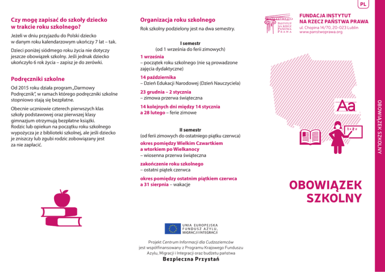 PL Czy mogę zapisać do szkoły dziecko w trakcie roku szkolnego? Jeżeli w dniu przyjazdu do Polski dziecko w danym roku kalendarzowym ukończy 7 lat – tak. Organizacja roku szkolnego FUNDACJA INSTYTUT NA RZECZ PAŃSTWA PRAWA Rok szkolny podzielony jest na dwa semestry. ul. Chopina 14/70, 20-023 Lublin www.panstwoprawa.org Dzieci poniżej siódmego roku życia nie dotyczy jeszcze obowiązek szkolny. Jeśli jednak dziecko ukończyło 6 rok życia – zapisz je do zerówki. I semestr (od 1 września do ferii zimowych) 1 września – początek roku szkolnego (nie są prowadzone zajęcia dydaktyczne) Podręczniki szkolne 14 października – Dzień Edukacji Narodowej (Dzień Nauczyciela) Obecnie uczniowie czterech pierwszych klas szkoły podstawowej oraz pierwszej klasy gimnazjum otrzymują bezpłatne książki. Rodzic lub opiekun na początku roku szkolnego wypożycza je z biblioteki szkolnej, ale jeśli dziecko je zniszczy lub zgubi rodzic zobowiązany jest za nie zapłacić. 23 grudnia – 2 stycznia – zimowa przerwa świąteczna OBOWIĄZEK SZKOLNY Od 2015 roku działa program „Darmowy Podręcznik”, w ramach którego podręczniki szkolne stopniowo stają się bezpłatne. 14 kolejnych dni między 14 stycznia a 28 lutego – ferie zimowe II semestr (od ferii zimowych do ostatniego piątku czerwca) okres pomiędzy Wielkim Czwartkiem a wtorkiem po Wielkanocy – wiosenna przerwa świąteczna zakończenie roku szkolnego – ostatni piątek czerwca okres pomiędzy ostatnim piątkiem czerwca a 31 sierpnia – wakacje Projekt Centrum Informacji dla Cudzoziemców jest współfinansowany z Programu Krajowego Funduszu Azylu, Migracji i Integracji oraz budżetu państwa Bezpieczna Przystań OBOWIĄZEK SZKOLNY „Każdy ma prawo do nauki. Nauka do 18 roku życia jest obowiązkowa.” Art. 70 Konstytucji RP Zgodnie z prawem, obowiązek ten powstaje w roku w którym dziecko kończy 7 lat. Obowiązek wygasa, gdy dziecko zakończy naukę w gimnazjum lub gdy przed ukończeniem gimnazjum ukończy 18 rok życia. Obowiązkowa nauka Czy trzeba zapisać dziecko do szkoły? Co stanie się, jeśli dziecko nie będzie chodzić do szkoły? Co do zasady, tak. Jeśli dziecko nie uczęszcza do szkoły i nie ma zapewnionego dostępu do nauki domowej należy liczyć się z konsekwencjami - rodzic lub opiekun osoby poniżej 18 roku życia może otrzymać grzywnę nawet do 50.000 zł, dopóki obowiązek nie zostanie spełniony. W Polsce każde dziecko ma prawo i obowiązek uczęszczania do szkoły. Zdarza się, że rodzice biorą ten obowiązek na siebie i chcą by dziecko, zamiast chodzić do szkoły pobierało naukę w domu. Jest to możliwe, jednak aby rodzic lub opiekun mógł samodzielnie uczyć dziecko musi spełnić kilka warunków. Jakie dokumenty trzeba złożyć by dziecko mogło się uczyć w domu? Zerówka (6 lat) Szkoła podstawowa (7 – 13 lat) Gimnazjum (13 – 16 lat lub do ukończenia 18 roku życia) Nauka w szkołach ponadgimnazjalnych jest dobrowolna. Dziecko 6-letnie ma prawo do rozpoczęcia nauki w pierwszej klasie szkoły podstawowej, o ile uczęszczało do przedszkola w roku szkolnym poprzedzającym rok szkolny, w którym ma rozpocząć naukę w szkole. Jeśli dziecko 6-letnie nie uczęszczało do przedszkola, rodzice również mogą zapisać je do pierwszej klasy. Jednak w takim wypadku niezbędna jest opinia z poradni psychologiczno-pedagogicznej o możliwości rozpoczęcia nauki w szkole podstawowej. wniosek rodziców lub opiekunów do dyrektora przedszkola, szkoły podstawowej, gimnazjum, szkoły ponadgimnazjalnej załączniki do wniosku: - opinia z poradni pedagogiczno-psychologicznej - oświadczenie rodziców, że zapewnią dziecku w domu warunki do nauki - zobowiązanie rodziców o przystąpieniu przez dziecko do rocznych egzaminów klasyfikujących decyzja dyrektora szkoły Po uzyskaniu pozytywnej oceny dziecko może rozpocząć naukę w domu. Przed końcem każdego roku szkolnego uczeń korzystający z prawa do nauki w domu musi zdać egzaminy przed specjalną komisją. W ostateczności, niespełnienie obowiązku może wiązać się to nawet z odebraniem praw rodzicielskich. Do której szkoły zapisać dziecko? W przypadku publicznych szkół podstawowych oraz gimnazjów obowiązuje tzw. rejonizacja – dzieci zapisywane są do szkoły właściwej ze względu na zamieszkanie (jest to główne kryterium, ale nie jedyne). Dzieci z danego rejonu mają zagwarantowane miejsce w szkole. Pozostałe dzieci spoza rejonu, które chcą chodzić do danej szkoły przyjmowane są według wskazanych przez szkołę kryteriów, do wyczerpania limitu miejsc.