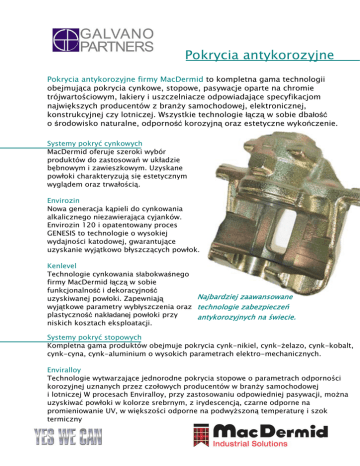 Pokrycia antykorozyjne Pokrycia antykorozyjne firmy MacDermid to kompletna gama technologii obejmująca pokrycia cynkowe, stopowe, pasywacje oparte na chromie trójwartościowym, lakiery i uszczelniacze odpowiadające specyfikacjom największych producentów z branży samochodowej, elektronicznej, konstrukcyjnej czy lotniczej. Wszystkie technologie łączą w sobie dbałość o środowisko naturalne, odporność korozyjną oraz estetyczne wykończenie. Systemy pokryć cynkowych MacDermid oferuje szeroki wybór produktów do zastosowań w układzie bębnowym i zawieszkowym. Uzyskane powłoki charakteryzują się estetycznym wyglądem oraz trwałością. Envirozin Nowa generacja kąpieli do cynkowania alkalicznego niezawierająca cyjanków. Envirozin 120 i opatentowany proces GENESIS to technologie o wysokiej wydajności katodowej, gwarantujące uzyskanie wyjątkowo błyszczących powłok. Kenlevel Technologie cynkowania słabokwaśnego firmy MacDermid łączą w sobie funkcjonalność i dekoracyjność Najbardziej zaawansowane uzyskiwanej powłoki. Zapewniają wyjątkowe parametry wybłyszczenia oraz technologie zabezpieczeń plastyczność nakładanej powłoki przy antykorozyjnych na świecie. niskich kosztach eksploatacji. Systemy pokryć stopowych Kompletna gama produktów obejmuje pokrycia cynk-nikiel, cynk-żelazo, cynk-kobalt, cynk-cyna, cynk-aluminium o wysokich parametrach elektro-mechanicznych. Enviralloy Technologie wytwarzające jednorodne pokrycia stopowe o parametrach odporności korozyjnej uznanych przez czołowych producentów w branży samochodowej i lotniczej W procesach Enviralloy, przy zastosowaniu odpowiedniej pasywacji, można uzyskiwać powłoki w kolorze srebrnym, z irydescencją, czarne odporne na promieniowanie UV, w większości odporne na podwyższoną temperaturę i szok termiczny Pokrycia antykorozyjne Systemy pasywacji opartych na chromie trójwartościowym Technologie TriPass to kompletna gama pasywacji spełniająca wymagania ELV i wielu specyfikacji producentów z branży samochodowej. Duży wybór produktów (pasywacje niebieskie, czarne, grubopowłokowe, również w kolorze żółtym) oraz wyjątkowa odporność na szok termiczny sprawiają, że systemy TriPass sprawdzają się tam, gdzie konwencjonalne zabezpieczenia zawodzą. Lakiery, uszczelniacze, oleje, woski i smary Produkty do wielu zastosowań pełniące funkcję zarówno ochronną jak i zapewniające odpowiedni współczynnik tarcia. Znajdują szerokie zastosowanie w przemyśle samochodowym. Lakiery i uszczelniacze Technologie Hydroclear, HydroKlad czy TNT poprawiają wygląd powierzchni metalowych i w połączeniu z pasywacjami są skutecznymi metodami ich zabezpieczania przed korozją. Uszczelniacze Torque’n’Tension dodatkowo poprawiają i kontrolują parametry poślizgowe obrabianych elementów. Oleje, woski i smary Obok wspomnianego wcześniej uszczelniacza TNT, firma MacDermid oferuje również szeroką paletę olejów, wosków i smarów, które łączą w sobie funkcje ochronne i poślizgowe. MacuGuard i Transiflo Systemy cynkowania mechanicznego stanowią doskonałe rozwiązanie, gdy istnieje ryzyko wystąpienia kruchości wodorowej. Stal każdej twardości może być pocynkowana szybko i skutecznie, uzyskując doskonałe właściwości odporności korozyjnej. Systemy te od ponad dwudziestu lat sprawdzają się w przemyśle samochodowym. GALVANO-PARTNERS S.C. UL. DĄBROWSKIEGO 238 93-231 ŁÓDŹ TEL. 042 250 82 30, FAX 042 250 82 31 [email protected]