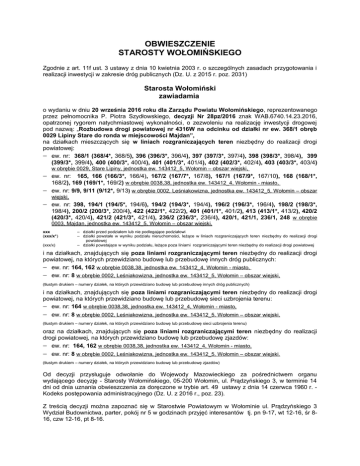OBWIESZCZENIE STAROSTY WOŁOMIŃSKIEGO Zgodnie z art. 11f ust. 3 ustawy z dnia 10 kwietnia 2003 r. o szczególnych zasadach przygotowania i realizacji inwestycji w zakresie dróg publicznych (Dz. U. z 2015 r. poz. 2031) Starosta Wołomiński zawiadamia o wydaniu w dniu 20 września 2016 roku dla Zarządu Powiatu Wołomińskiego, reprezentowanego przez pełnomocnika P. Piotra Szydłowskiego, decyzji Nr 28pz/2016 znak WAB.6740.14.23.2016, opatrzonej rygorem natychmiastowej wykonalności, o zezwoleniu na realizację inwestycji drogowej pod nazwą: „Rozbudowa drogi powiatowej nr 4316W na odcinku od działki nr ew. 368/1 obręb 0029 Lipiny Stare do ronda w miejscowości Majdan”, na działkach mieszczących się w liniach rozgraniczających teren niezbędny do realizacji drogi powiatowej: ew. nr: 368/1 (368/4*, 368/5), 396 (396/3*, 396/4), 397 (397/3*, 397/4), 398 (398/3*, 398/4), 399 (399/3*, 399/4), 400 (400/3*, 400/4), 401 (401/3*, 401/4), 402 (402/3*, 402/4), 403 (403/3*, 403/4) w obrębie 0029, Stare Lipiny, jednostka ew. 143412_5, Wołomin – obszar wiejski, ew. nr: 165, 166 (166/3*, 166/4), 167/2 (167/7*, 167/8), 167/1 (167/9*, 167/10), 168 (168/1*, 168/2), 169 (169/1*, 169/2) w obrębie 0038,38, jednostka ew. 143412_4, Wołomin - miasto, ew. nr: 9/9, 9/11 (9/12*, 9/13) w obrębie 0002, Leśniakowizna, jednostka ew. 143412_5, Wołomin – obszar wiejski, ew. nr: 398, 194/1 (194/5*, 194/6), 194/2 (194/3*, 194/4), 196/2 (196/3*, 196/4), 198/2 (198/3*, 198/4), 200/2 (200/3*, 200/4), 422 (422/1*, 422/2), 401 (401/1*, 401/2), 413 (413/1*, 413/2), 420/2 (420/3*, 420/4), 421/2 (421/3*, 421/4), 236/2 (236/3*, 236/4), 420/1, 421/1, 236/1, 248 w obrębie 0003, Majdan, jednostka ew. 143412_5, Wołomin – obszar wiejski, xxx (xxx/x*) (xxx/x) – działki przed podziałem lub nie podlegające podziałowi – działki powstałe w wyniku podziału nieruchomości, leżące w liniach rozgraniczających teren niezbędny do realizacji drogi powiatowej – działki powstające w wyniku podziału, leżące poza liniami rozgraniczającymi teren niezbędny do realizacji drogi powiatowej i na działkach, znajdujących się poza liniami rozgraniczającymi teren niezbędny do realizacji drogi powiatowej, na których przewidziano budowę lub przebudowę innych dróg publicznych: ew. nr: 164, 162 w obrębie 0038,38, jednostka ew. 143412_4, Wołomin - miasto, ew. nr: 8 w obrębie 0002, Leśniakowizna, jednostka ew. 143412_5, Wołomin – obszar wiejski, (tłustym drukiem – numery działek, na których przewidziano budowę lub przebudowę innych dróg publicznych) i na działkach, znajdujących się poza liniami rozgraniczającymi teren niezbędny do realizacji drogi powiatowej, na których przewidziano budowę lub przebudowę sieci uzbrojenia terenu: ew. nr: 164 w obrębie 0038,38, jednostka ew. 143412_4, Wołomin - miasto, ew. nr: 8 w obrębie 0002, Leśniakowizna, jednostka ew. 143412_5, Wołomin – obszar wiejski, (tłustym drukiem – numery działek, na których przewidziano budowę lub przebudowę sieci uzbrojenia terenu) oraz na działkach, znajdujących się poza liniami rozgraniczającymi teren niezbędny do realizacji drogi powiatowej, na których przewidziano budowę lub przebudowę zjazdów: ew. nr: 164, 162 w obrębie 0038,38, jednostka ew. 143412_4, Wołomin - miasto, ew. nr: 8 w obrębie 0002, Leśniakowizna, jednostka ew. 143412_5, Wołomin – obszar wiejski. (tłustym drukiem – numery działek, na których przewidziano budowę lub przebudowę zjazdów) Od decyzji przysługuje odwołanie do Wojewody Mazowieckiego za pośrednictwem organu wydającego decyzję - Starosty Wołomińskiego, 05-200 Wołomin, ul. Prądzyńskiego 3, w terminie 14 dni od dnia uznania obwieszczenia za doręczone w trybie art. 49 ustawy z dnia 14 czerwca 1960 r. Kodeks postępowania administracyjnego (Dz. U. z 2016 r., poz. 23). Z treścią decyzji można zapoznać się w Starostwie Powiatowym w Wołominie ul. Prądzyńskiego 3 Wydział Budownictwa, parter, pokój nr 5 w godzinach przyjęć interesantów tj. pn 9-17, wt 12-16, śr 816, czw 12-16, pt 8-16.