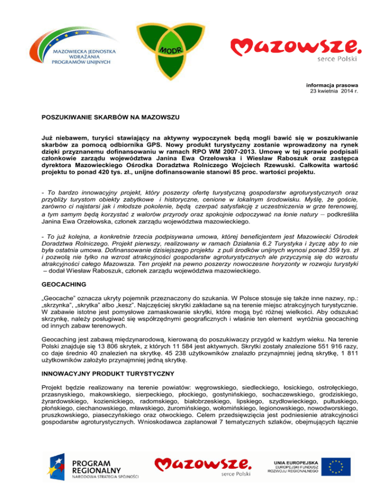 informacja prasowa 23 kwietnia 2014 r. POSZUKIWANIE SKARBÓW NA MAZOWSZU Już niebawem, turyści stawiający na aktywny wypoczynek będą mogli bawić się w poszukiwanie skarbów za pomocą odbiornika GPS. Nowy produkt turystyczny zostanie wprowadzony na rynek dzięki przyznanemu dofinansowaniu w ramach RPO WM 2007-2013. Umowę w tej sprawie podpisali członkowie zarządu województwa Janina Ewa Orzełowska i Wiesław Raboszuk oraz zastępca dyrektora Mazowieckiego Ośrodka Doradztwa Rolniczego Wojciech Rzewuski. Całkowita wartość projektu to ponad 420 tys. zł., unijne dofinansowanie stanowi 85 proc. wartości projektu. - To bardzo innowacyjny projekt, który poszerzy ofertę turystyczną gospodarstw agroturystycznych oraz przybliży turystom obiekty zabytkowe i historyczne, cenione w lokalnym środowisku. Myślę, że goście, zarówno ci najstarsi jak i młodsze pokolenie, będą czerpać satysfakcję z uczestniczenia w grze terenowej, a tym samym będą korzystać z walorów przyrody oraz spokojnie odpoczywać na łonie natury – podkreśliła Janina Ewa Orzełowska, członek zarządu województwa mazowieckiego. - To już kolejna, a konkretnie trzecia podpisywana umowa, której beneficjentem jest Mazowiecki Ośrodek Doradztwa Rolniczego. Projekt pierwszy, realizowany w ramach Działania 6.2 Turystyka i życzę aby to nie była ostatnia umowa. Dofinansowanie dzisiejszego projektu z puli środków unijnych wynosi ponad 359 tys. zł i pozwolą nie tylko na wzrost atrakcyjności gospodarstw agroturystycznych ale przyczynią się do wzrostu atrakcyjności całego Mazowsza. Ten projekt na pewno poszerzy nowoczesne horyzonty w rozwoju turystyki – dodał Wiesław Raboszuk, członek zarządu województwa mazowieckiego. GEOCACHING „Geocache” oznacza ukryty pojemnik przeznaczony do szukania. W Polsce stosuje się także inne nazwy, np.: „skrzynka”, „skrytka” albo „kesz”. Najczęściej skrytki zakładane są na terenie miejsc atrakcyjnych turystycznie. W zabawie istotne jest pomysłowe zamaskowanie skrytki, które mogą być różnej wielkości. Aby odszukać skrzynkę, należy posługiwać się współrzędnymi geograficznych i właśnie ten element wyróżnia geocaching od innych zabaw terenowych. Geocaching jest zabawą międzynarodową, kierowaną do poszukiwaczy przygód w każdym wieku. Na terenie Polski znajduje się 13 806 skrytek, z których 11 584 jest aktywnych. Skrytki zostały znalezione 551 916 razy, co daje średnio 40 znalezień na skrytkę. 45 238 użytkowników znalazło przynajmniej jedną skrytkę, 1 811 użytkowników założyło przynajmniej jedną skrytkę. INNOWACYJNY PRODUKT TURYSTYCZNY Projekt będzie realizowany na terenie powiatów: węgrowskiego, siedleckiego, łosickiego, ostrołęckiego, przasnyskiego, makowskiego, sierpeckiego, płockiego, gostynińskiego, sochaczewskiego, grodziskiego, żyrardowskiego, kozienickiego, radomskiego, białobrzeskiego, lipskiego, szydłowieckiego, pułtuskiego, płońskiego, ciechanowskiego, mławskiego, żuromińskiego, wołomińskiego, legionowskiego, nowodworskiego, pruszkowskiego, piaseczyńskiego oraz otwockiego. Celem przedsięwzięcia jest podniesienie atrakcyjności gospodarstw agroturystycznych. Wnioskodawca zaplanował 7 tematycznych szlaków, obejmujących łącznie 50 geocachy. Szlaki pojawią się głównie w gospodarstwach agroturystycznych oraz na obszarach NATURA 2000, tj. parki krajobrazowe, pomniki przyrody oraz obiekty historyczne, cenione w lokalnym środowisku. W ramach przyznanej dotacji wydany zostanie katalog pt. „Turystyka wiejska na Mazowszu”. Wszyscy zainteresowani znajdą w nim opisy 250 obiektów turystyki wiejskiej, współpracujących z MODR, w tym obiekty wytypowane w geocachingu wraz z opisem wszystkich szlaków. Nie zabraknie również zdjęć i prezentacji wszystkich atrakcji oferowanych przez gospodarzy. Kolejną publikacją będzie broszura informacyjna pt. „Geocaching innowacyjną formą produktu turystyki wiejskiej na Mazowszu”, a także kupionych zostanie 50 urządzeń GPS, które będą wypożyczane właścicielom gospodarstw agroturystycznych na potrzeby turystów. Projekt wykorzysta potencjał regionu, szczególnie w tzw. „małych ojczyznach”, „zapomnianych” prowincjach, obszarach i miejscowościach o silnej tożsamości społecznej. Turyści zaś będą mieli okazję poznać produkty lokalne, np.: kuchnię regionalną czy wyroby rzemieślnicze. Geocaching poprawi ofertę turystyki wiejskiej i będzie okazją do poznania nieznanych miejsc. Tytuł projektu: Geocaching jako determinanta wzrostu atrakcyjności agroturystycznej na Mazowszu Całkowita wartość projektu: 423 366,00 zł Kwota dofinansowania: 359 861,10 zł Beneficjent: Mazowiecki Ośrodek Doradztwa Rolniczego z siedzibą w Warszawie Działanie: 6.2 Turystyka Edyta Al-Tawil Mazowiecka Jednostka Wdrażania Programów Unijnych Tel. 22 542 25 62 e-mail: [email protected] Marta Milewska Rzeczniczka Prasowa Urząd Marszałkowski Województwa Mazowieckiego w Warszawie tel. 22 59 79 602, kom. 510 591 974 e-mail: [email protected]