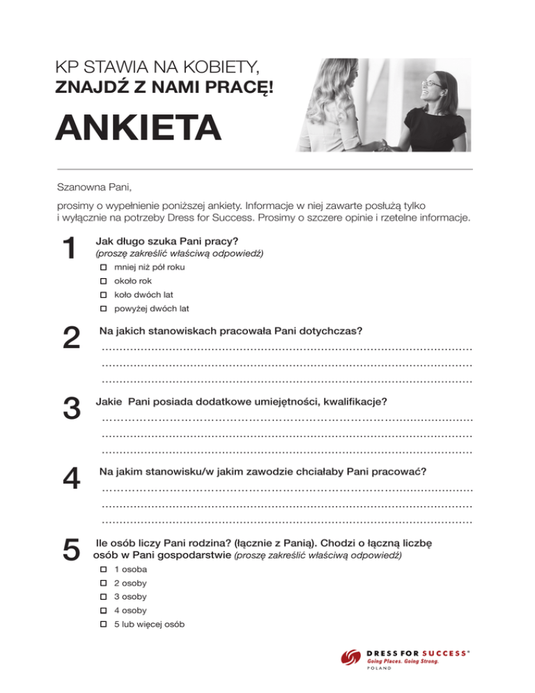 KP STAWIA NA KOBIETY, ZNAJDŹ Z NAMI PRACĘ! ANKIETA Szanowna Pani, prosimy o wypełnienie poniższej ankiety. Informacje w niej zawarte posłużą tylko i wyłącznie na potrzeby Dress for Success. Prosimy o szczere opinie i rzetelne informacje. 1 Jak długo szuka Pani pracy? (proszę zakreślić właściwą odpowiedź) mniej niż pół roku około rok koło dwóch lat powyżej dwóch lat 2 Na jakich stanowiskach pracowała Pani dotychczas? ......................................................................................................... ......................................................................................................... ......................................................................................................... 3 Jakie Pani posiada dodatkowe umiejętności, kwalifikacje? ……………………………………………………………………...................... ......................................................................................................... 4 ......................................................................................................... Na jakim stanowisku/w jakim zawodzie chciałaby Pani pracować? ……………………………………………………………………...................... ......................................................................................................... 5 ......................................................................................................... Ile osób liczy Pani rodzina? (łącznie z Panią). Chodzi o łączną liczbę osób w Pani gospodarstwie (proszę zakreślić właściwą odpowiedź) 1 osoba 2 osoby 3 osoby 4 osoby 5 lub więcej osób 6 Jakie bariery napotkała Pani podczas poszukiwania pracy? ......................................................................................................... ......................................................................................................... 8 ......................................................................................................... Czy rozważa Pani możliwość rozpoczęcia działalności gospodarczej/ prowadzenie własnej firmy? (proszę zakreślić właściwą odpowiedź) tak nie 9 trudno powiedzieć Które określenia charakteryzują Pani obecną sytuację życiową? (proszę zakreślić właściwe odpowiedzi) matka samotnie wychowująca dziecko matka wracająca do pracy po urlopie wychowawczym/macierzyńskim osoba bez doświadczenia zawodowego osoba do 25 roku życia osoba długotrwale bezrobotna osoba opuszczająca zakład karny osoba z rodziny patologicznej kobieta powyżej 45 roku życia osoba niepełnosprawna mieszkanka gminy wiejskiej 10 żadne z powyższych Dlaczego chce Pani wziąć udział w szkoleniu Dress for Success? ......................................................................................................... ......................................................................................................... 11 ......................................................................................................... Jakie są Pani oczekiwania związane ze szkoleniem? ......................................................................................................... ......................................................................................................... 12 ......................................................................................................... Czy chciałaby Pani mieć MENTORA, osobę, która tylko z panią spotykałaby się po naszych warsztatach i dzieliła się swoją wiedzą i umiejętnościami ......................................................................................................... ......................................................................................................... ......................................................................................................... 13 Czy jest Pani gotowa podjąć pracę od zaraz? 14 tak nie Co Pani zdaniem w decydujący sposób zwiększyłoby Pani szanse na podjęcie pracy? ......................................................................................................... ......................................................................................................... ......................................................................................................... DANE PERSONALNE: Wiek Wykształcenie Stan cywilny 18-24 bez wykształcenia, niepełne podstawowe panna 25-34 podstawowe rozwiedziona 45- 54 zawodowe zamężna 55- 64 średnie techniczne wdowa 65 i więcej średnie ogólne policealne, niepełne wyższe wyższe Imię i nazwisko: Adres: Telefon: E-mail: Wyrażam zgodę na przetwarzanie moich danych osobowych przez STOWARZYSZENIE DRESS FOR SUCCESS POLAND STRÓJ DLA SUKCESU (dalej „Stowarzyszenie”) z siedzibą w Katowicach ul. 3-go maja 36, kod 40-097, (KRS 0000338193) w celach rekrutacji do udziału w warsztatach organizowanych przez Stowarzyszenie. Każdy ma prawo dostępu do treści swoich danych oraz ich poprawiania. Podanie powyższych danych jest dobrowolne jednakże koniecznie aby wziąć udział w procesie rekrutacji. ................................................................ DATA, PODPIS