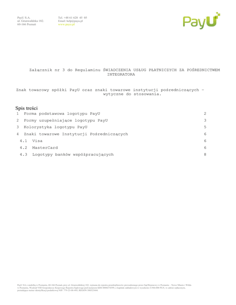 PayU S.A. ul. Grunwaldzka 182. 60-166 Poznań Tel. +48 61 628 45 05 Email: [email protected] www.payu.pl Załącznik nr 3 do Regulaminu ŚWIADCZENIA USŁUG PŁATNICZYCH ZA POŚREDNICTWEM INTEGRATORA Znak towarowy spółki PayU oraz znaki towarowe instytucji pośredniczących – wytyczne do stosowania. Spis treści 1 Forma podstawowa logotypu PayU 2 2 Formy uzupełniające logotypu PayU 3 3 Kolorystyka logotypu PayU 5 4 Znaki towarowe Instytucji Pośredniczących 6 4.1 Visa 6 4.2 MasterCard 6 4.3 Logotypy banków współpracujących 8 PayU SA z siedzibą w Poznaniu, 60-166 Poznań, przy ul. Grunwaldzkiej 182, wpisana do rejestru przedsiębiorców prowadzonego przez Sąd Rejonowy w Poznaniu – Nowe Miasto i Wilda w Poznaniu, Wydział VIII Gospodarczy Krajowego Rejestru Sądowego pod numerem KRS 0000274399, o kapitale zakładowym w wysokości 4.944.000 PLN, w całości opłaconym, posiadająca numer identyfikacji podatkowej NIP: 779-23-08-495, REGON 300523444. PayU S.A. ul. Grunwaldzka 182. 60-166 Poznań Tel. +48 61 628 45 05 Email: [email protected] www.payu.pl 1 Forma podstawowa logotypu PayU Forma podstawowa logotypu zbudowana jest z indywidualnie zaprojektowanego liternictwa, stanowiącego zapis graficzny nazwy marki. Rysunek 1 Podstawowy logotyp PayU (Gradient) PayU SA z siedzibą w Poznaniu, 60-166 Poznań, przy ul. Grunwaldzkiej 182, wpisana do rejestru przedsiębiorców prowadzonego przez Sąd Rejonowy w Poznaniu – Nowe Miasto i Wilda w Poznaniu, Wydział VIII Gospodarczy Krajowego Rejestru Sądowego pod numerem KRS 0000274399, o kapitale zakładowym w wysokości 4.944.000 PLN, w całości opłaconym, posiadająca numer identyfikacji podatkowej NIP: 779-23-08-495, REGON 300523444. PayU S.A. ul. Grunwaldzka 182. 60-166 Poznań Tel. +48 61 628 45 05 Email: [email protected] www.payu.pl 2 Formy uzupełniające logotypu PayU Warianty achromatyczne i monochromatyczne logotypu mają zastosowanie w tych obszarach komunikacji marki, gdzie wykorzystanie podstawowej kolorystyki jest niemożliwe ze względów technologicznych (na przykład tłoczenie, grawerunek, druk jednokolorowy, itp.). Na potrzeby systemu identyfikacji wizualnej marki została zaprojektowana specjalna forma logotypu – plakietka. Ma ona zastosowanie w przypadku konieczności aplikowania logotypu na tłach niejednorodnych (trudnych kolorystycznie), a zależy nam na zachowaniu podstawowych kolorów marki. Dopuszcza się stosowanie efektu przezroczystości w formie pozytywowej. Rysunek 2 Logotyp monochromatyczny PayU Rysunek 3 Logotyp monochromatyczny PayU (PayU Lime) PayU SA z siedzibą w Poznaniu, 60-166 Poznań, przy ul. Grunwaldzkiej 182, wpisana do rejestru przedsiębiorców prowadzonego przez Sąd Rejonowy w Poznaniu – Nowe Miasto i Wilda w Poznaniu, Wydział VIII Gospodarczy Krajowego Rejestru Sądowego pod numerem KRS 0000274399, o kapitale zakładowym w wysokości 4.944.000 PLN, w całości opłaconym, posiadająca numer identyfikacji podatkowej NIP: 779-23-08-495, REGON 300523444. PayU S.A. ul. Grunwaldzka 182. 60-166 Poznań Tel. +48 61 628 45 05 Email: [email protected] www.payu.pl Rysunek 6 Logotyp podstawowy (PayU Lime i PayU Green) + Logo achromatyczne Rysunek 5 Wersja monochromatyczna Rysunek 4 Wersja Lime Pierwotnie została stworzona do wersji mobilnej materiałów. Używać tylko w miejscach, gdzie projekt nie pozwala na użycie całego logotypu. Uwaga: Stosować tylko w przypadku, kiedy mieści się na ekranie urządzenia. Uwaga: Stosować tylko w przypadku, kiedy mieści się na ekranie urządzenia. W przypadku użycia należy usunąć keyline. PayU SA z siedzibą w Poznaniu, 60-166 Poznań, przy ul. Grunwaldzkiej 182, wpisana do rejestru przedsiębiorców prowadzonego przez Sąd Rejonowy w Poznaniu – Nowe Miasto i Wilda w Poznaniu, Wydział VIII Gospodarczy Krajowego Rejestru Sądowego pod numerem KRS 0000274399, o kapitale zakładowym w wysokości 4.944.000 PLN, w całości opłaconym, posiadająca numer identyfikacji podatkowej NIP: 779-23-08-495, REGON 300523444. PayU S.A. ul. Grunwaldzka 182. 60-166 Poznań Tel. +48 61 628 45 05 Email: [email protected] www.payu.pl 3 Kolorystyka logotypu PayU UWAGA! Kolory opracowania stanowią symulację kolorów docelowych (wydruk z drukarki laserowej) i mogą nieznacznie odbiegać od wartości przedstawionych w tabeli. Preferowaną techniką druku jest PANTONE. Prostokątne formy opisujące logotypy marki nie stanowią ich integralnej części, symulują jedynie tło, na jakim się one znajdują. Rysunek 7 Tabela kolorów dla technik drukarskich oraz innych technik reprodukcji PayU SA z siedzibą w Poznaniu, 60-166 Poznań, przy ul. Grunwaldzkiej 182, wpisana do rejestru przedsiębiorców prowadzonego przez Sąd Rejonowy w Poznaniu – Nowe Miasto i Wilda w Poznaniu, Wydział VIII Gospodarczy Krajowego Rejestru Sądowego pod numerem KRS 0000274399, o kapitale zakładowym w wysokości 4.944.000 PLN, w całości opłaconym, posiadająca numer identyfikacji podatkowej NIP: 779-23-08-495, REGON 300523444. PayU S.A. ul. Grunwaldzka 182. 60-166 Poznań Tel. +48 61 628 45 05 Email: [email protected] www.payu.pl 4 Znaki towarowe Instytucji Pośredniczących Możliwe jest skorzystanie ze znaków akceptacji umieszczonych na stronie payu.pl/pliki-graficzne, W przypadku samodzielnej implementacji znaków towarowych Instytucji Pośredniczących należy kierować się poniższymi wskazówkami: 4.1 Visa Logotyp Visa : W przypadku skalowania logo niezbędne jest zapewnienie proporcji (minimalna wysokość to 26mm). Logotyp powinnien być wyświetlony w pełnych kolorach: Visa Blue: Pantone 286, CMYK C100M65 Y0 K10; Visa Gold: Pantone 1375, CMYK C0 M40 Y100 K0) 4.2 MasterCard - Logo powinno być umieszczone w takim miejscu na stronie, aby użytkownik karty mógł w łatwy sposób zidentyfikować możliwość zapłacenia kartą MasterCard i/lub Maestro za zakupy (np. na stronie startowej sklepu, na stronie, na której inicjalizowany jest zakup produktu PayU SA z siedzibą