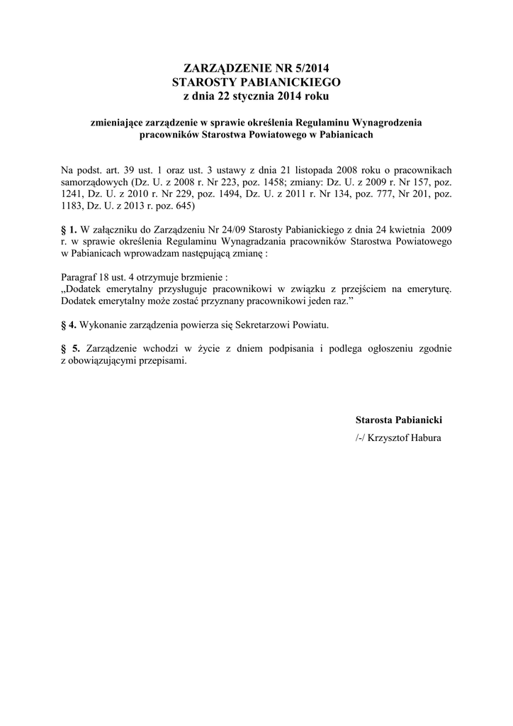 ZARZĄDZENIE NR 5/2014 STAROSTY PABIANICKIEGO z dnia 22 stycznia 2014 roku zmieniające zarządzenie w sprawie określenia Regulaminu Wynagrodzenia pracowników Starostwa Powiatowego w Pabianicach Na podst. art. 39 ust. 1 oraz ust. 3 ustawy z dnia 21 listopada 2008 roku o pracownikach samorządowych (Dz. U. z 2008 r. Nr 223, poz. 1458; zmiany: Dz. U. z 2009 r. Nr 157, poz. 1241, Dz. U. z 2010 r. Nr 229, poz. 1494, Dz. U. z 2011 r. Nr 134, poz. 777, Nr 201, poz. 1183, Dz. U. z 2013 r. poz. 645) § 1. W załączniku do Zarządzeniu Nr 24/09 Starosty Pabianickiego z dnia 24 kwietnia 2009 r. w sprawie określenia Regulaminu Wynagradzania pracowników Starostwa Powiatowego w Pabianicach wprowadzam następującą zmianę : Paragraf 18 ust. 4 otrzymuje brzmienie : „Dodatek emerytalny przysługuje pracownikowi w związku z przejściem na emeryturę. Dodatek emerytalny może zostać przyznany pracownikowi jeden raz.” § 4. Wykonanie zarządzenia powierza się Sekretarzowi Powiatu. § 5. Zarządzenie wchodzi w życie z dniem podpisania i podlega ogłoszeniu zgodnie z obowiązującymi przepisami. Starosta Pabianicki /-/ Krzysztof Habura