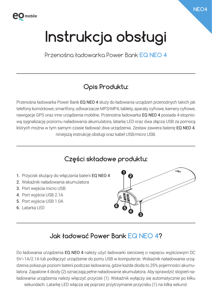 NEO4 Instrukcja obsługi Przenośna ładowarka Power Bank EQ NEO 4 Opis Produktu: Przenośna ładowarka Power Bank EQ NEO 4 służy do ładowania urządzeń przenośnych takich jak telefony komórkowe, smartfony, odtwarzacze MP3/MP4, tablety, aparaty cyfrowe, kamery cyfrowe, nawigacje GPS oraz inne urządzenia mobilne. Przenośna ładowarka EQ NEO 4 posiada 4-stopniową sygnalizację poziomu naładowania akumulatora, latarkę LED oraz dwa złącza USB za pomocą których można w tym samym czasie ładować dwa urządzenia. Zestaw zawiera baterię EQ NEO 4, niniejszą instrukcję obsługi oraz kabel USB/micro USB. Części składowe produktu: 1. 2. 3. 4. 5. 6. Przycisk służący do włączania baterii EQ NEO 4 Wskaźnik naładowania akumulatora Port wejścia micro USB Port wyjścia USB 2.1A Port wyjścia USB 1.0A Latarka LED Jak ładować Power Bank EQ NEO 4? Do ładowania urządzenia EQ NEO 4 należy użyć ładowarki sieciowej o napięciu wyjściowym DC 5V~1A/2.1A lub podłączyć urządzenie do portu USB w komputerze. Wskaźnik naładowania urządzenia pokazuje poziom baterii podczas ładowania, gdzie każda dioda to 25% pojemności akumulatora. Zapalone 4 diody (2) oznaczają pełne naładowanie akumulatora. Aby sprawdzić stopień naładowania urządzenia należy włączyć przycisk (1). Wskaźnik wyłączy się automatycznie po kilku sekundach. Latarkę LED włącza się poprzez przytrzymanie przycisku (1) na kilka sekund. NEO4 Jak ładować urządzenia mobilne za pomocą Power Bank EQ NEO 4? W celu rozpoczęcia ładowania urządzenia mobilnego (telefon/tablet itp.) należy podpiąć kabel USB do złącza USB 1.0A (5) lub złącza USB 2.1A (4) w urządzeniu EQ NEO 4, a drugą końcówkę kabla USB należy podpiąć do urządzenia mobilnego. Podczas podłączenia zapali się wskaźnik naładowania akumulatora (2) i rozpocznie się proces ładowania. Po zakończeniu ładowania wskaźnik naładowania akumulatora (2) automatycznie się wyłączy. Będzie to oznaczało że urządzenie mobilne zostało w pełni naładowane. Specyfikacja: Executive standard: GB4943-2011 Model: EQ NEO 4 Pojemność: 15600mAh Napięcie wejściowe: 5V - 1A/5V – 2A Napięcie wyjściowe: 5V - 1A/5V – 2.1A Wymiary: 153 x 58.5 x 26.48 mm Waga: 335 g Czas do pełnego naładowania: około 12 godzin Nazwa oraz zawartość pierwiastków lub substancji trujących i szkodliwych: Model: Pb Hg Cd Cr Vi PBBs PBDEs EQ NEO 4 X O O O O O X : wskazuje przekroczenie limitów zawartości substancji trujących i szkodliwych O : wskazuje substancje trujące i szkodliwe w granicach limitów Środki ostrożności i zalecenia: Prosimy o szczegółowe zapoznanie się z instrukcją obsługi przed rozpoczęciem użytkowania produktu Power Bank EQ NEO 4. Niezastosowanie się do instrukcji oraz użycie produktu niezgodnie z jego przeznaczeniem może uszkodzić produkt. W szczególności zaleca się: • Nie używać ostrych narzędzi do zarysowania powierzchni produktu, • Nie narażać urządzenia na silne wstrząsy, które mogą uszkodzić produkt, • Nie rozkręcać oraz nie demontować urządzenia, NEO4 • Nie zanurzać urządzenia w wodzie oraz nie wkładać do ognia, • Unikać przechowywania w wysokich oraz niskich temperaturach, • Unikać przegrzania przez inne gorące przedmioty oraz bezpośrednie wystawienie na promienie słoneczne, • Power Bank EQ NEO 2 nie jest zabawką. Chronić przed dziećmi, • Nie należy używać detergentów do czyszczenia urządzenia, • Zawsze utrzymywać przynajmniej minimalny poziom naładowania urządzenia, • Ładować produkt co najmniej raz na trzy miesiące w celu zachowania maksymalnej wydajności urządzenia. Dystrybutor nie przyjmuje odpowiedzialności za szkody oraz za skrócenie żywotności produktu powstałe w wyniku jego złego użytkowania. Utylizacja: • Elektroniczne urządzenia mogą być poddane recyklingowi i nie należą do odpadów z gospodarstw domowych, • Produkt należy utylizować po zakończeniu jego eksploatacji zgodnie z obowiązującymi przepisami prawnymi, • Przed wyrzuceniem należy zgłosić się do fachowca w celu wyjęcia akumlatora. Gwarancja: Dystrybutor udziela gwarancji na okres 12 miesięcy od daty zakupu przez konsumenta. Warunki gwarancji dostępne są na stronie dystrybutora www.eqmobile.pl. Standard: GB4943-2011 Made in China